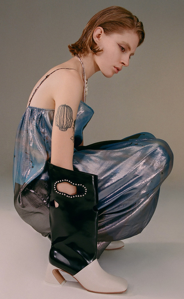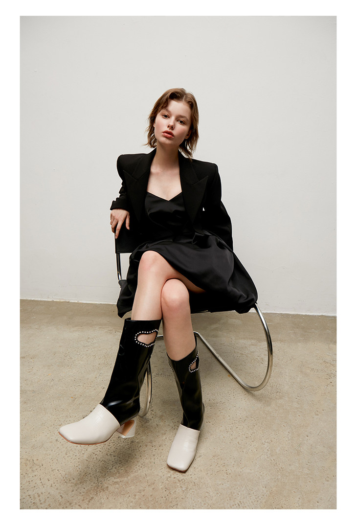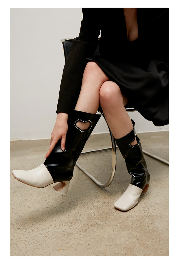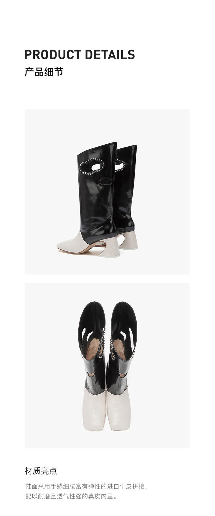 lost in echo设计师品牌钻饰镂空直筒方头中筒靴