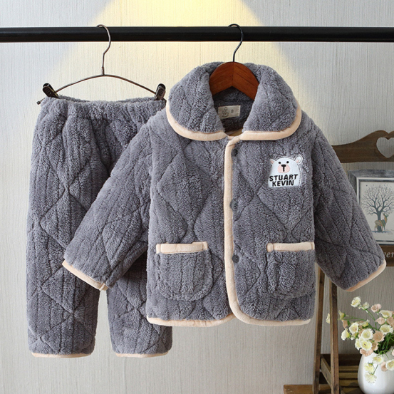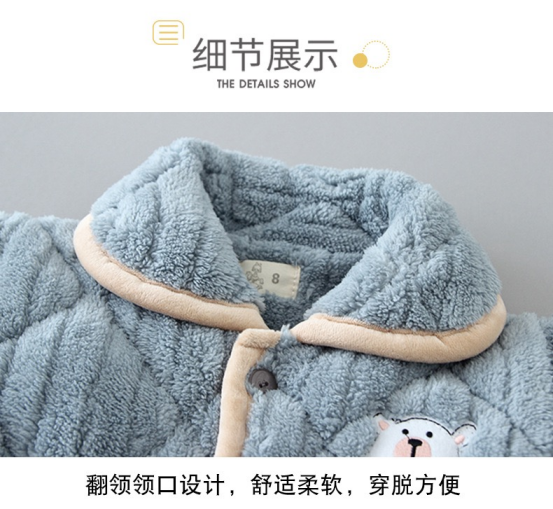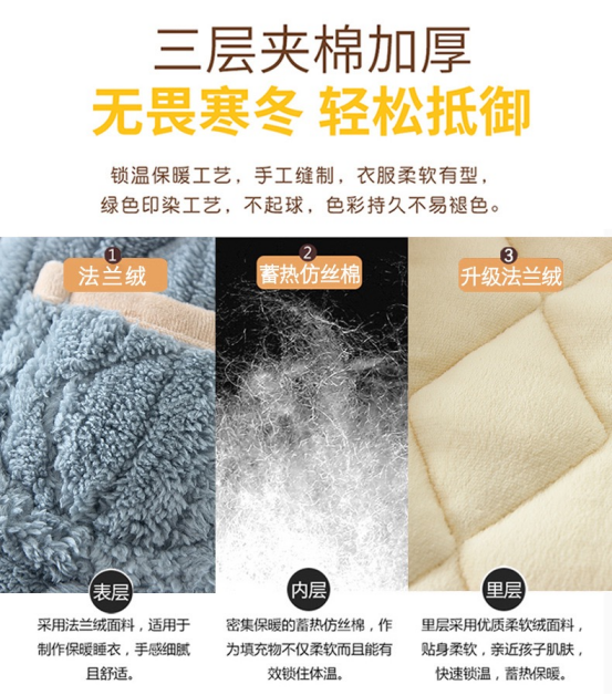 给宝宝买好看的秋装的同时睡衣也要记得给宝宝换厚的哦推荐给大家这款儿童家居服深冬加厚型,上身更舒服 ~ 宽松的版型藏肉显瘦,不显臃肿有点肉肉的宝贝也能穿活动自如,随性自在 用料真的是肉眼可见的厚重!不易褪色,起球,随随便便穿几年完全没问题