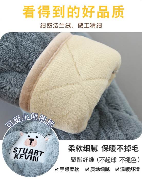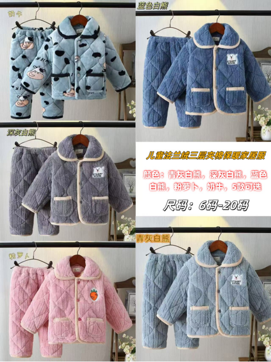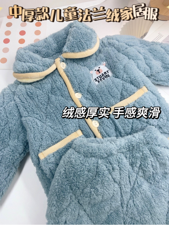 中厚款儿童法兰绒家居服,绒感厚实。手感很爽滑的那种。 款式又比较卡通可爱。居家外穿都可以的