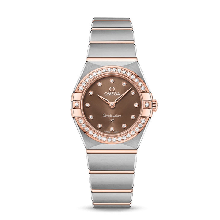 镜面材质 | 蓝宝石水晶玻璃 | 表盘 | 经典的半月形切面、“托爪”以及mono-rang表链。 Sedna® 18K金与精钢打造,表圈铺镶钻石,棕色太阳纹饰表盘饰有钻石小时刻度,覆以耐磨损蓝宝石玻璃表镜。指针、欧米茄品牌标识、星座徽标以及钻石托槽亦以Sedna® 18K金打造而成。 密底,表背印有星座天文台徽章。 |