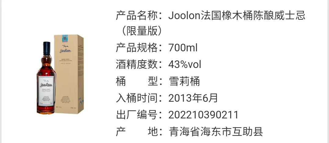 Joolon法国橡木桶陈酿威士忌(限量版)中国威士忌