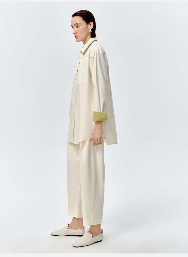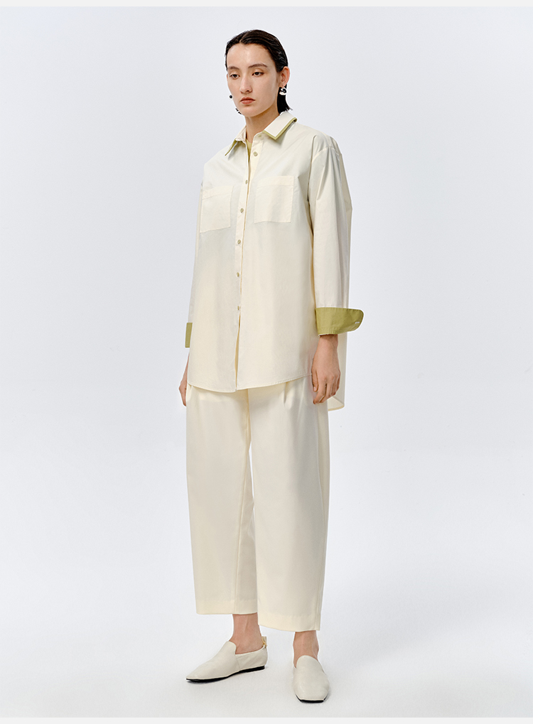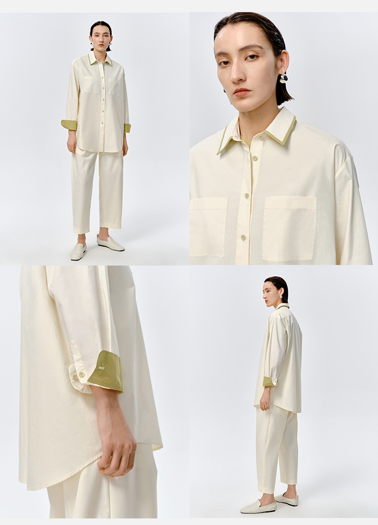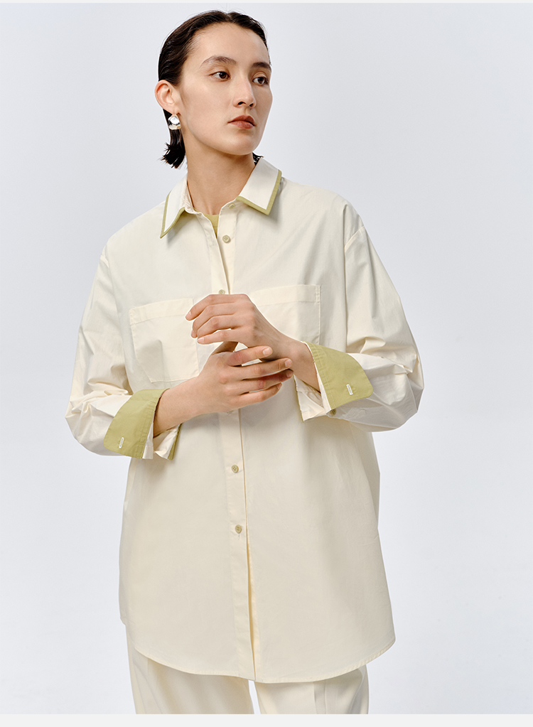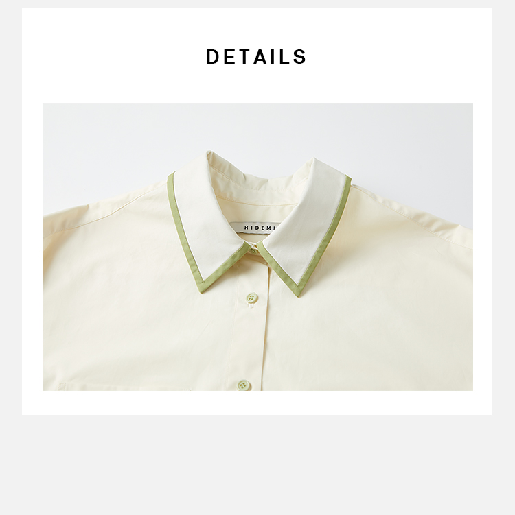 HIDEMI极简设计感白色牛油果绿镶嵌拼色款口袋廓形衬衫