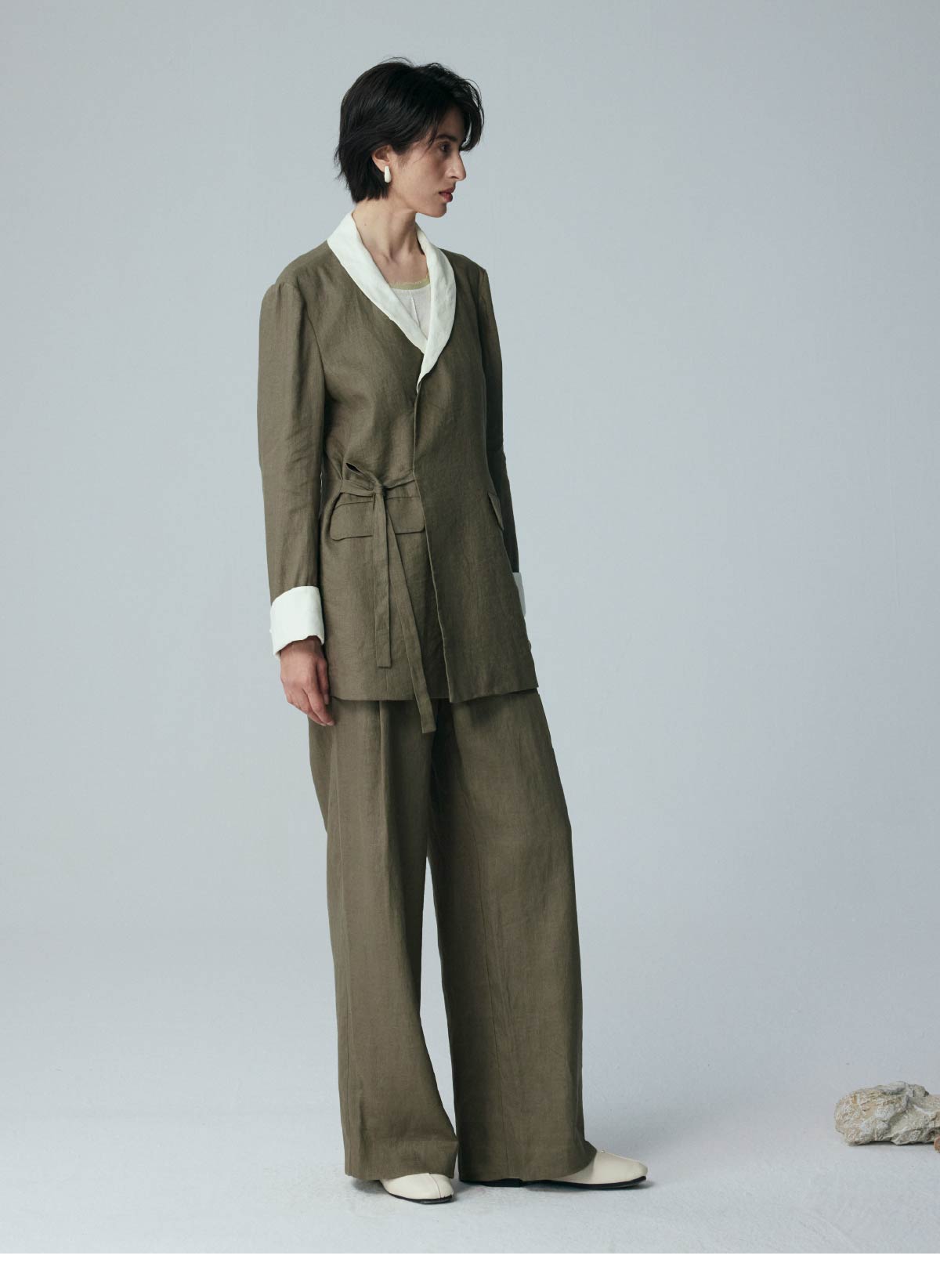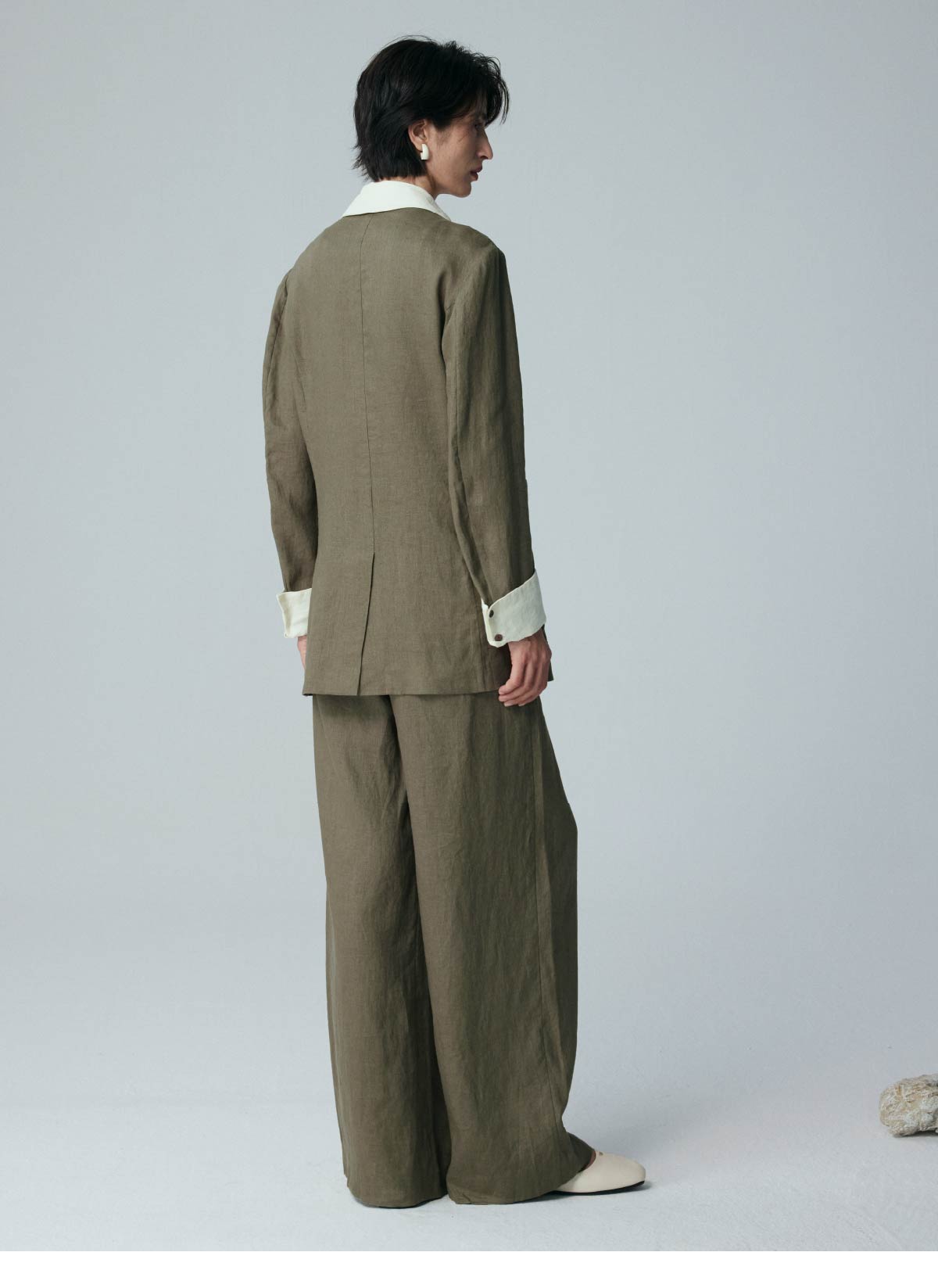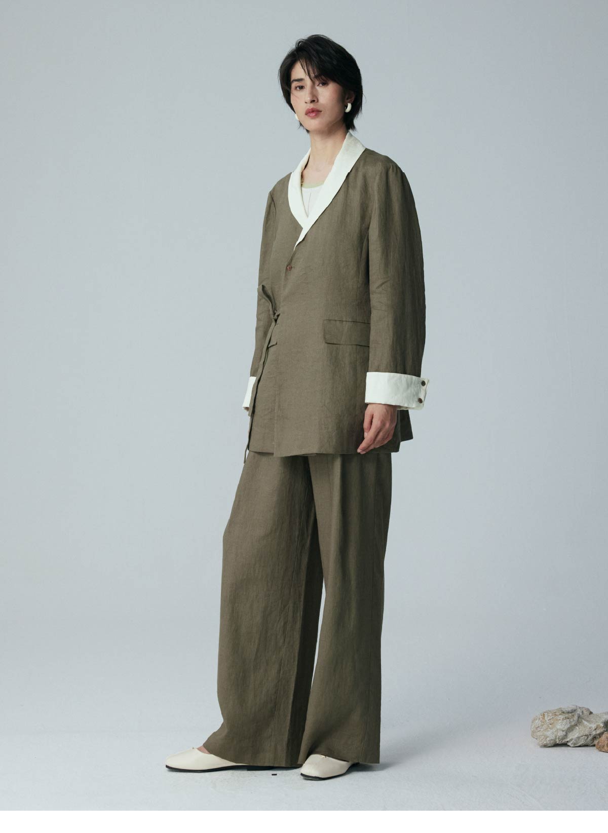 LIYIHAN 2026夏季新款通勤女西装绿色上衣亚麻外套套装小众设计感