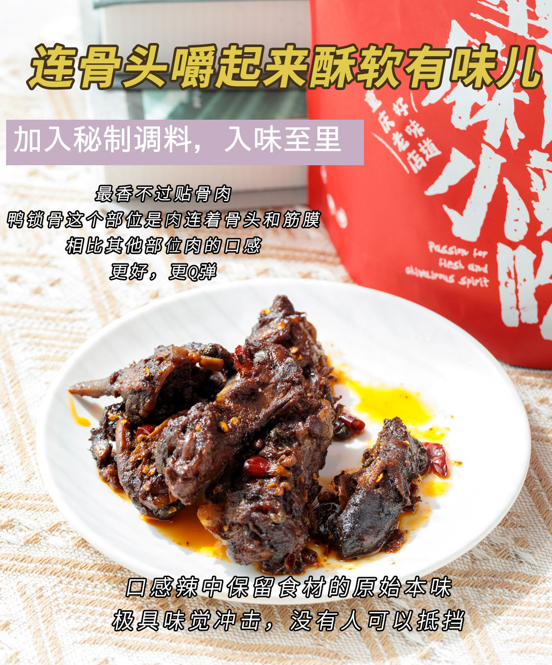 最香不过贴骨肉,鸭锁骨这个部位是肉连着骨头和筋膜 ;相比其他部位肉的口感会更好,更Q弹。