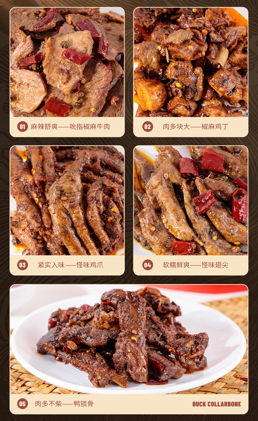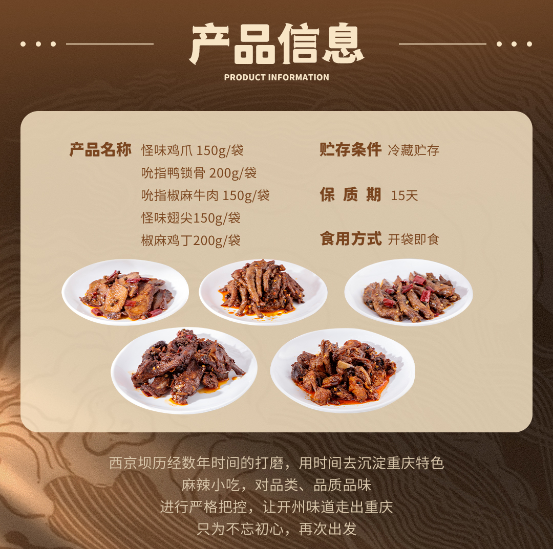 怪味鸡爪150g/袋 、吮指鸭锁骨200g/袋 、吮指椒麻牛肉150g/袋 、怪味翅尖150g/袋 、椒麻鸡丁200g/袋 、椒麻鸭头2个/袋、农家豆干200g/袋(麻辣)、孜然豆干200g/袋、椒香豆干200g/袋(微辣)
