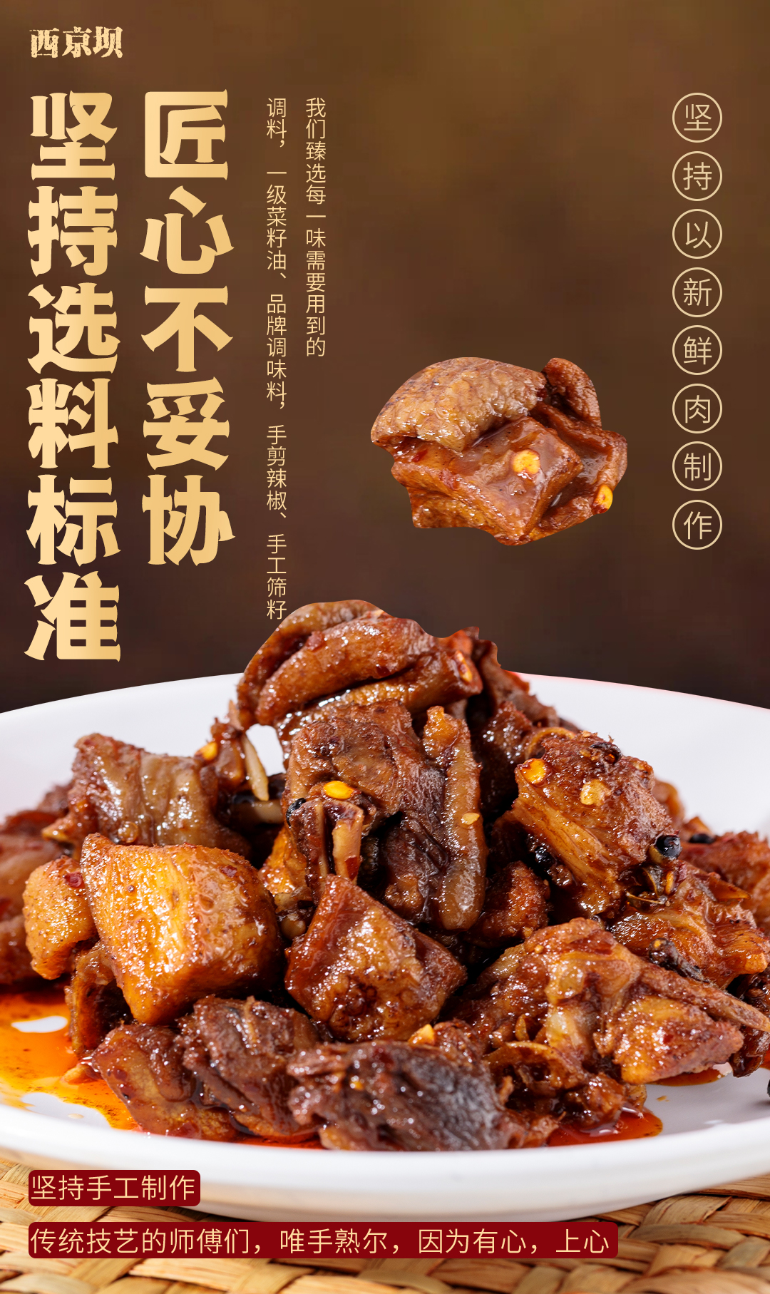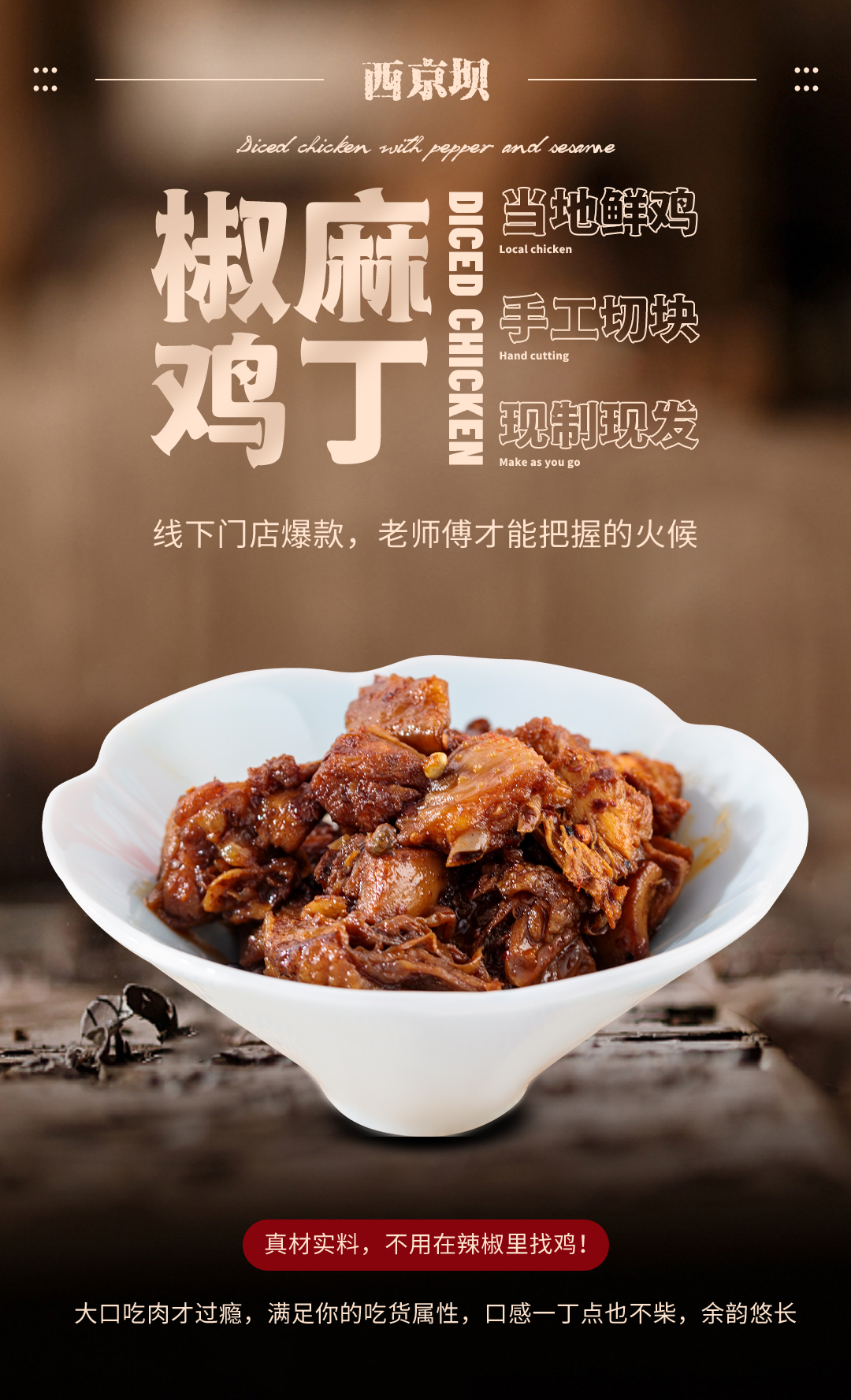 线下门店爆款,老师傅才能把握的火候只选当地鲜鸡,手工切块现制现发,天然健康;腌制、浆肉、过油、炒制多道工序 重点是吃得出鸡味, 这在麻辣小吃产品里很难得。
