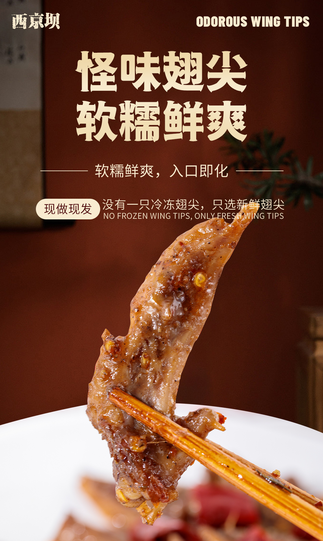常年稳居出镜率前三的翅尖,西京坝翅尖特有的鲜辣味道是一般卤味比不了的,绝对的味蕾轰炸机。吃起来就像用麻辣把你的舌头彻底犁过一遍,与怪味鸡爪同配方的线下爆款单品软糯鲜爽,入口即化,抓起来一个接一个的往嘴里送, 好吃到吐骨头都来不及那种哦。