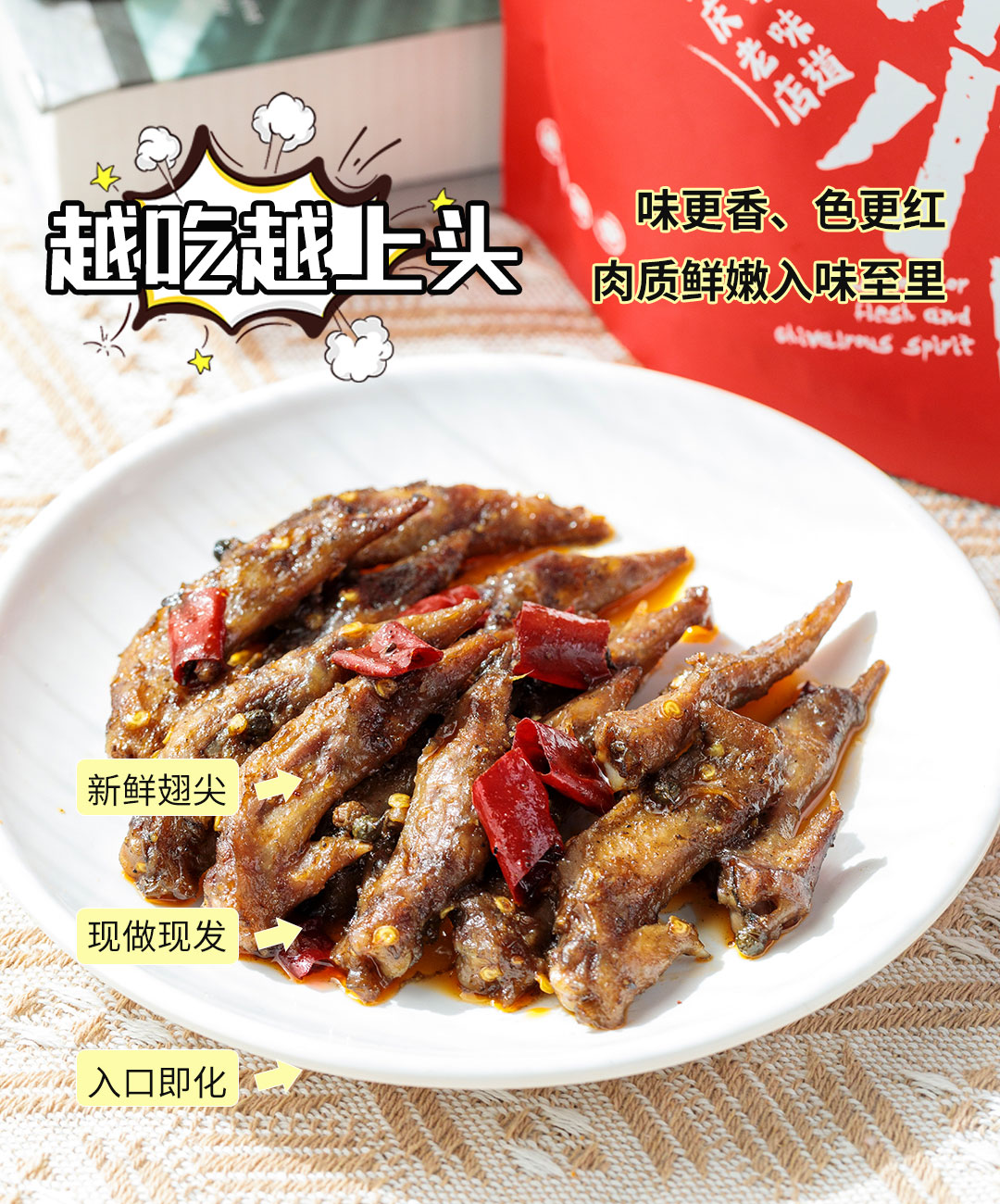 没有一只冷冻翅尖,只选新鲜翅尖。接单当天新鲜现做,当天做当天发,保证吃到的每一口都是新鲜麻辣味。