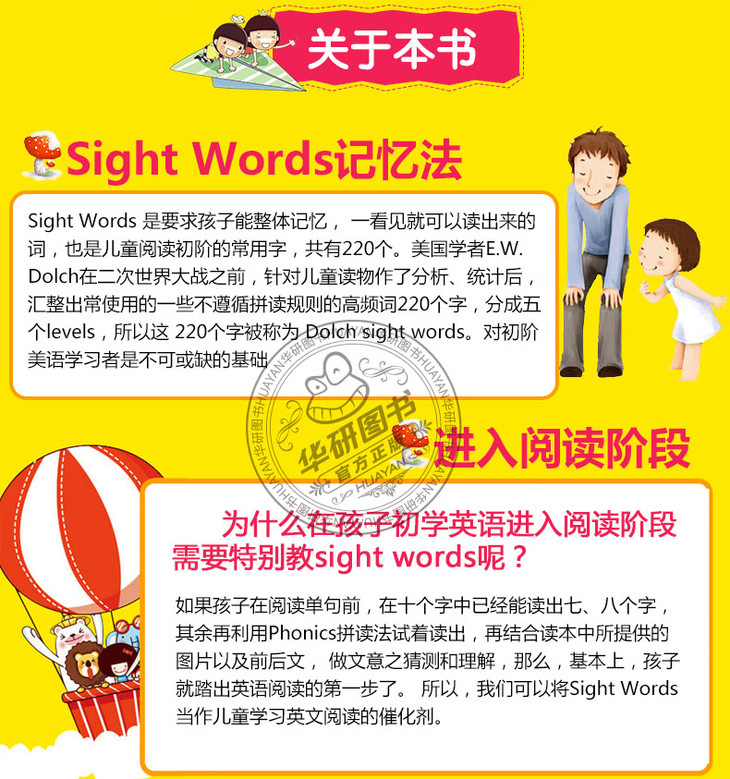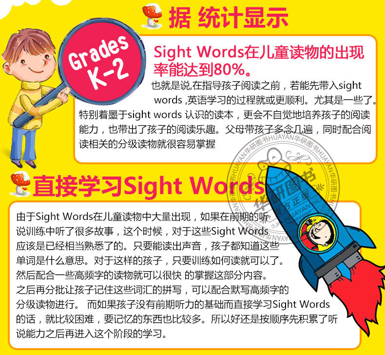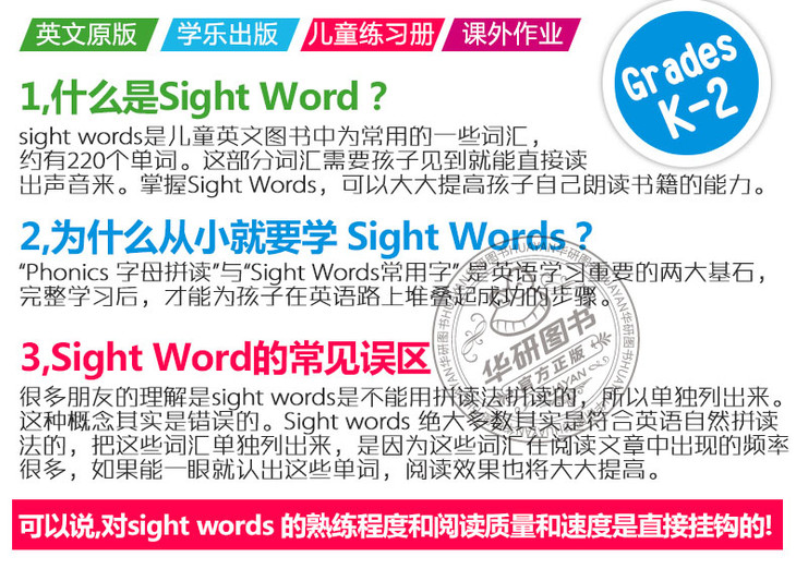 Sight Words是一些不遵循拼读规则的高频词,要求孩子能整体记忆,即一看见就可以读出来的词。据统计,Sight Words在儿童读物的出现率达50%到80%的比例,对孩子学习英文阅读起着非常重要的作用。也就是说,在指导孩子阅读之前,若能先掌握Sight Words,英语学习的过程就会更加顺利。