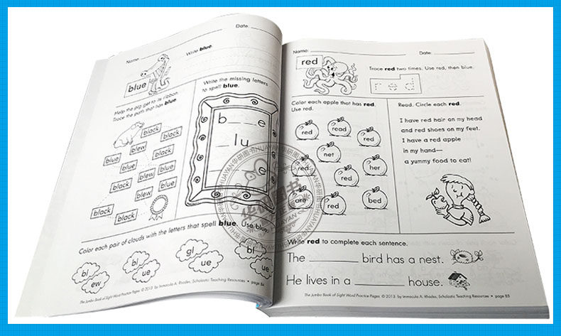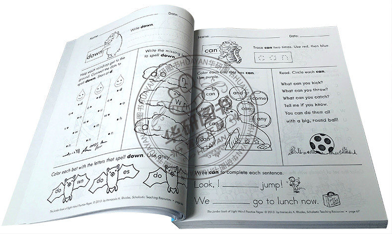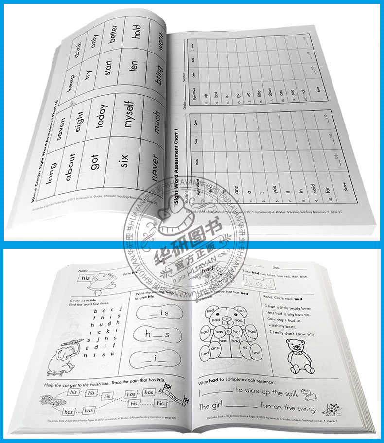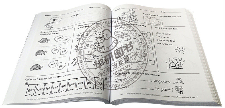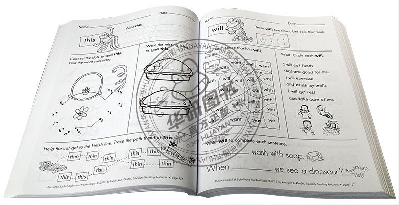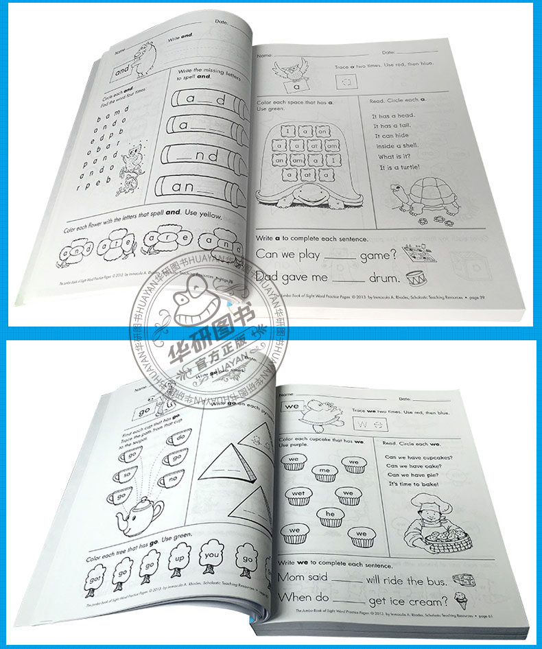 The Jumbo Book of Sight Word Practice Pages收录了常用的200个常见高频词,每个常见词都有两页的相应的多项练习,包含涂色、单词迷宫、连点成线游戏、词汇匹对及填词完成句子等,让孩子们以有趣好玩的方式中轻松学得高频词的正确使用方法。
