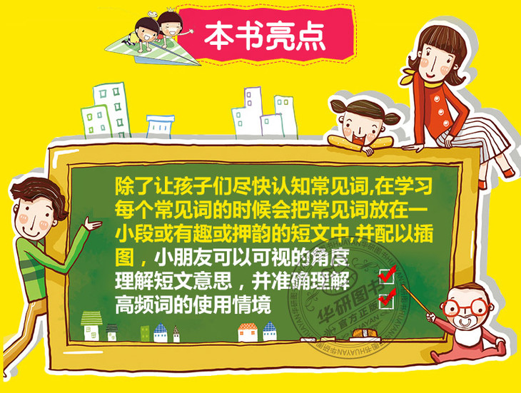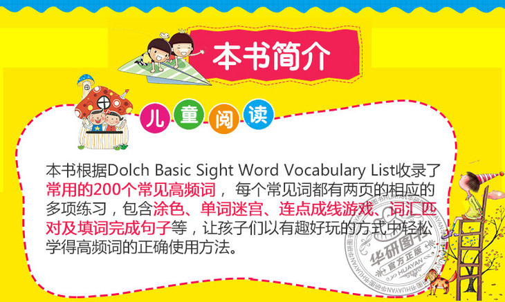 本书不同于其他高频词练习册的一点是:除了让孩子们尽快认知常见词,在学习每个常见词的时候,会把常见词放在一小段或有趣或押韵的短文中,并配以插图,小朋友可以可视的角度理解短文意思,并准确习得改高频词的使用情境。