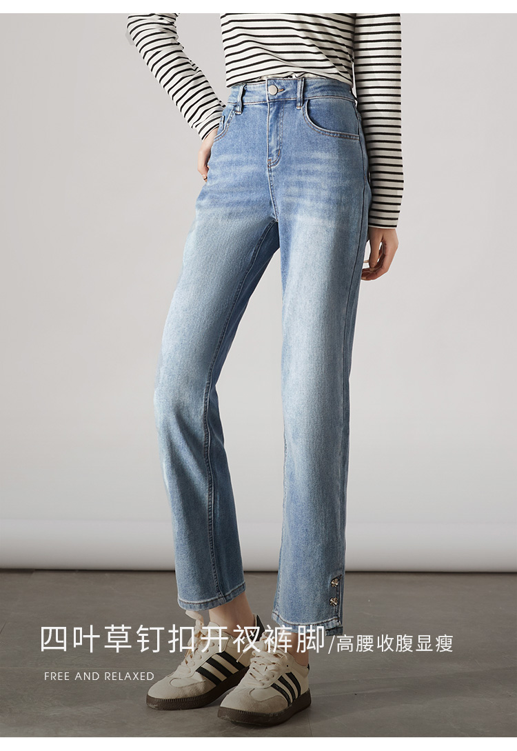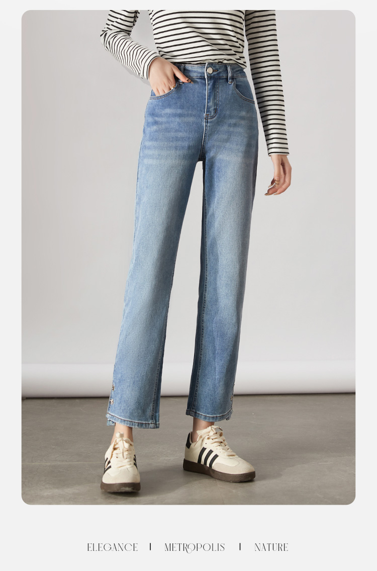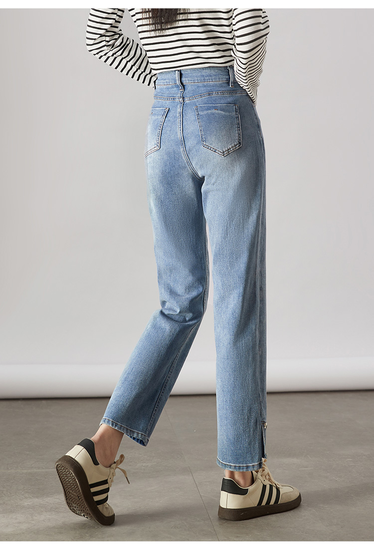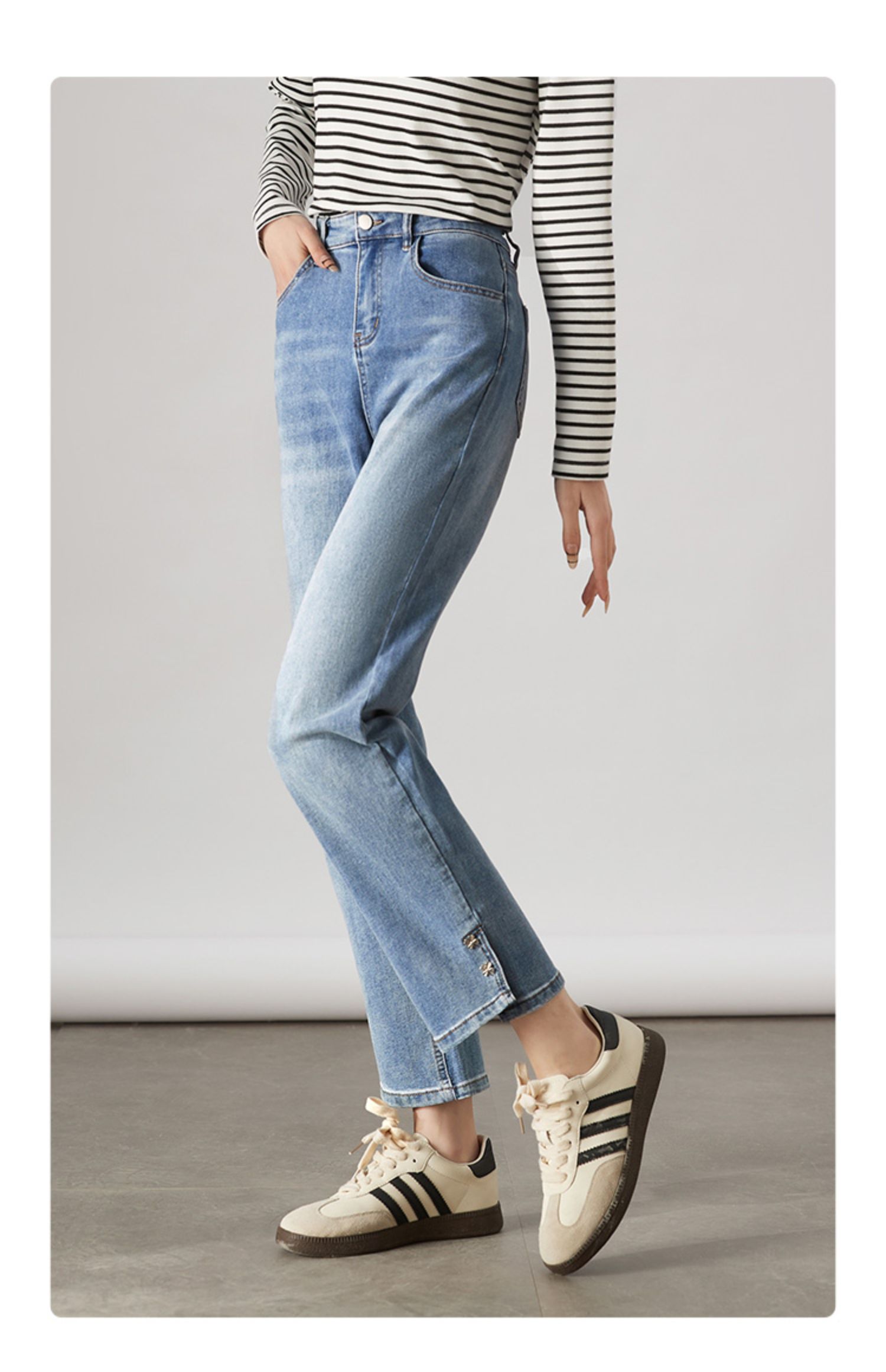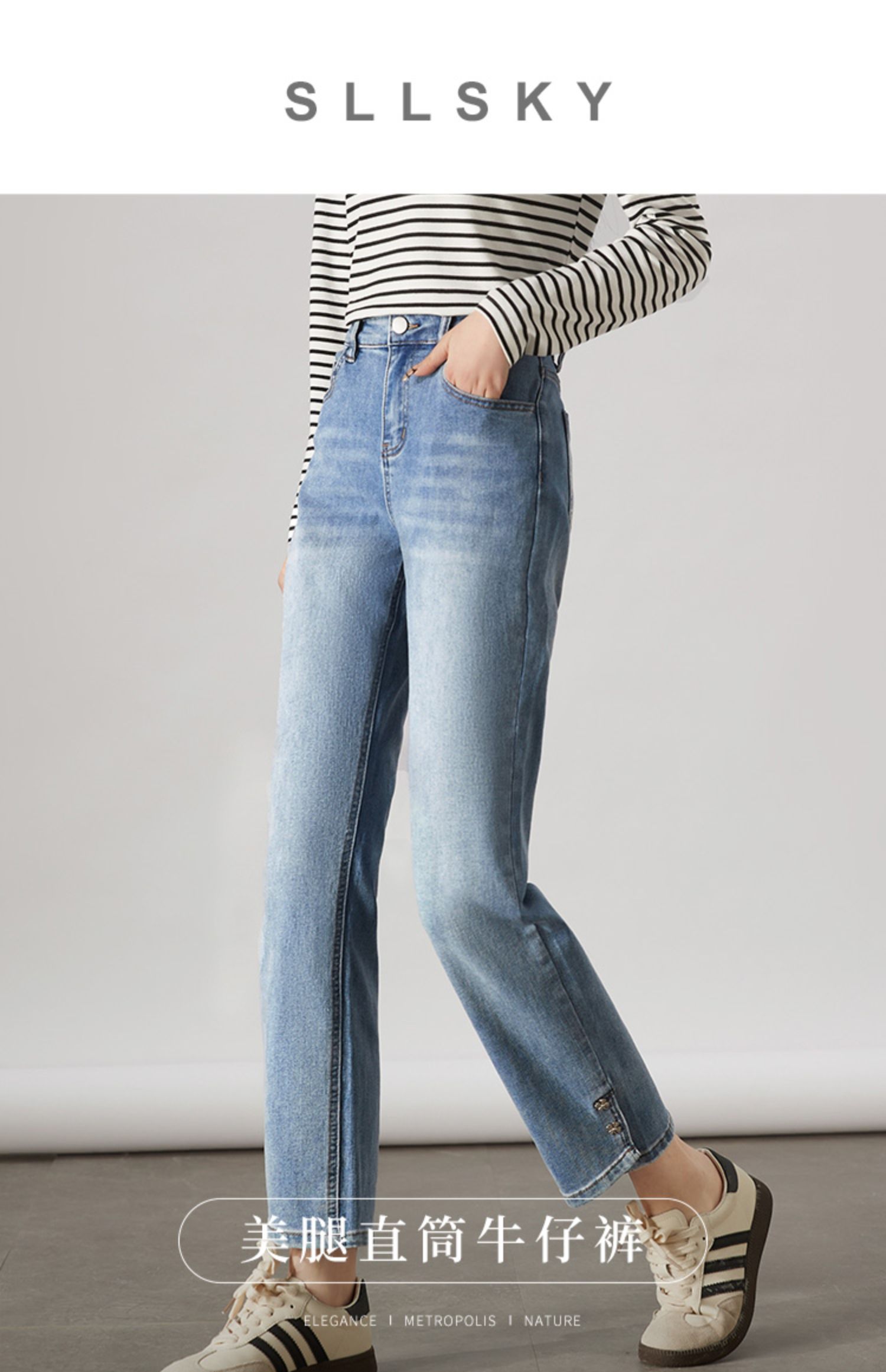 【开门红】熙世界浅蓝色牛仔裤女2025年秋季新款高腰设计感开叉烟管直筒裤子