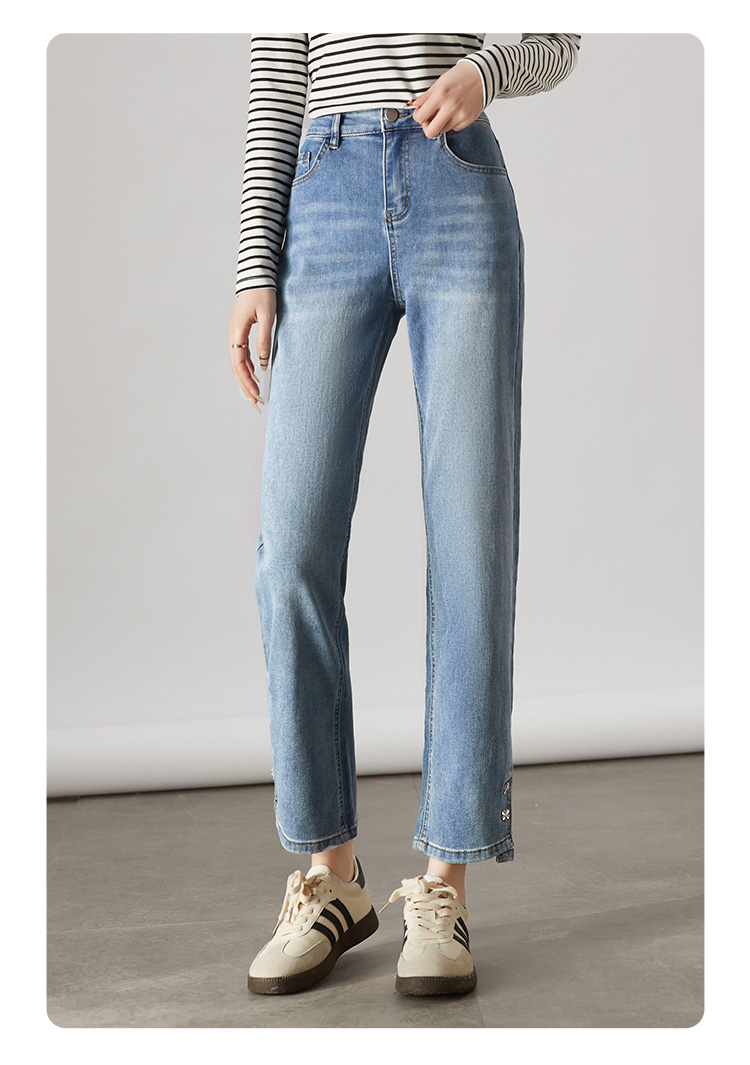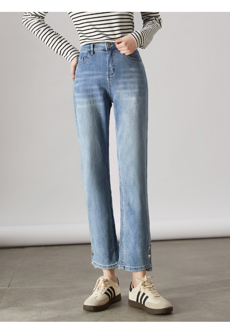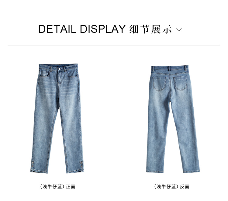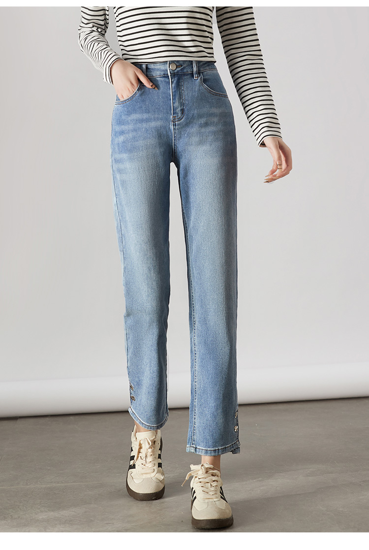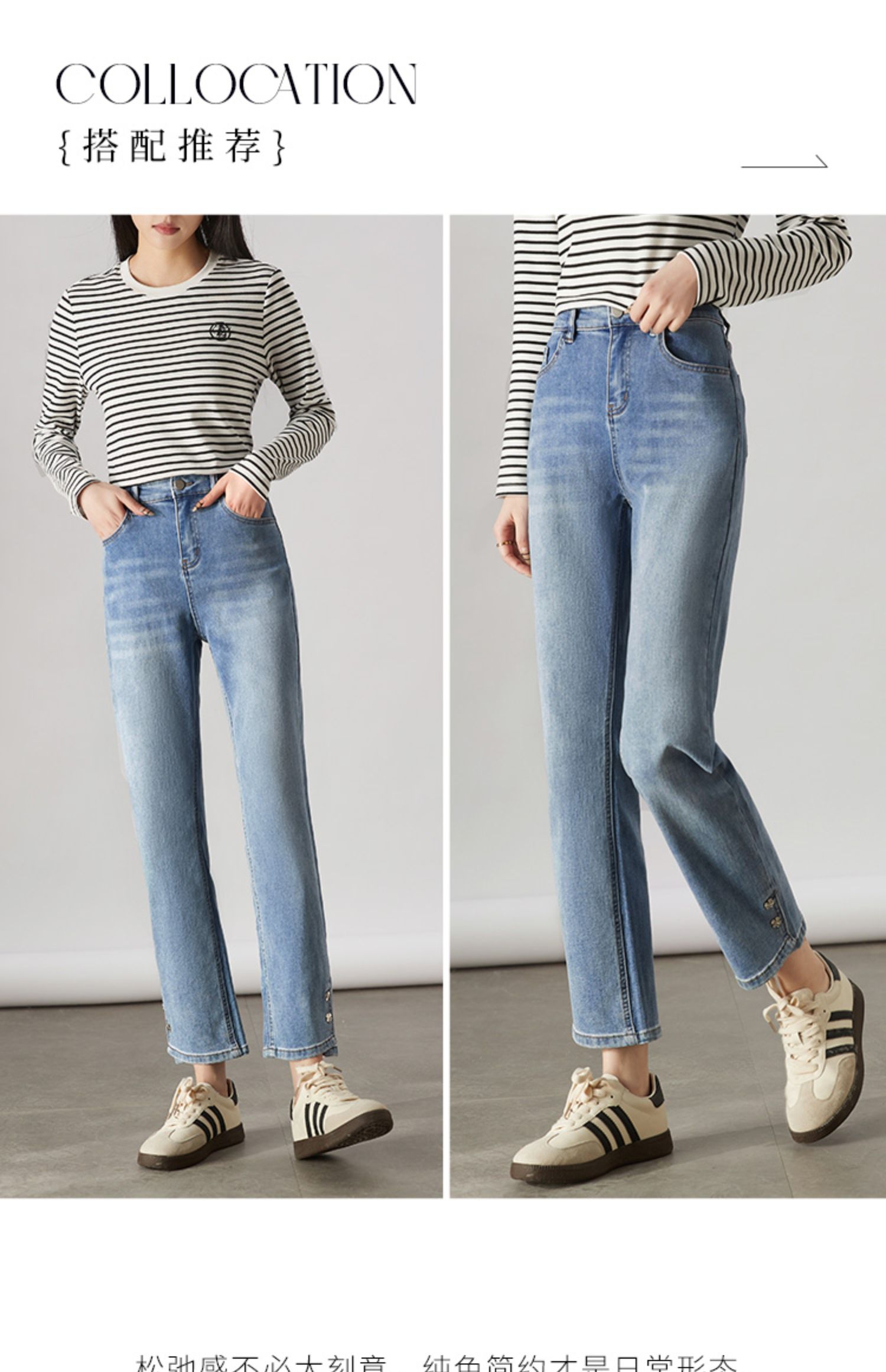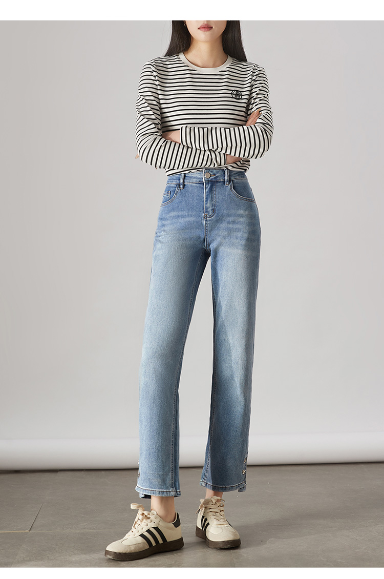 【开门红】熙世界浅蓝色牛仔裤女2025年秋季新款高腰设计感开叉烟管直筒裤子