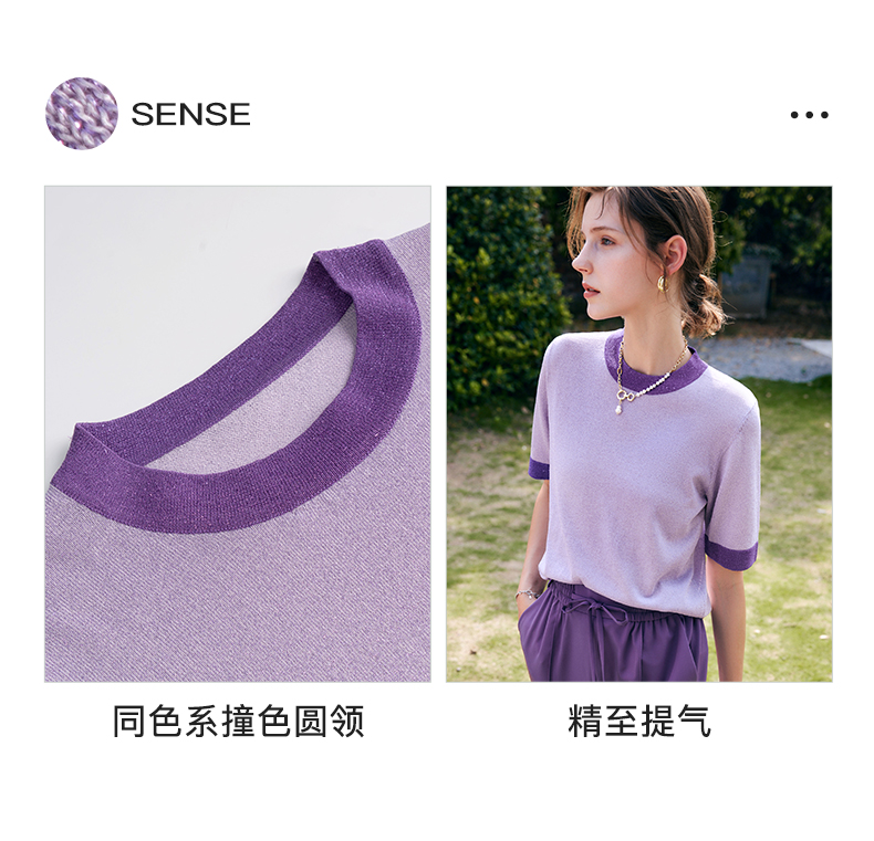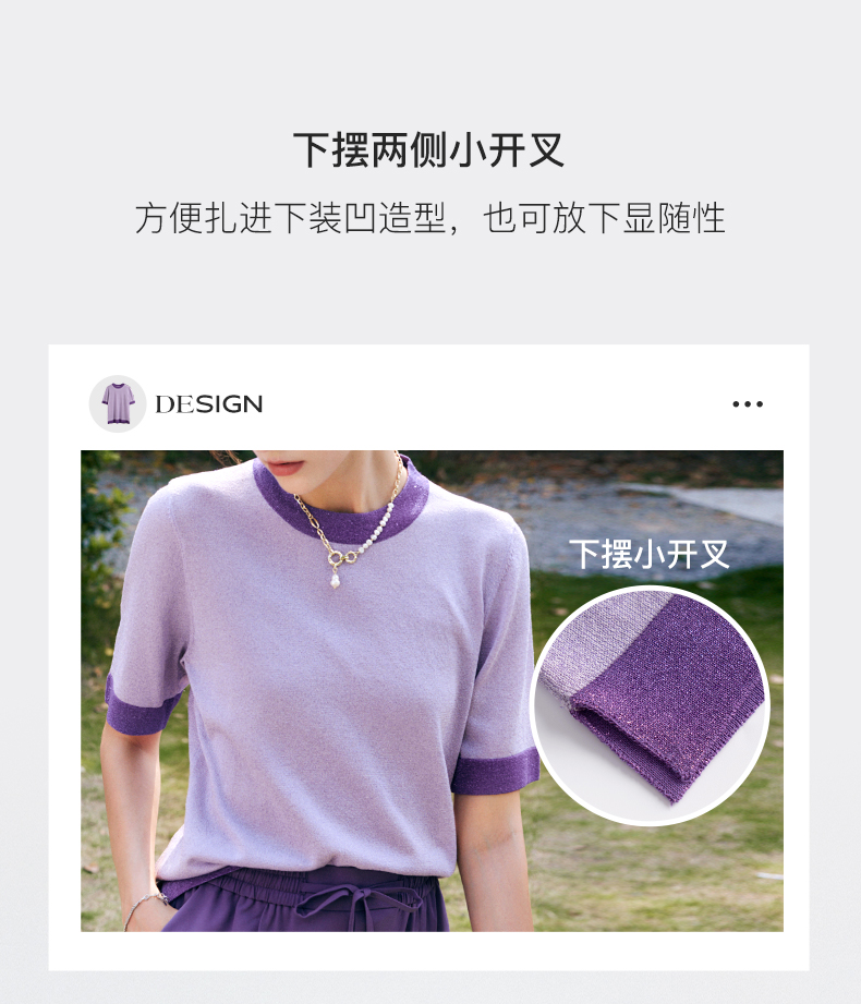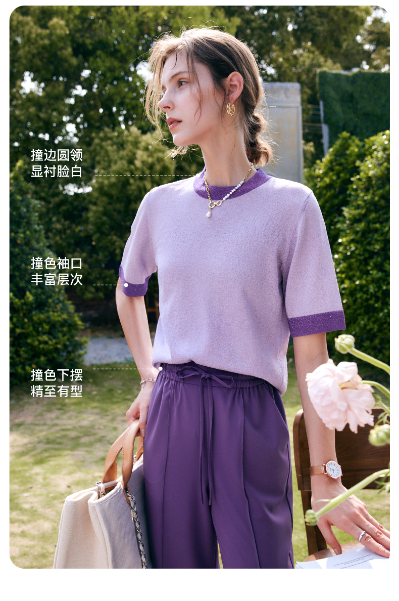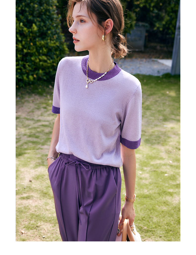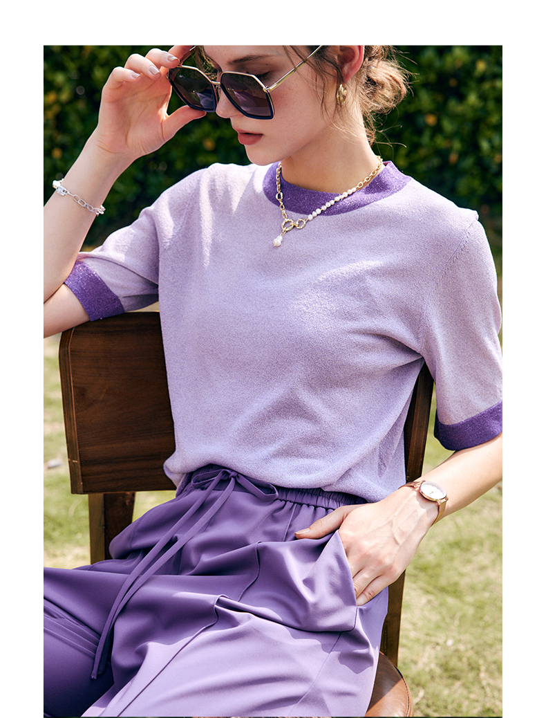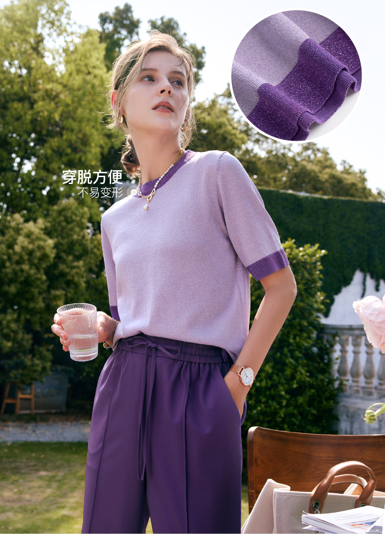 欧芮儿OLrain法式高级紫色针织衫女夏季2024短袖高端冰丝薄款上衣