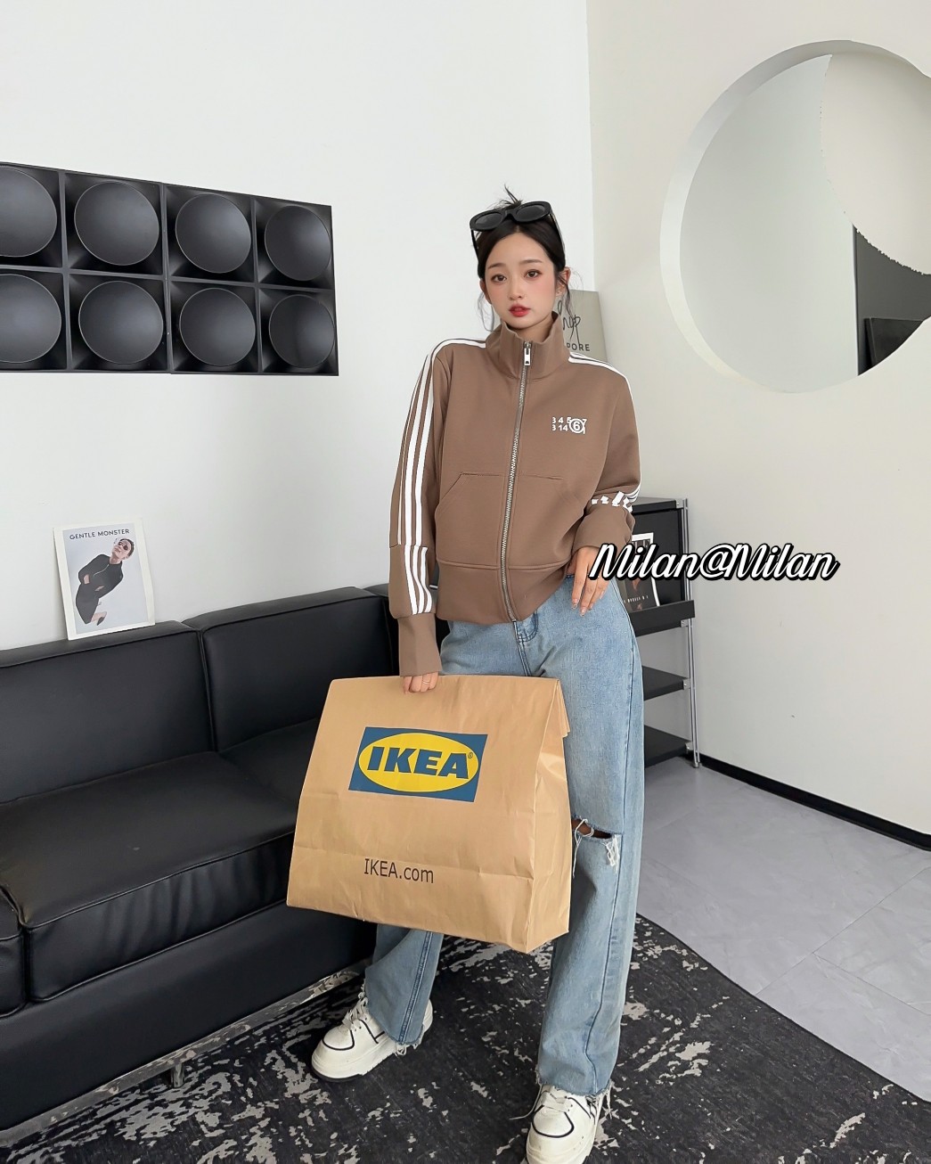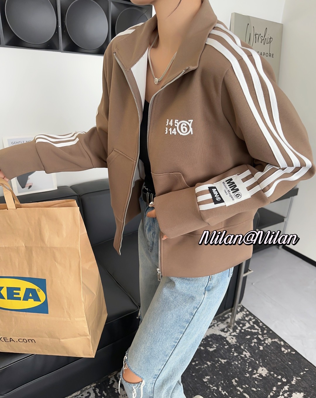 66711 # 浅咖 均码 新款长袖立领开衫卫衣外套 拼接条纹字母印花百搭休闲
