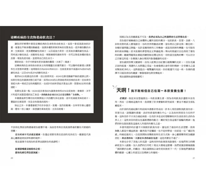 在這一場醫生說救不了,她卻活下來的祕密中,作者克莉絲利用親身經驗和邀請專家解說,分享了有病救命、無病養生的「逆轉疾病的全食物救命飲食」。最不可思議的是,原本只為了抗癌的她,竟然連痘痘、過敏、皮膚乾燥、濕疹、便祕、腹痛、胃酸逆流、胸腔感染、憂鬱、慢性疲勞……全身上下大大小小的毛病都得到有效的改善。