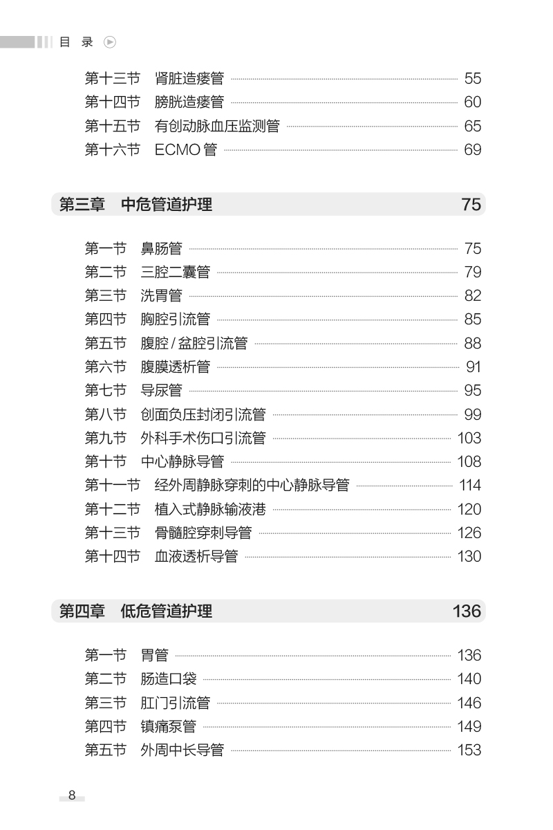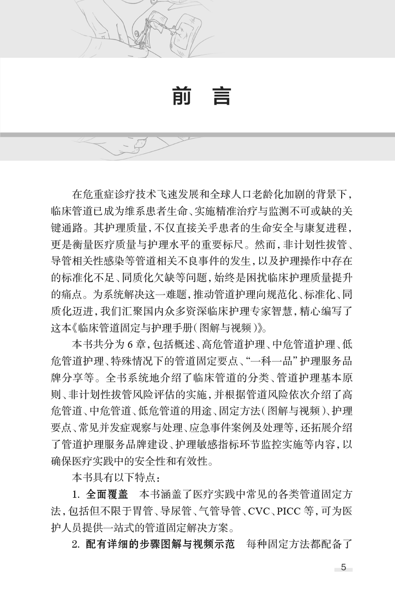 本书旨在为医护人员及相关专业学生提供全面、实用、易于理解的管道固定技术和护理知识。 全书共分为6章,包括概述、高危管道护理、中危管道护理、低危管道护理、特殊人群管道护理、护理服务品牌建设。全书系统地介绍了临床管道的分类、管道护理基本原则、非计划性拔管风险评估的实施,并根据管道风险依次介绍了共高危管道、中危管道、低危管道等近40种临床常用管道的用途、固定方法、护理要点、常见并发症观察及处理、应急事件案例及处理等,以图解+视频形式立体呈现管道固定与护理的具体操作,还针对特殊情况下的管道护理要点进行详解,并拓展介绍了管道护理方面的服务品牌建设、护理敏感指标环节监控实施等内容,以确保医疗实践中的安全性和有效性。