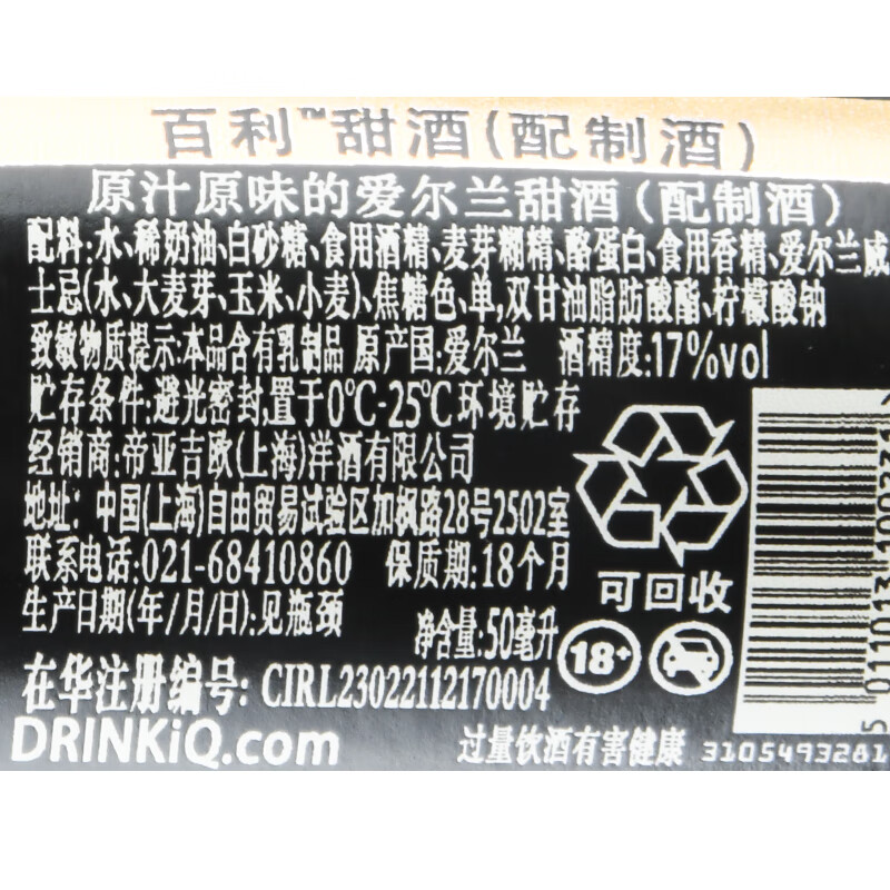 百利甜酒(配制酒) 17%vol 50ml/瓶