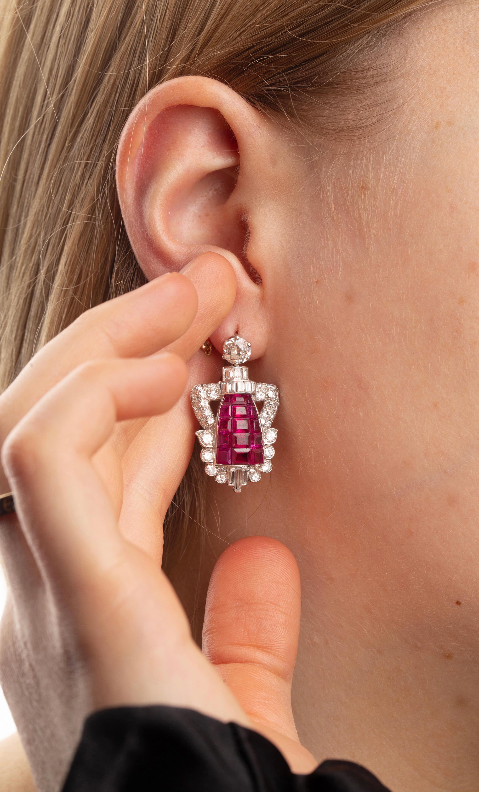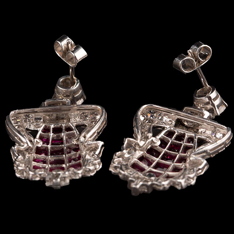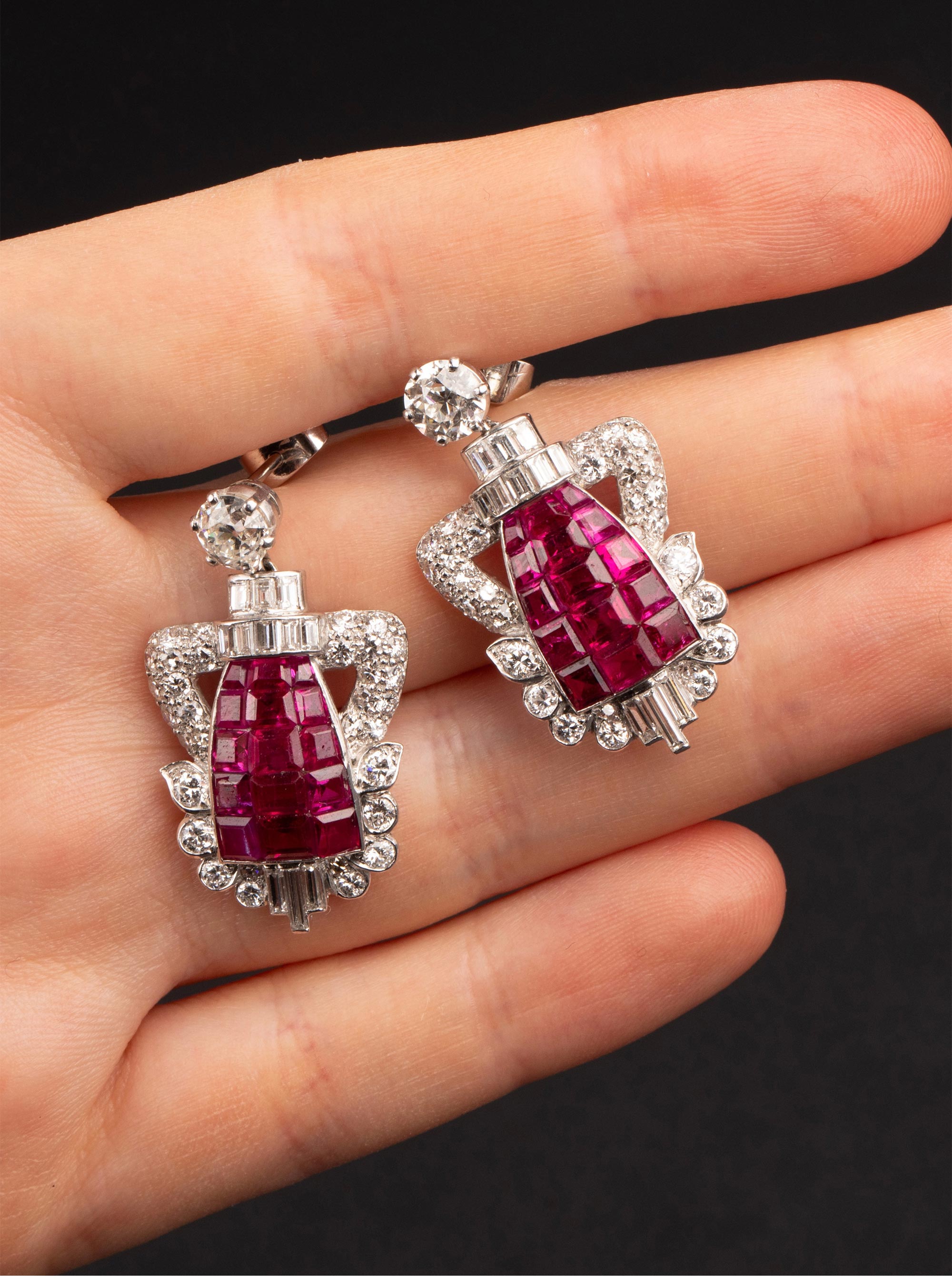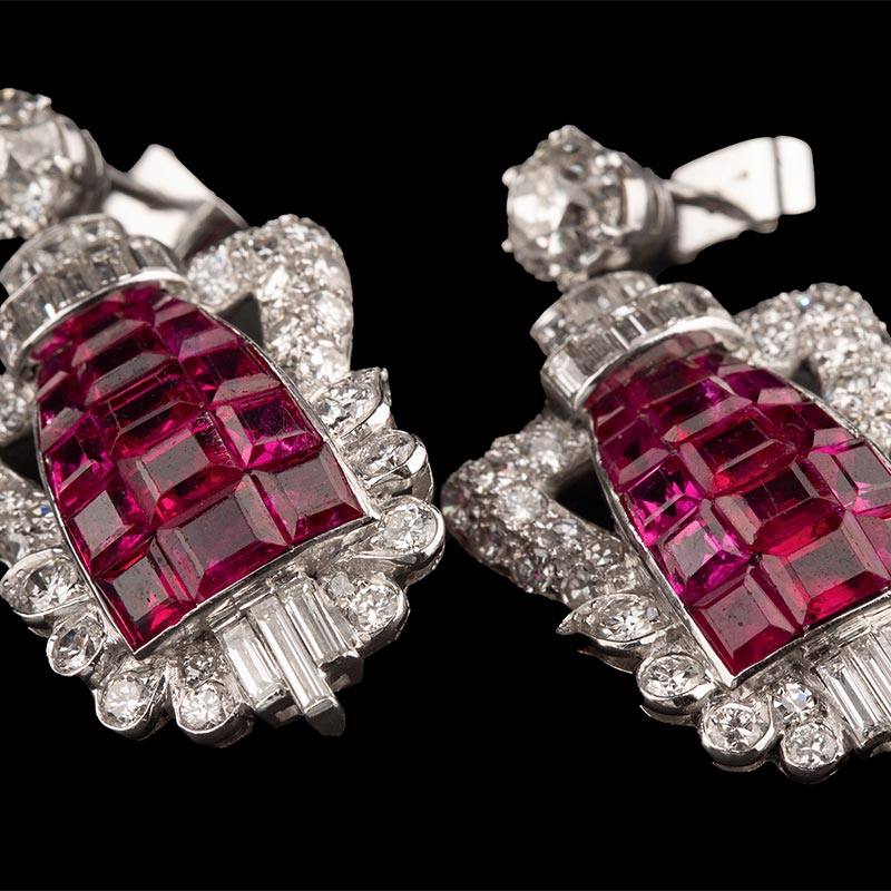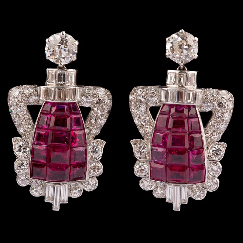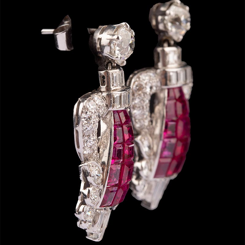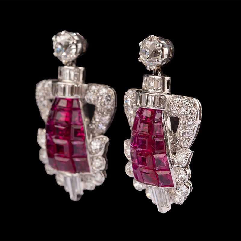 1925年代英国出品装饰艺术风格铂金镶嵌红宝石及钻石耳坠一对