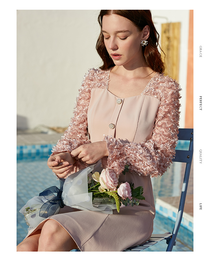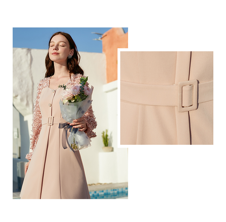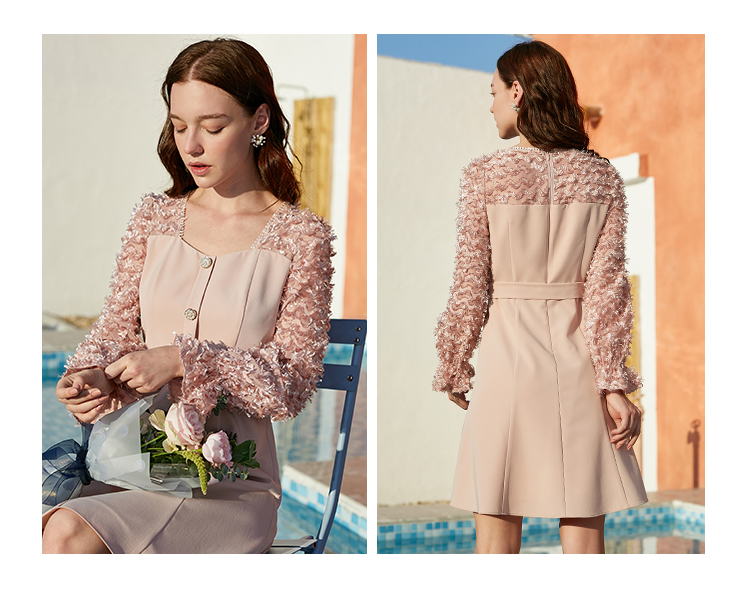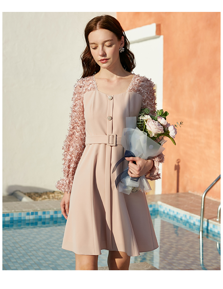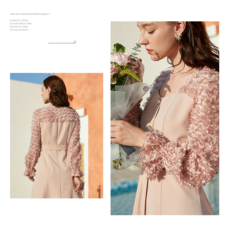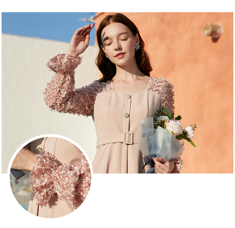 欧芮儿春季新款方领拼接长袖连衣裙女中长款系带收腰a字裙