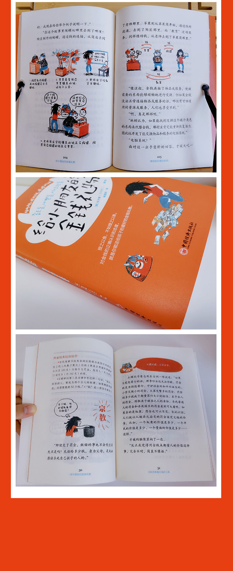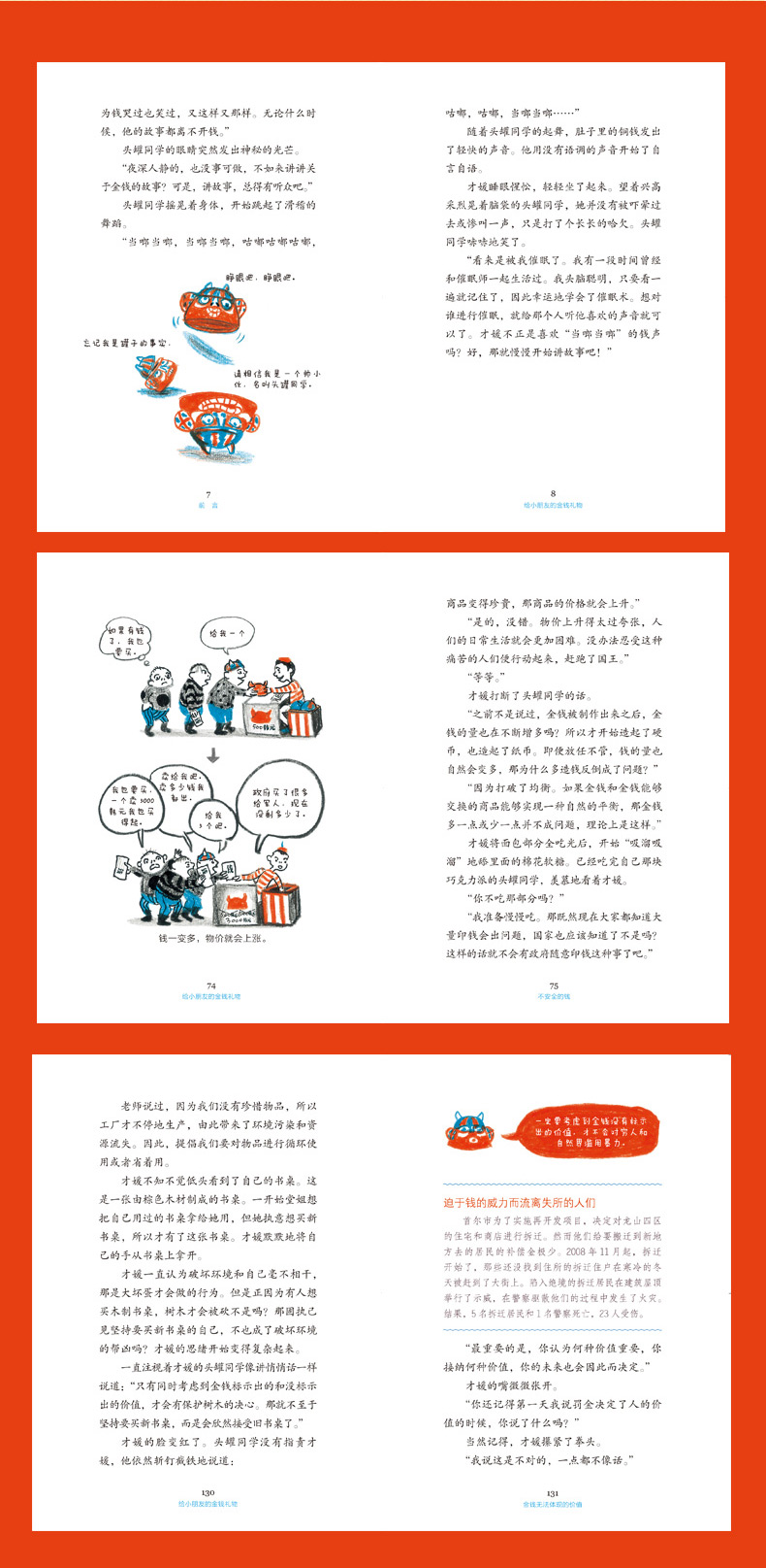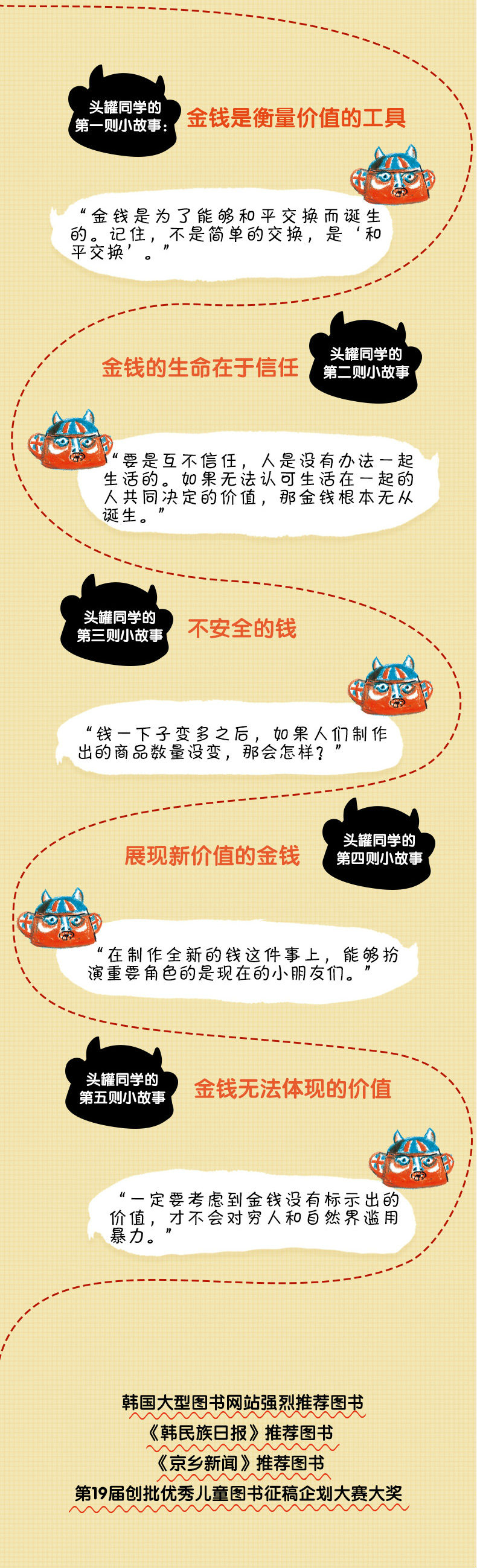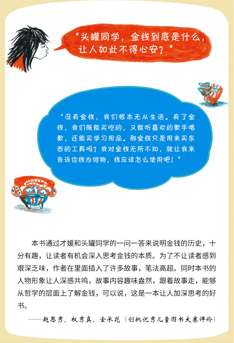 本书通过才媛和头罐同学的一问一答来说明金钱的历史,十分有趣,让读者有机会深入思考金钱的本质。为了不让读者感到艰深乏味,作者在里面插入了许多故事,笔法高超。同时本书的人物形象让人深感共鸣,故事内容趣味盎然,跟着故事走,能够从哲学的层面上了解金钱,可以说,这是一本让人加深思考的好书。——赵恩秀、权秀真、金承花(创批优秀儿童图书大赛评价)