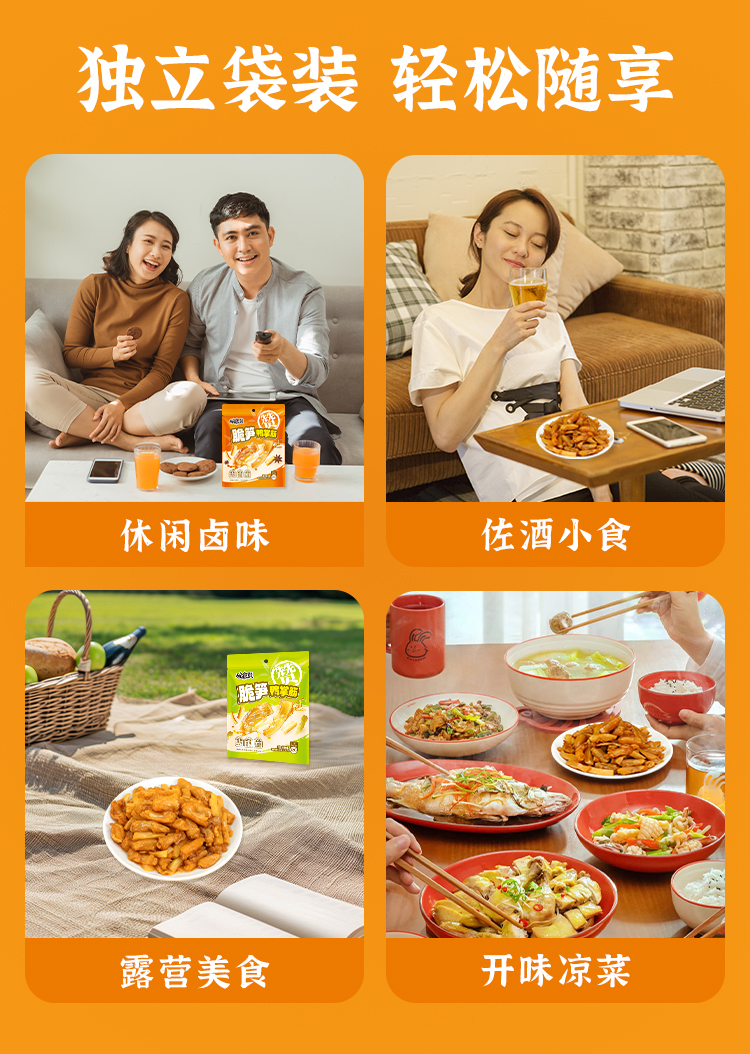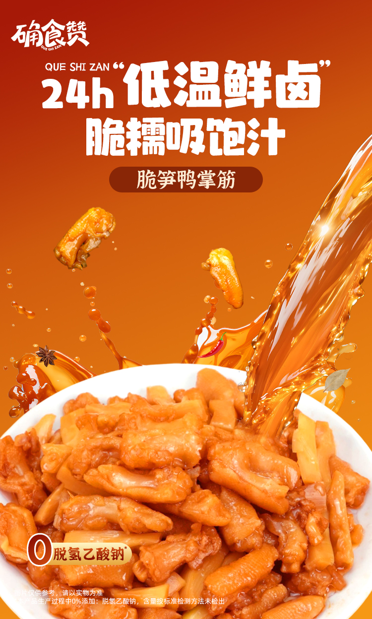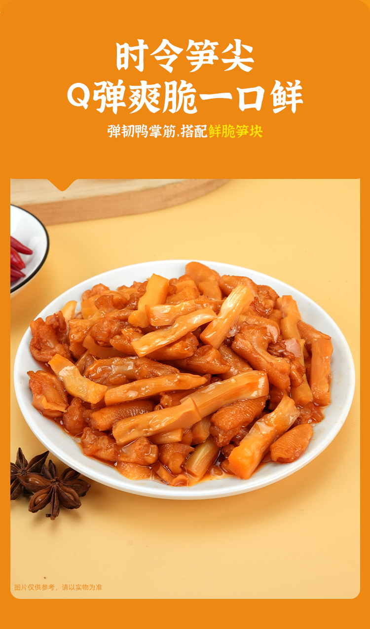 优选新鲜去骨鸭掌筋,搭配鲜脆笋块,多种香辛料进行调制,24小时低温鲜卤;