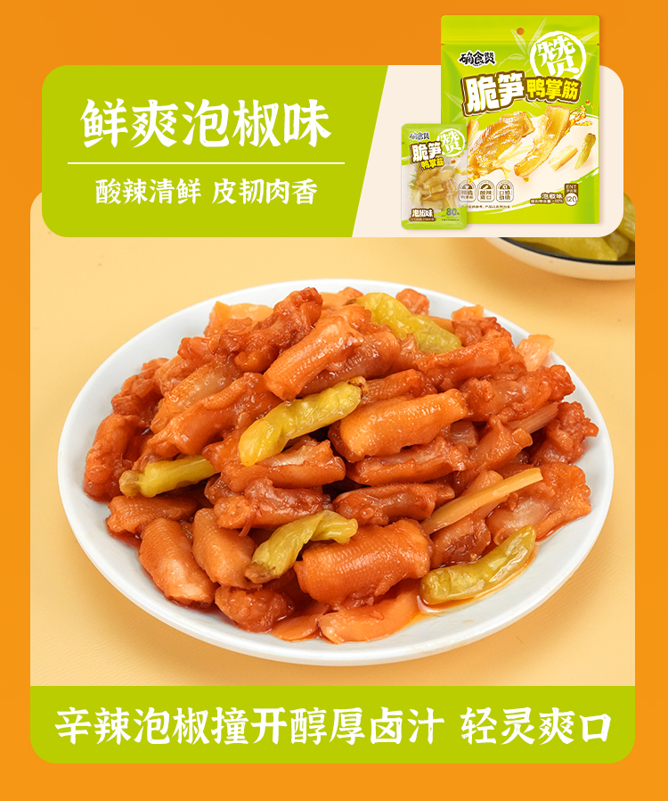 脆笋的清爽脆嫩与鸭掌筋的弹韧软滑形成鲜明对比,每一口都能吃到交织的泡椒香、肉香与笋香,越嚼越入味;