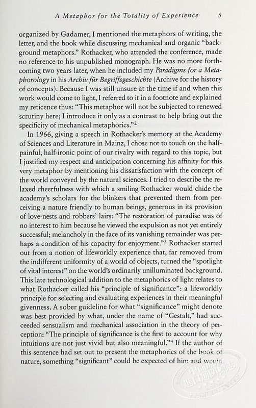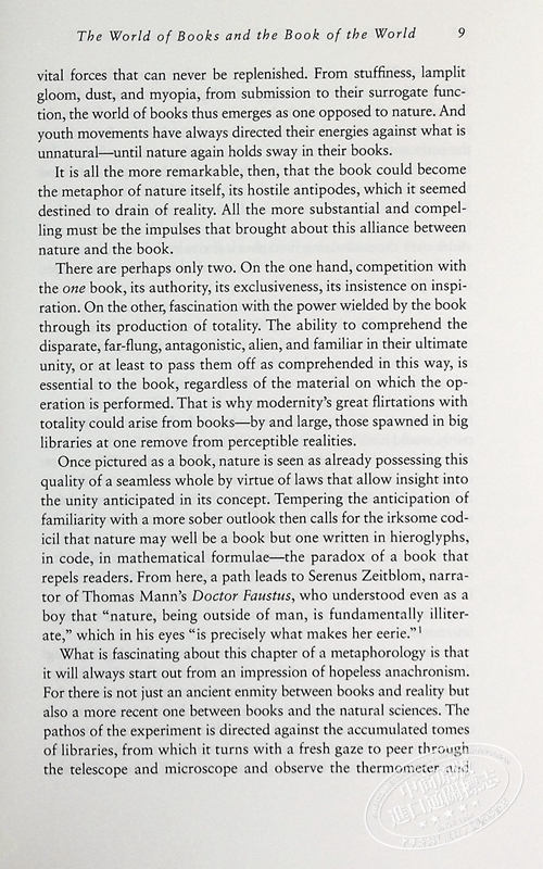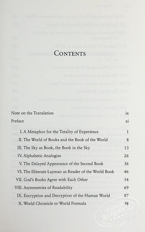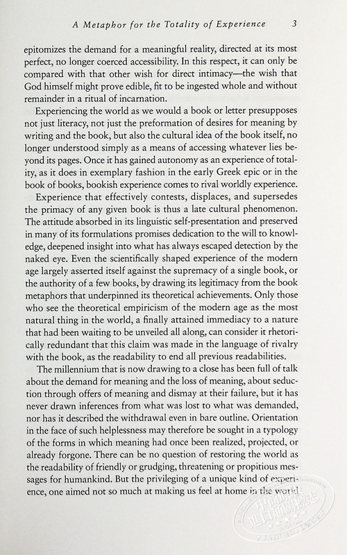 《世界的可读性》将这种方法应用于世界以书的形式呈现这一观点。自然之书的隐喻一直是西方对现实的解读的核心,布鲁门伯格追溯了这一隐喻从古希腊宇宙学到遗传密码模型的演变过程,以了解它所表达、反映和投射的不同现实期望。