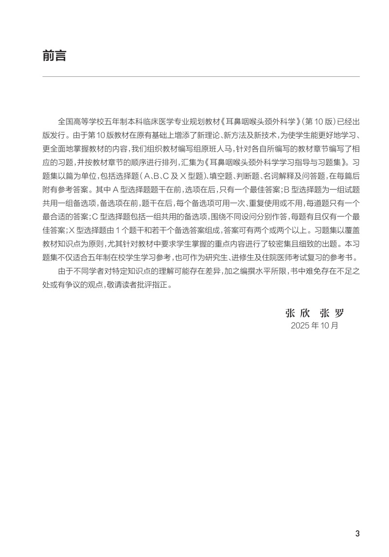 耳鼻咽喉头颈外科学学习指导与习题集 第3三版 十四五规划教材配套教材 全国高等学校配套教材 张欣 张罗 主编 人民卫生出版社