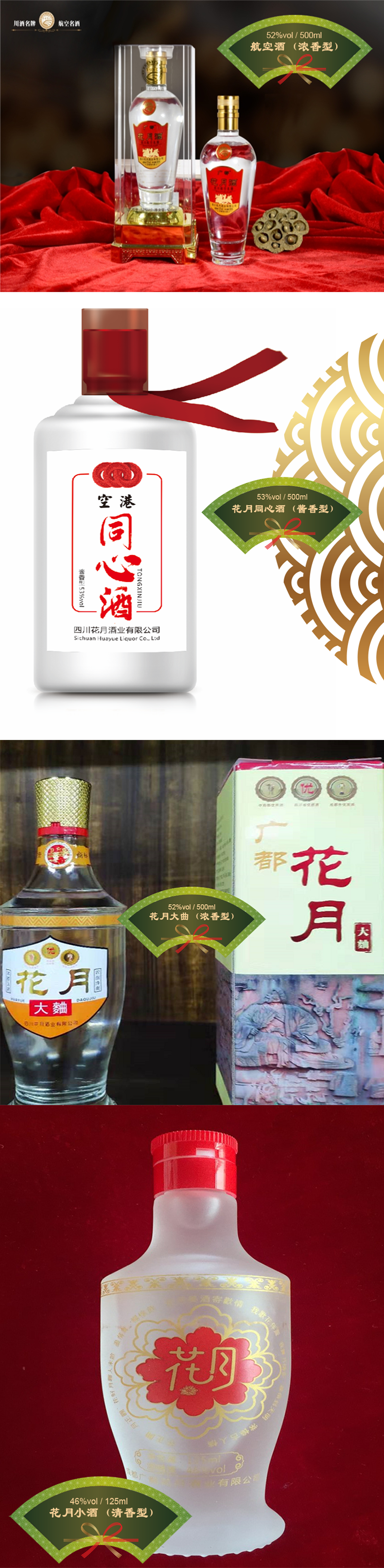 "花月"是川酒名牌,源自唐代名诗《春江花月夜》。千年窑、万年糟,高粱麦曲,单锅小灶,古法酿造,酒美如诗。有雾霭烟霞的画韵,江楼钟馨的清声。朦胧如诗的神秘,诗香酒名,百代流芳。也有华阳的古风,棠湖的繁盛,凭添一樽诗情,半盏文气。“花月”不仅是酒的冰清玉洁,回味悠长。更是陶潜的秋菊,苏轼的江月,李太白的人生梦,张若虚的孤篇诗。