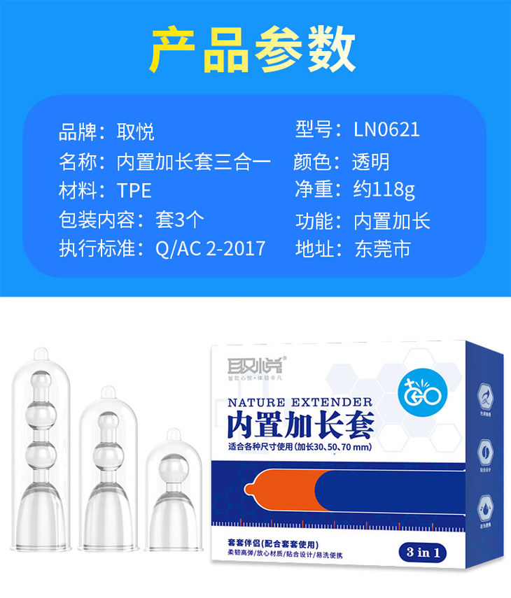 取悦内置加长套 三合一 龟头套 加长加大粗阴茎阳具套锁精环震动狼牙套情趣男性系列成人性用品 不振动内置加长套