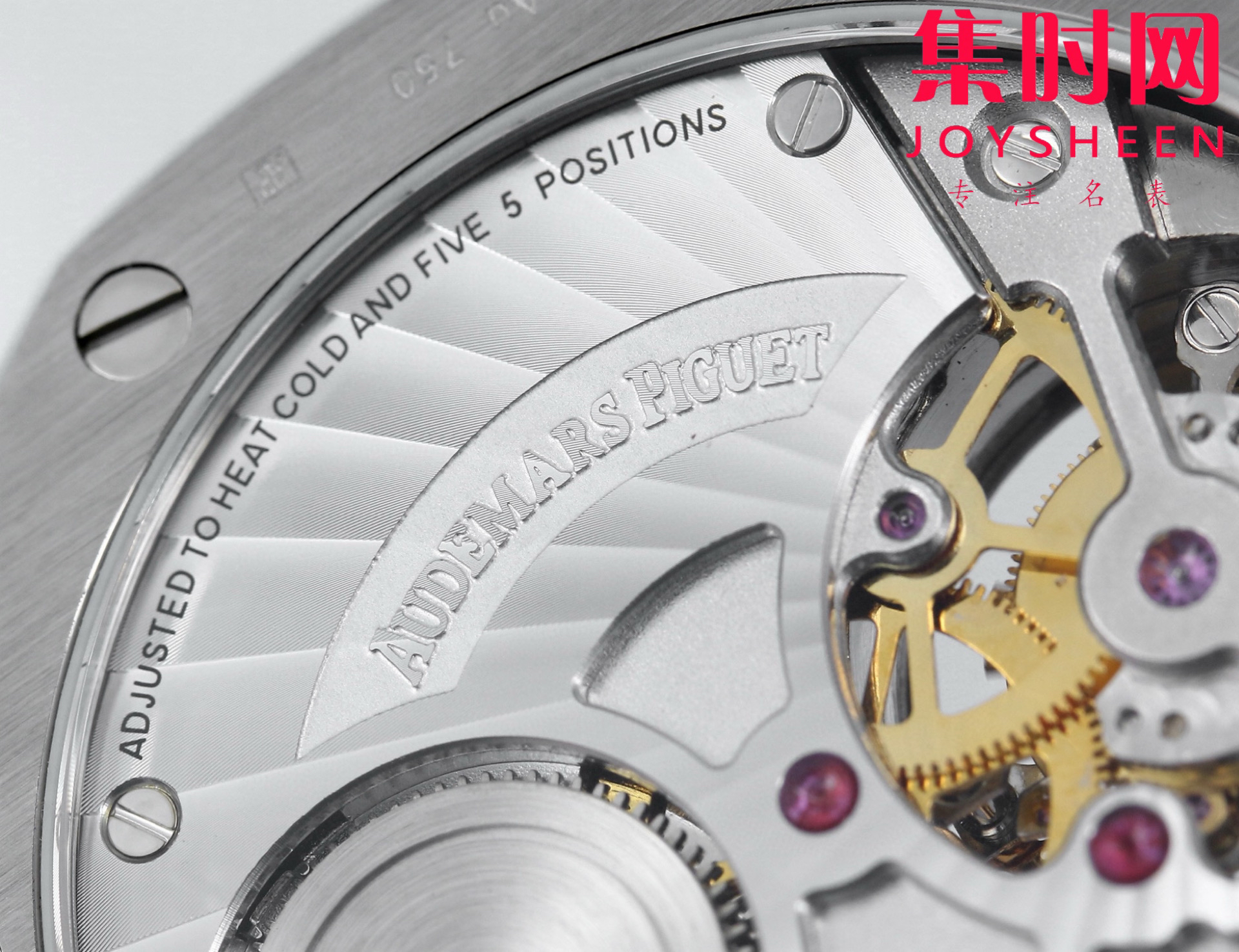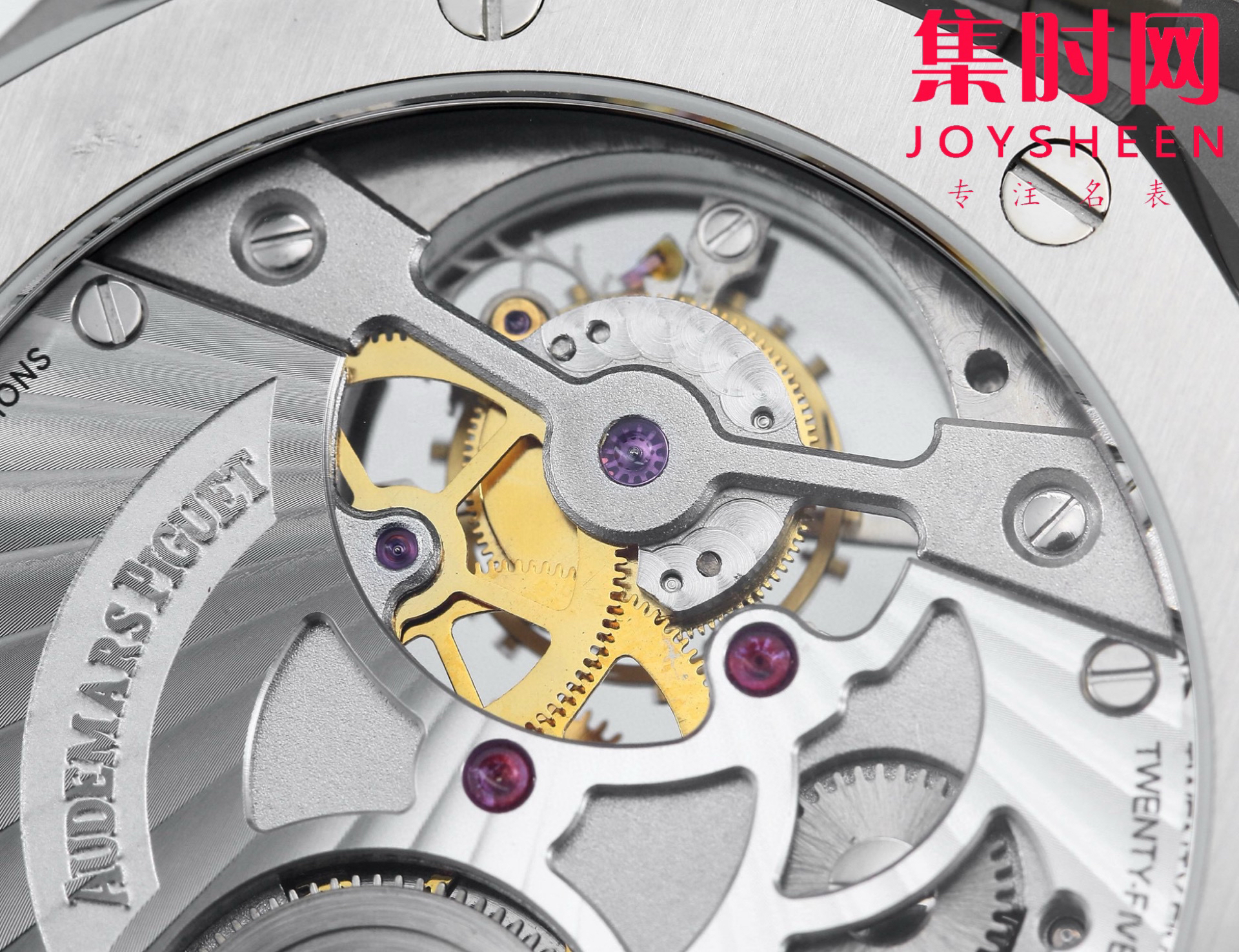 搭载du家订制Cal.2924手动上链陀飞轮机械机芯,爱彼依旧保留的八角形表圈、标志性的六角形螺丝以及经典表带,皇家橡树系列超薄陀飞轮腕表在经典的“Tapsisserie”格纹上进行再度创新,形成了新的格纹“Tapisserie Evolutive”。熟悉又陌生的表盘格纹装饰带来全新观感,成为这款腕表的点睛之笔。表壳直径为41毫米,厚度为11.2毫米,卓越不凡的陀飞轮,因此也得到广大表友的喜爱和关注。