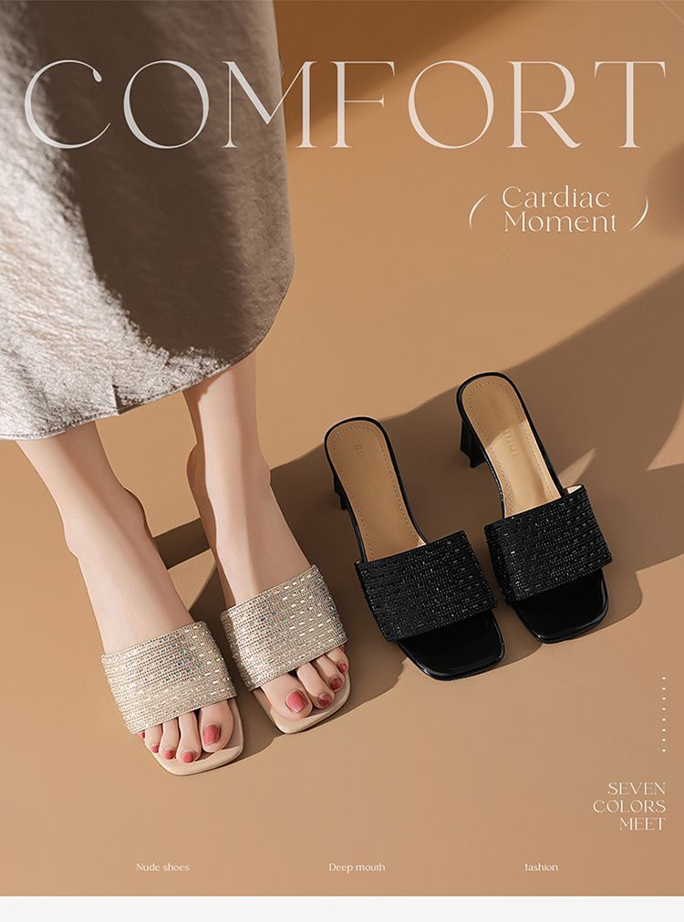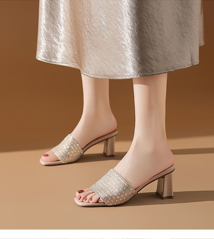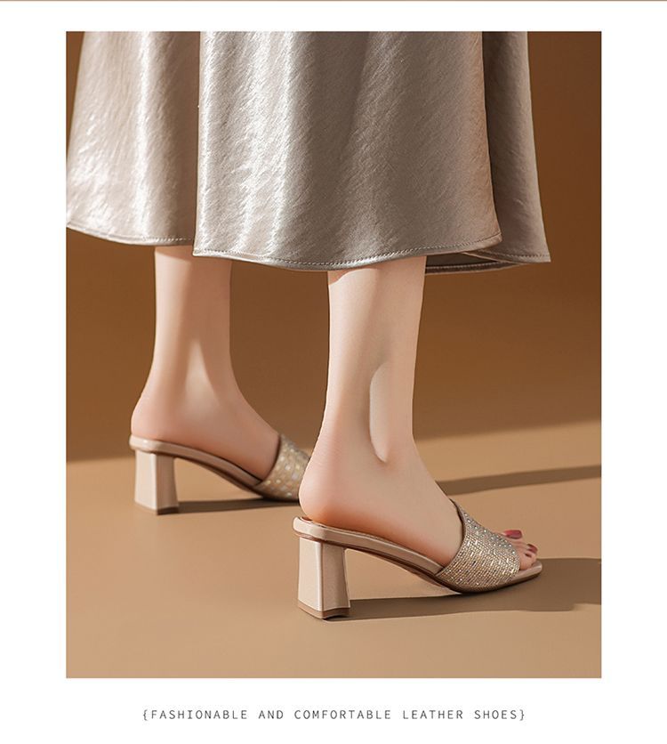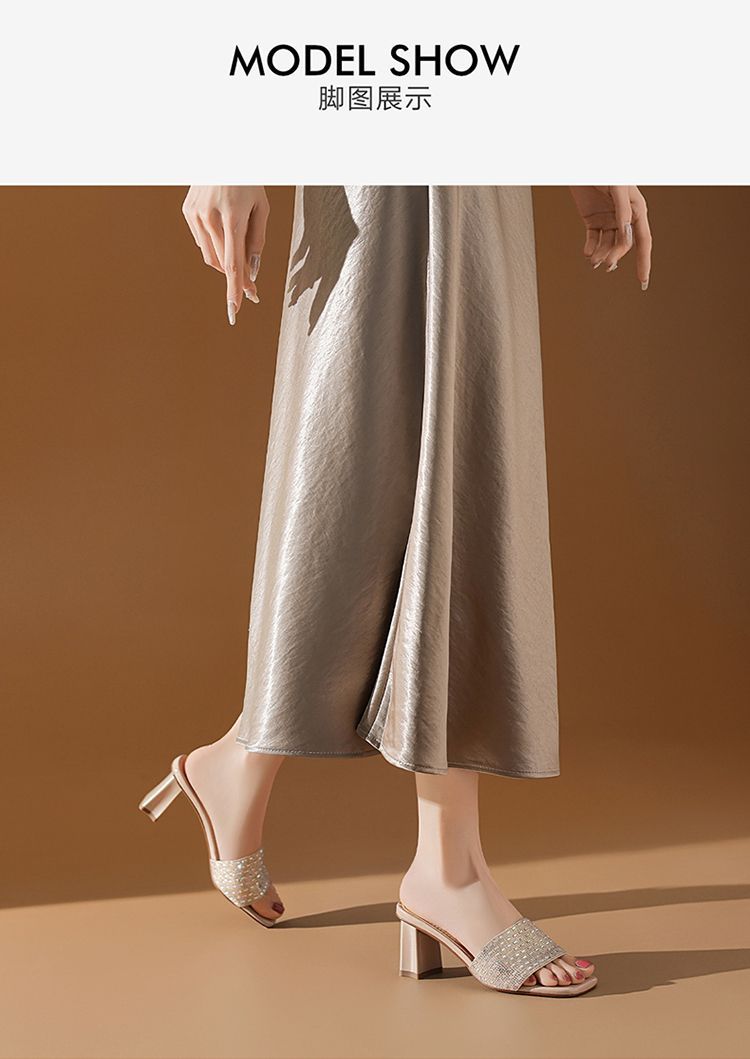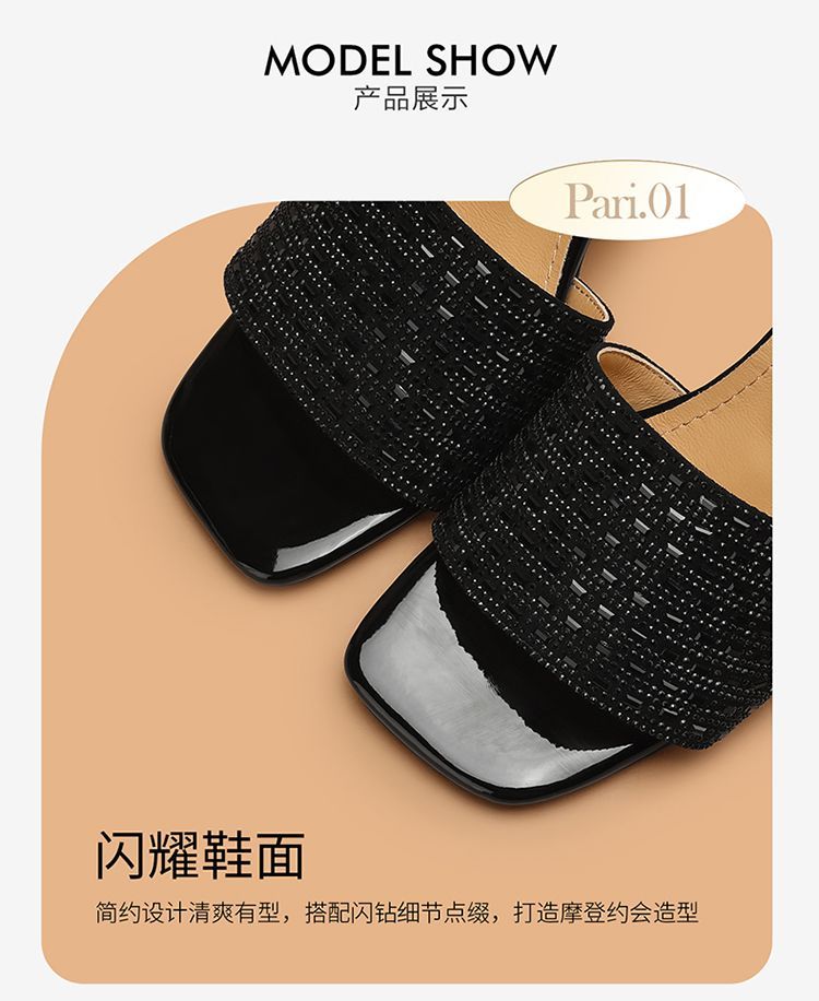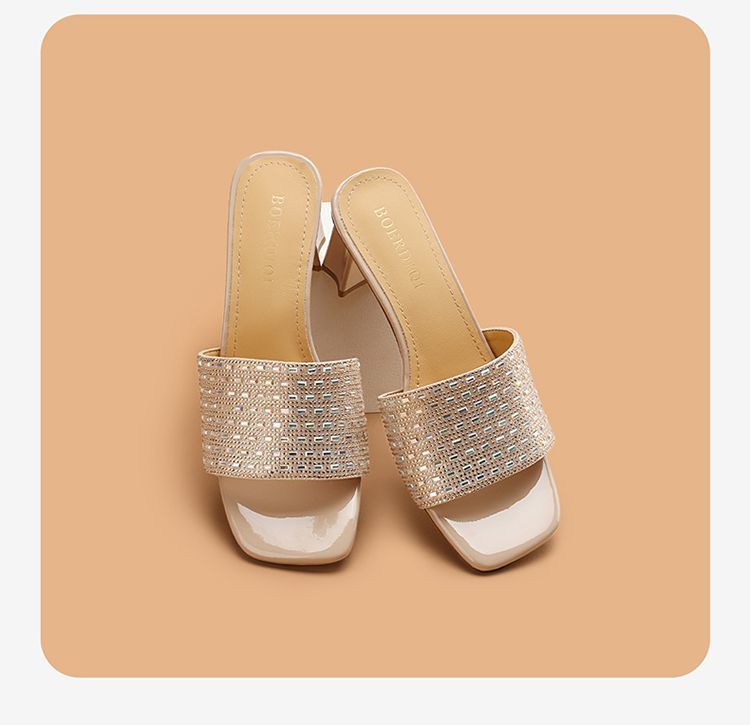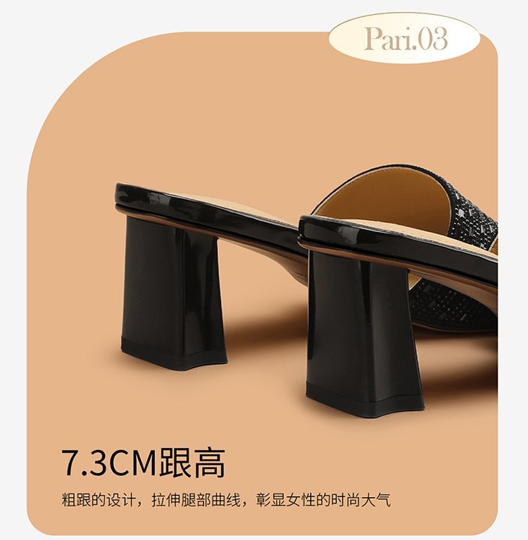 【羊皮内里】拖鞋25夏新款方头露趾粗跟时尚水钻高跟凉拖-BB