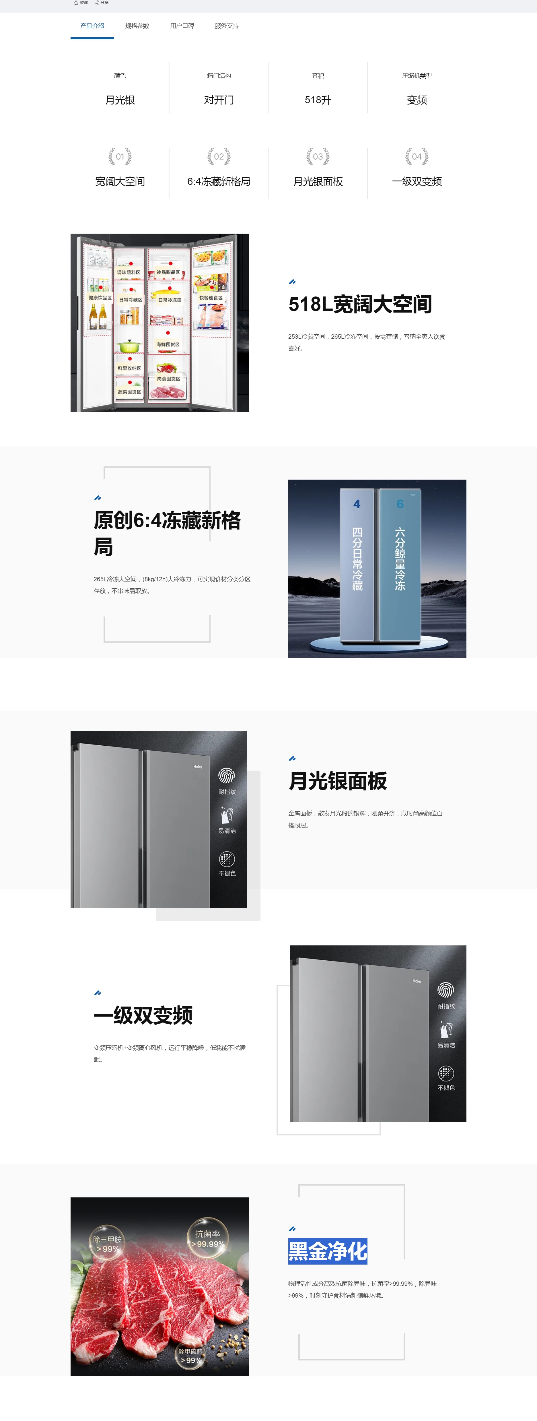海尔 冰箱 BCD-518WLHSSEDS9 518升 对开门 风冷 变频 一级能效 一级双变频 电脑控温 PCM钣金面板 触摸 控制 月光银颜色