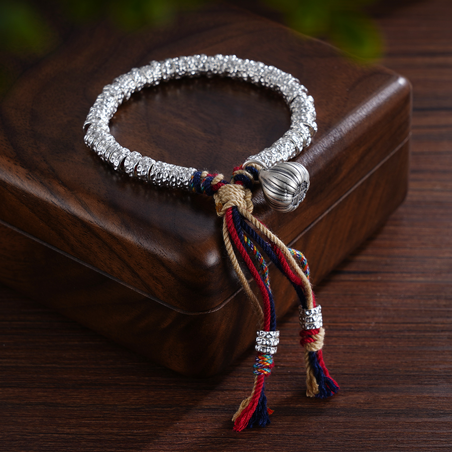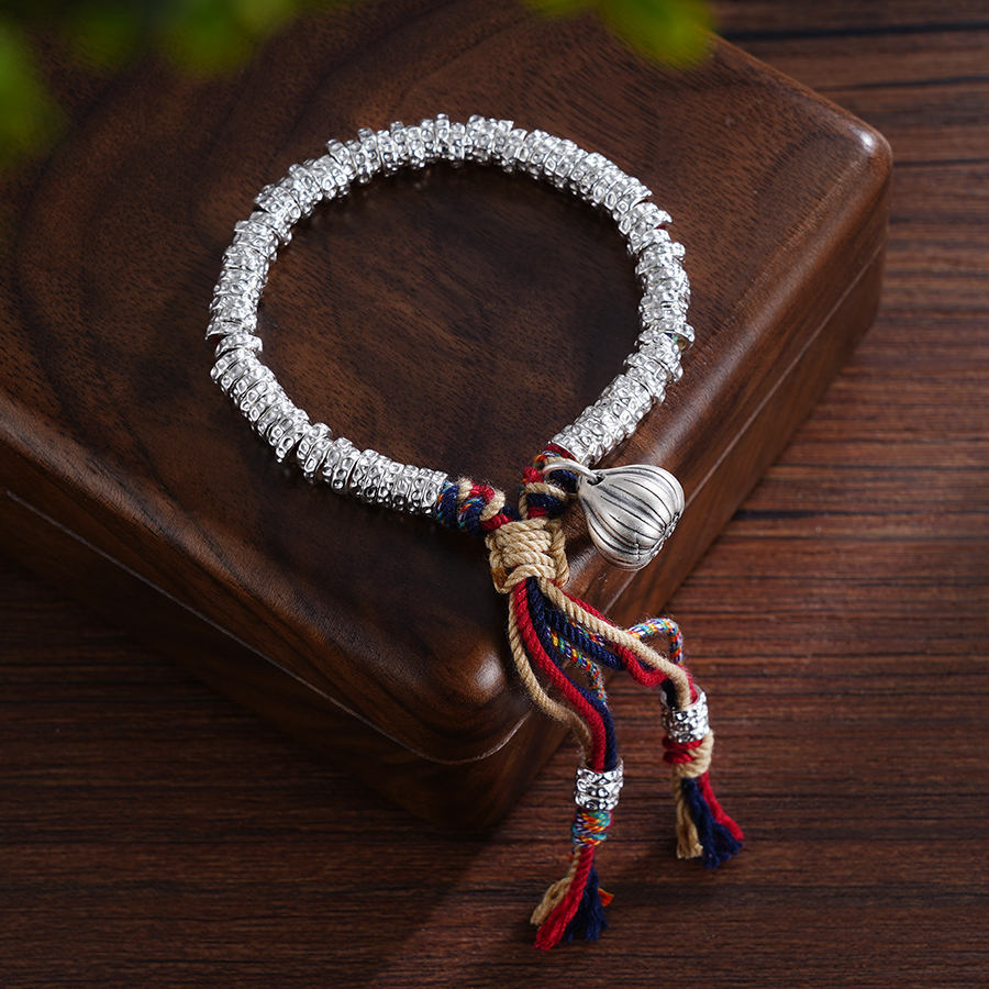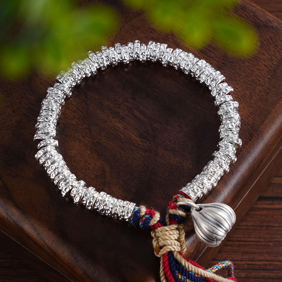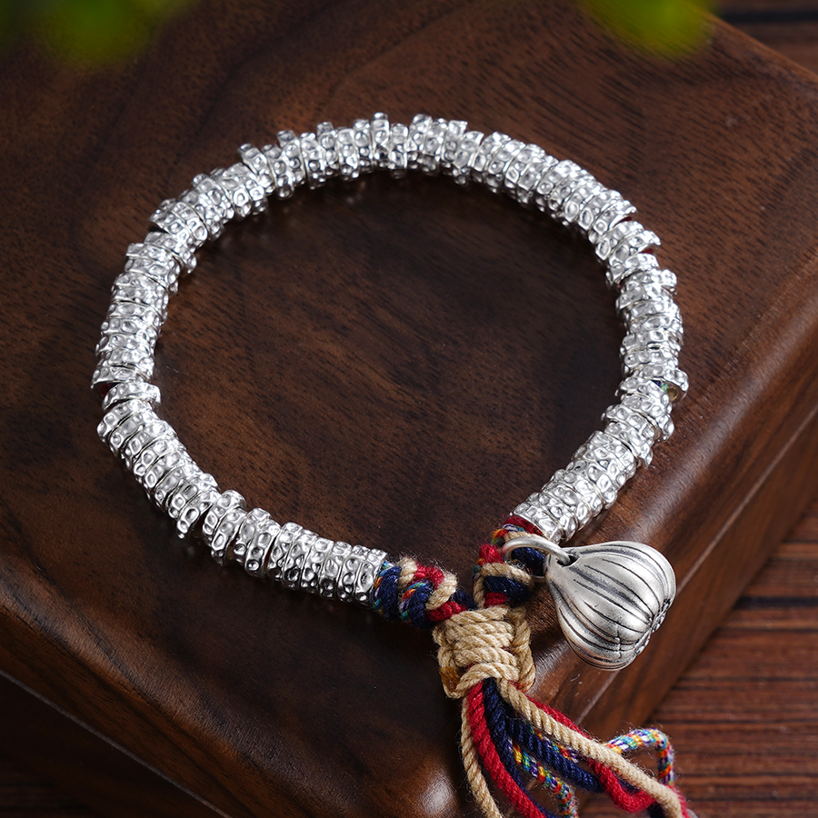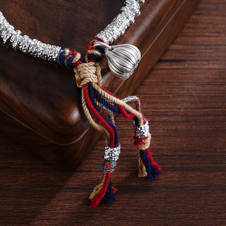 【寓意】:小众设计感盘缠手串,点缀大蒜坠饰。实心锤纹手工银圈搭配彩绳,色泽古朴温润,结实耐用。作品寓意算无遗策,招财进宝。