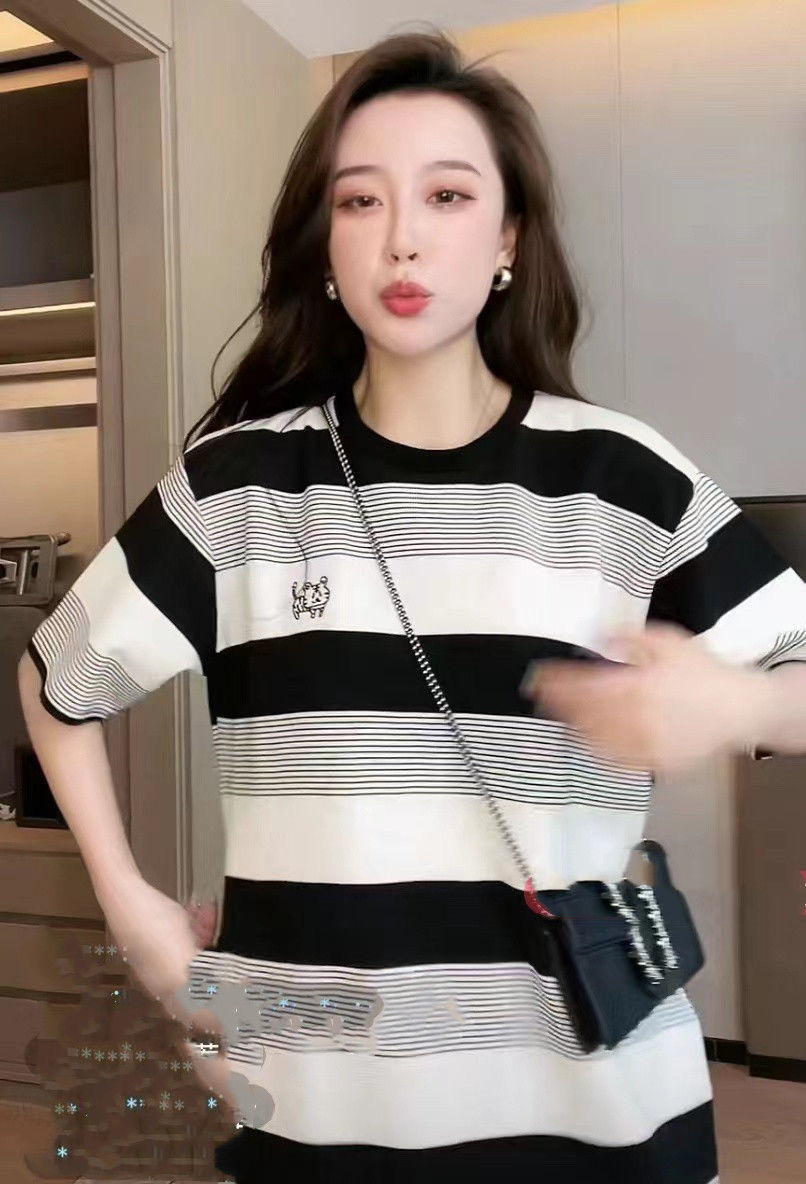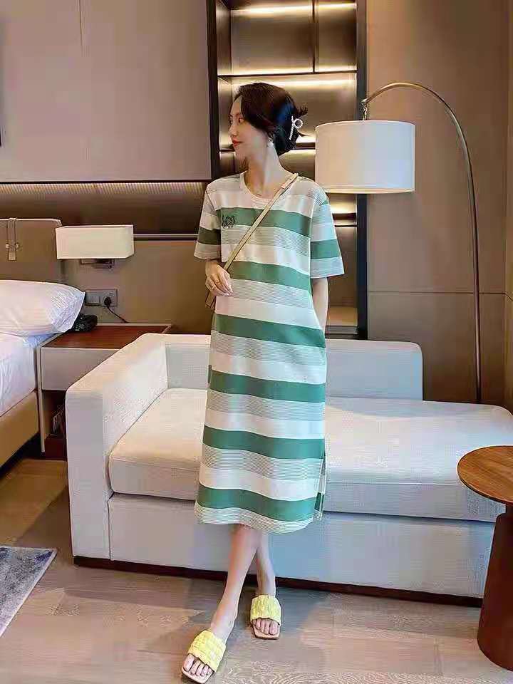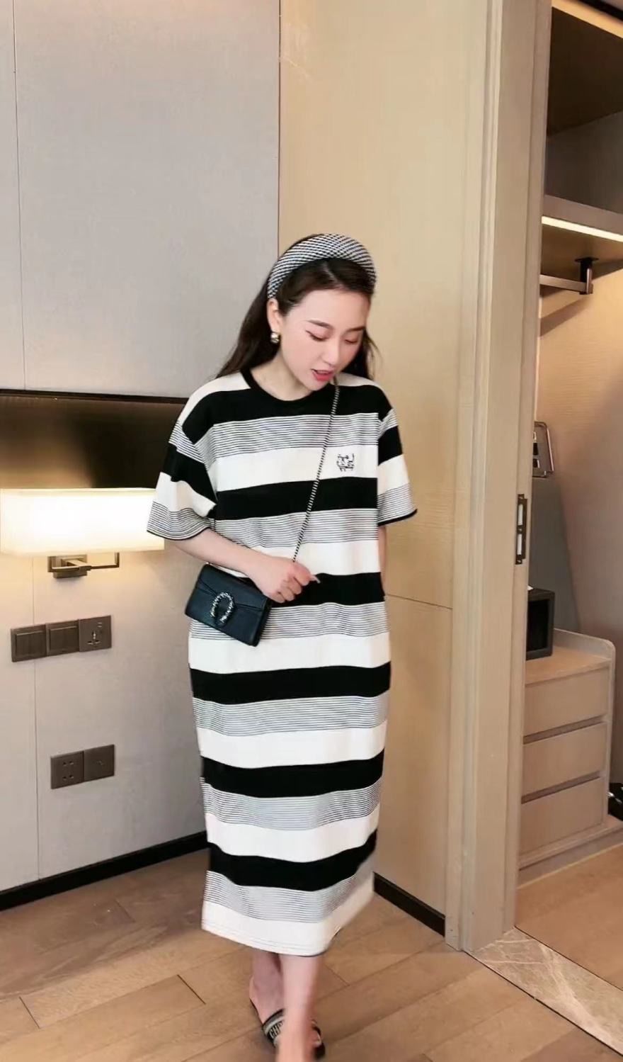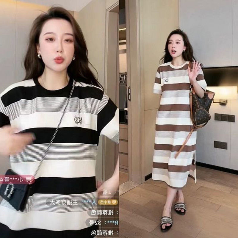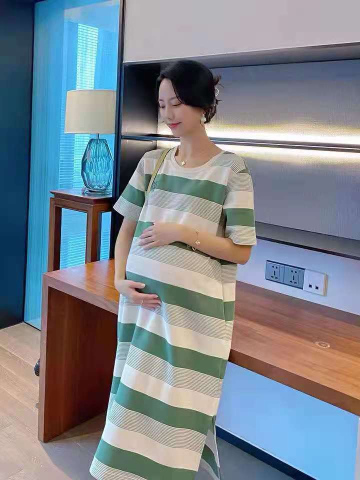 黛唯梵冰丝针织孕妇连衣裙夏装时尚短袖圆领宽松大码条纹网红夏季孕妇装