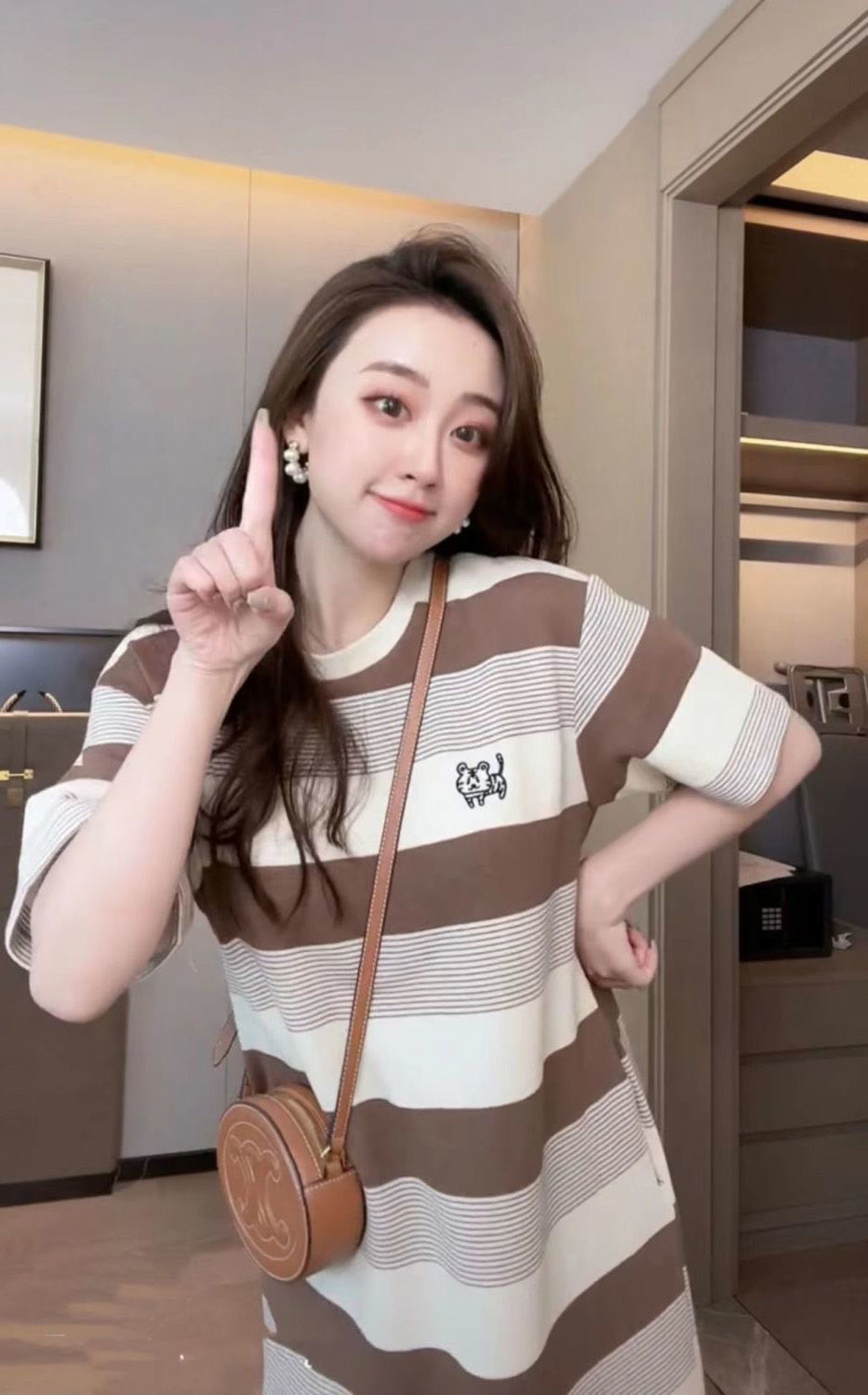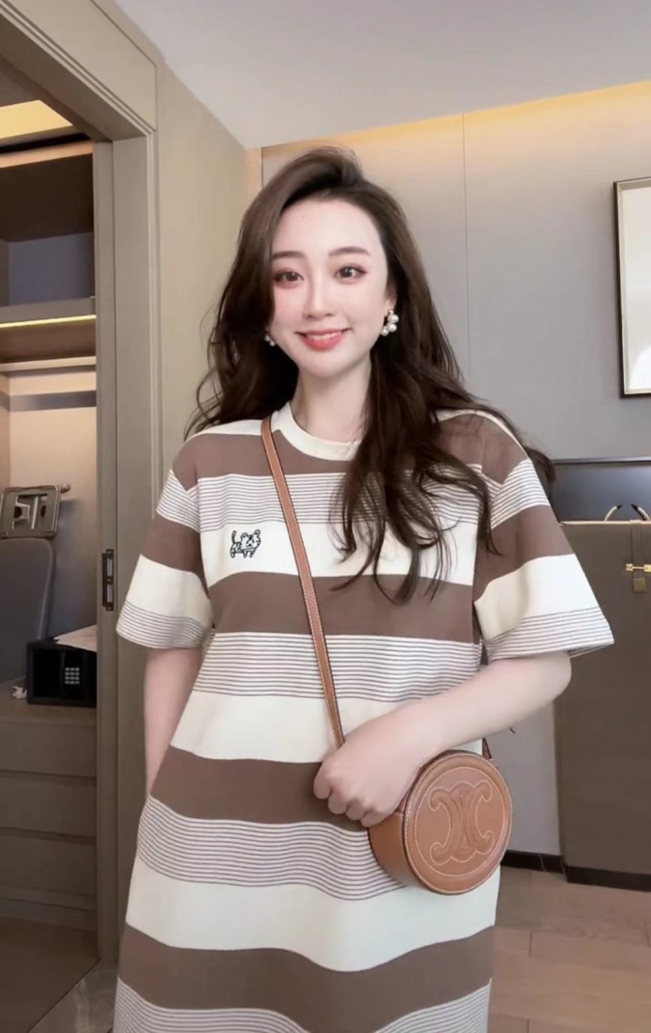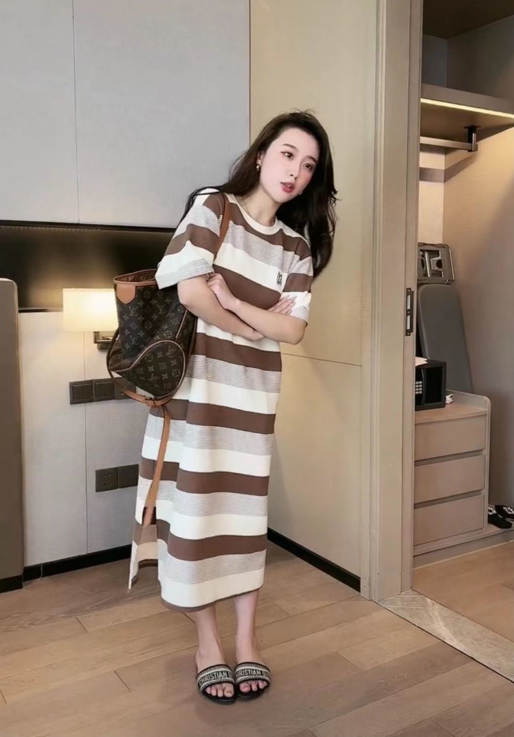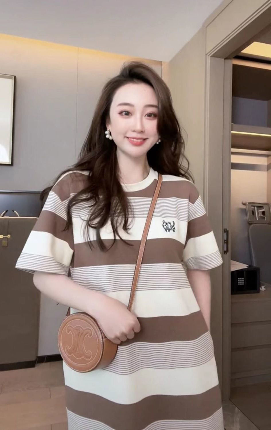 黛唯梵冰丝针织孕妇连衣裙夏装时尚短袖圆领宽松大码条纹网红夏季孕妇装