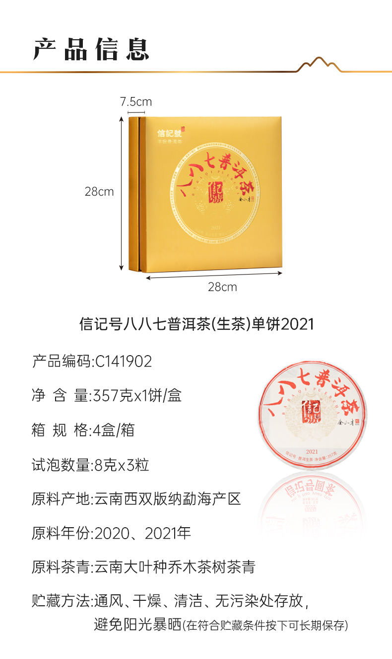 八马信记号 | 普洱生茶 信记号八八七普洱茶单饼装(357克) C141902