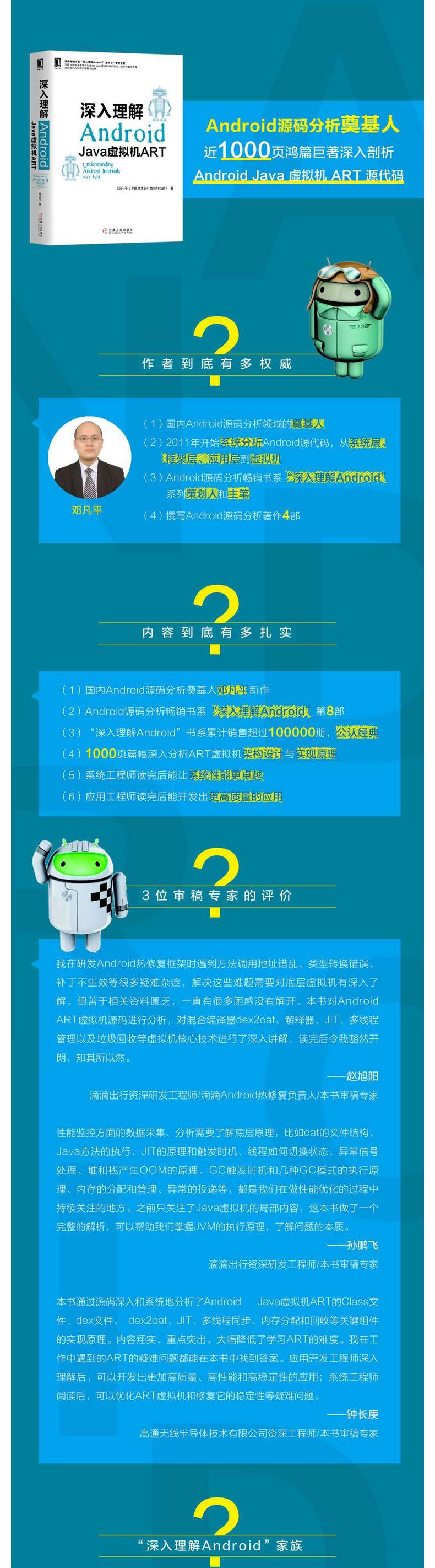邓凡平,资深Android技术专家,国内早期从事Android技术研究和开发的工程师之一。从底层的虚拟机,到中间的系统层和框架层,再到上层的各种应用,他对整个Android系统的源代码有非常深入的研究和理解。他策划并撰写了“深入理解Android”系列图书(目前已出版8本),累计销量超过10万册,是广大Android工程师系统、深入了解Android系统源代码的优选。