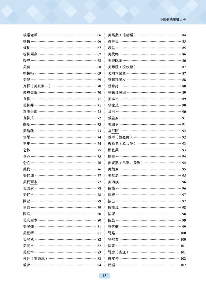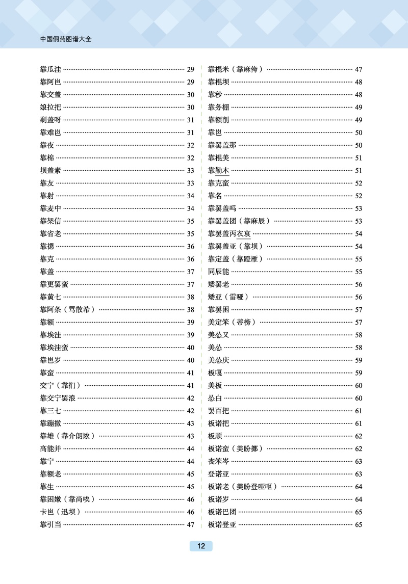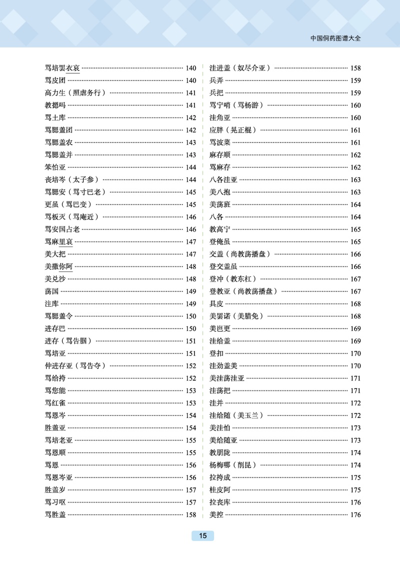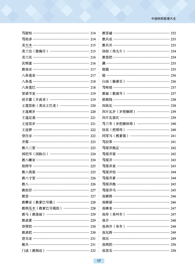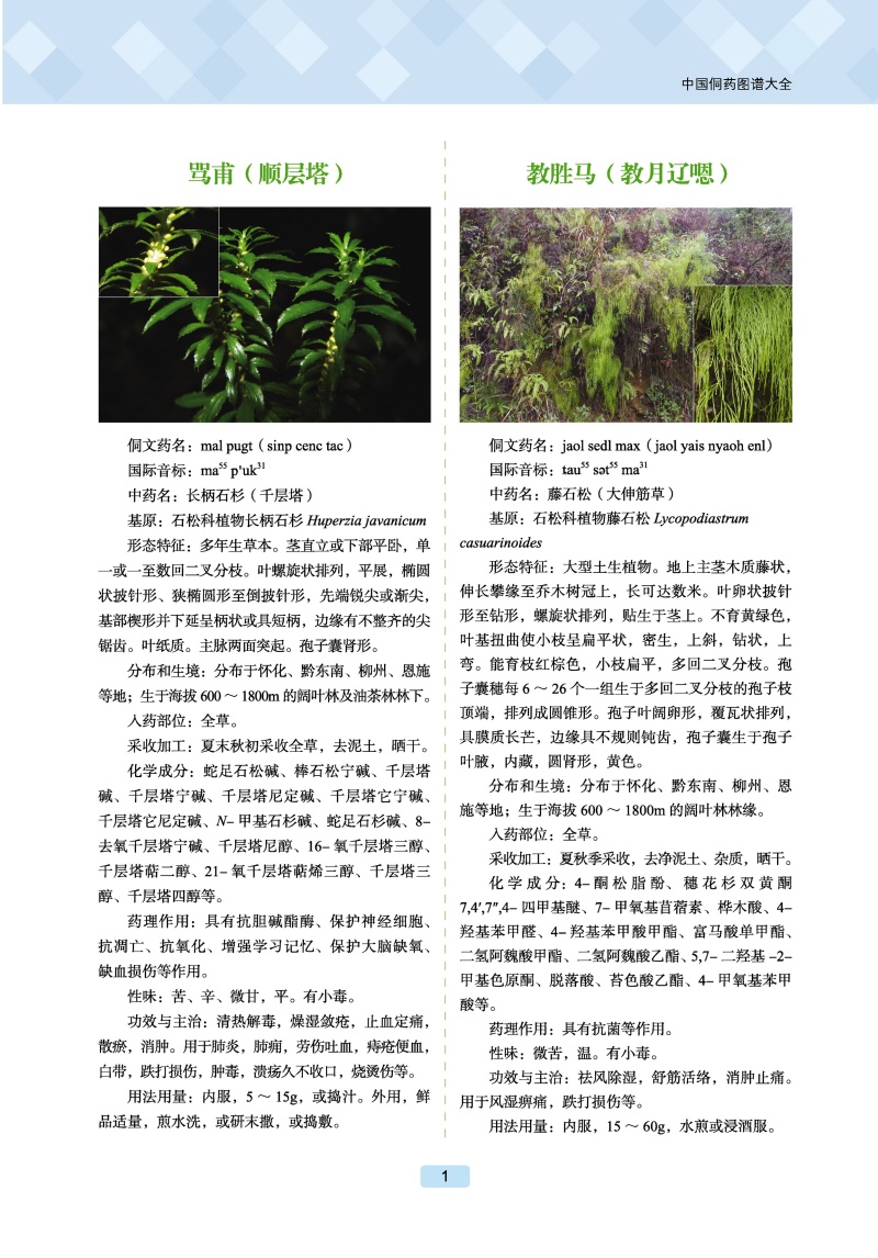 《中国侗药图谱大全》,收载侗药2068种,内容主要有侗药的彩色图片、侗药的汉字记音、侗药名、侗文国际音标、基原、形态特征、分布和生境、入药部位、采收加工、化学成分、药理作用、性味、功效与主治、用法用量、注意事项等。本书编写人员都参加了全国第四次中药资源普查,书中图片均为编委自己野外拍摄。