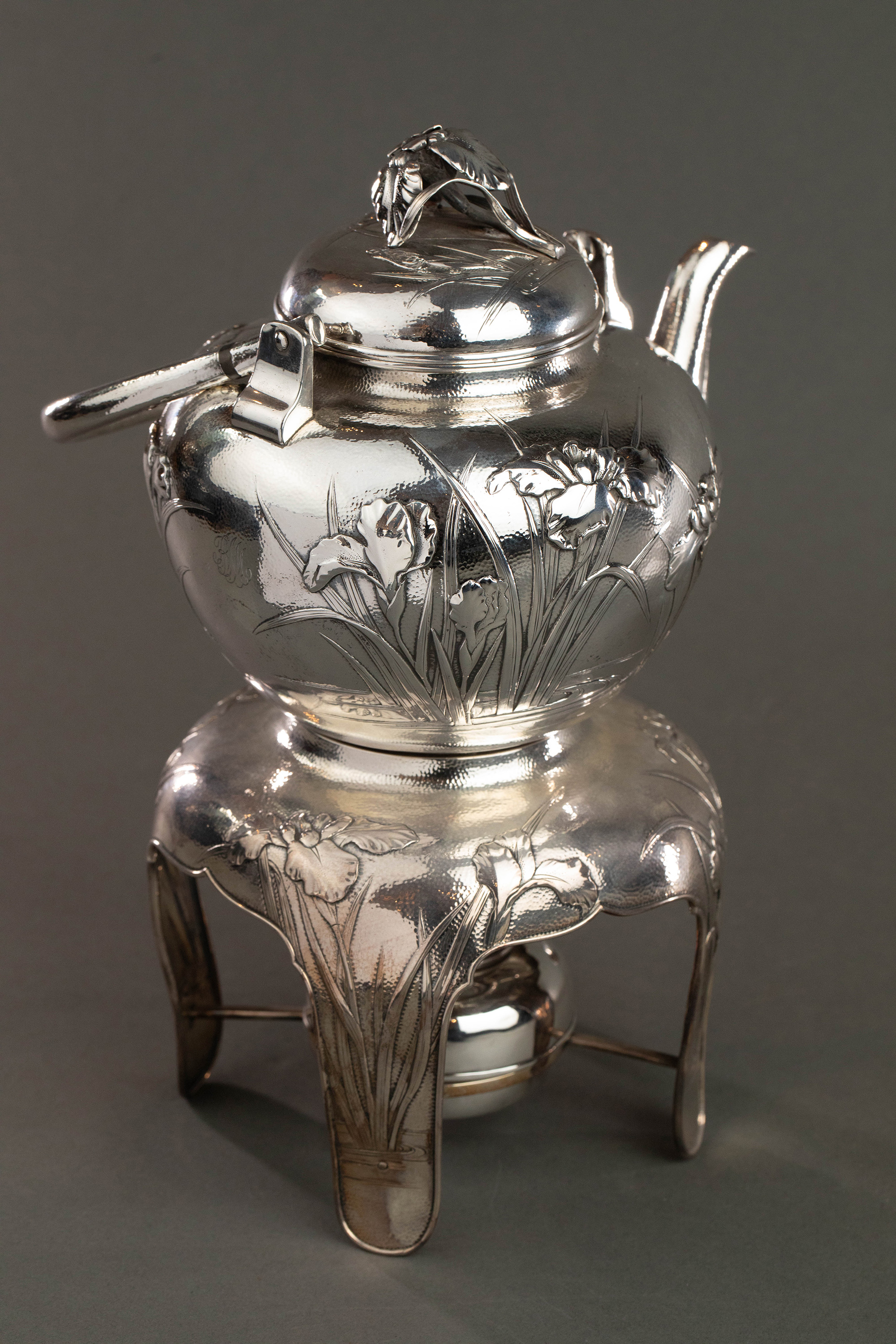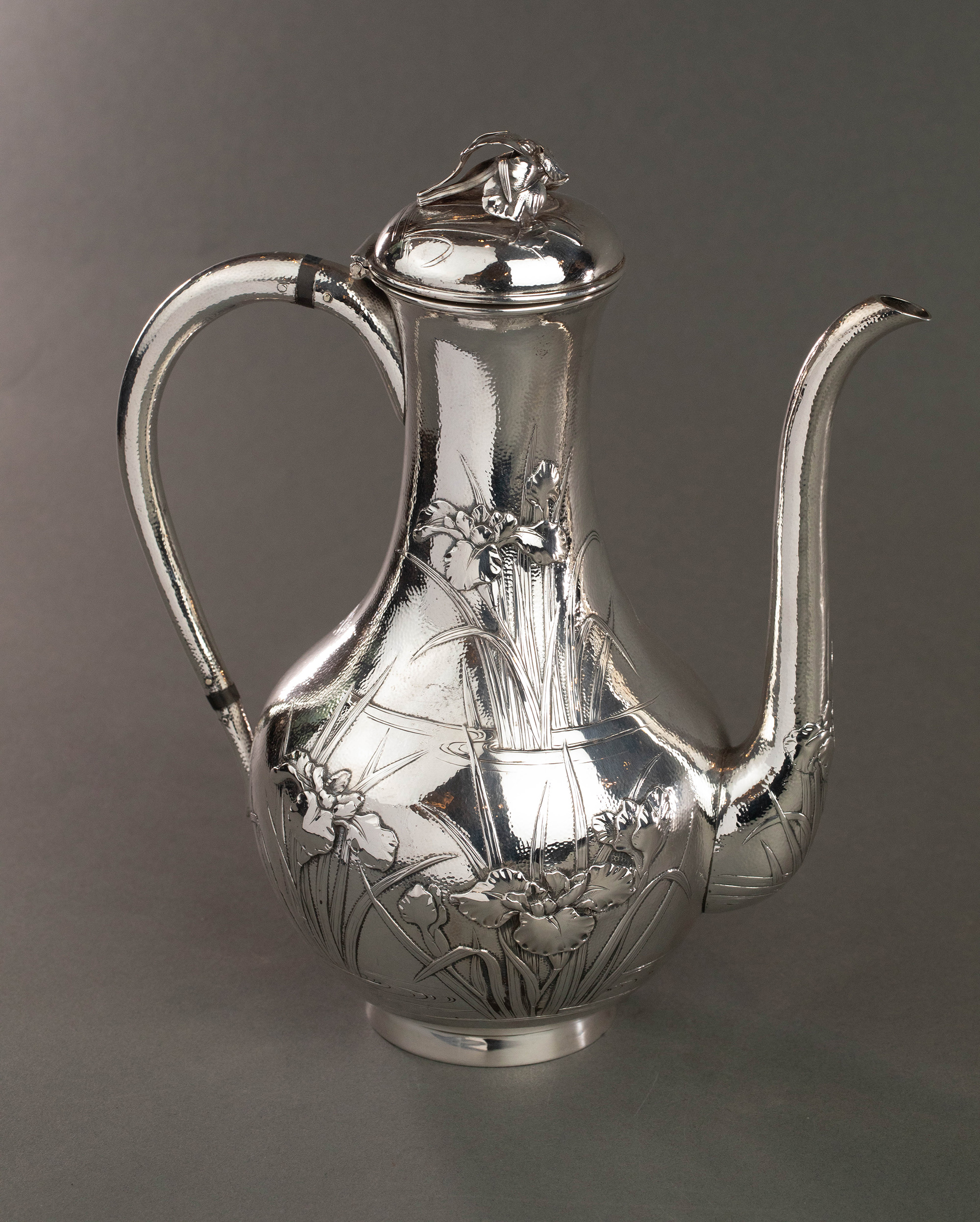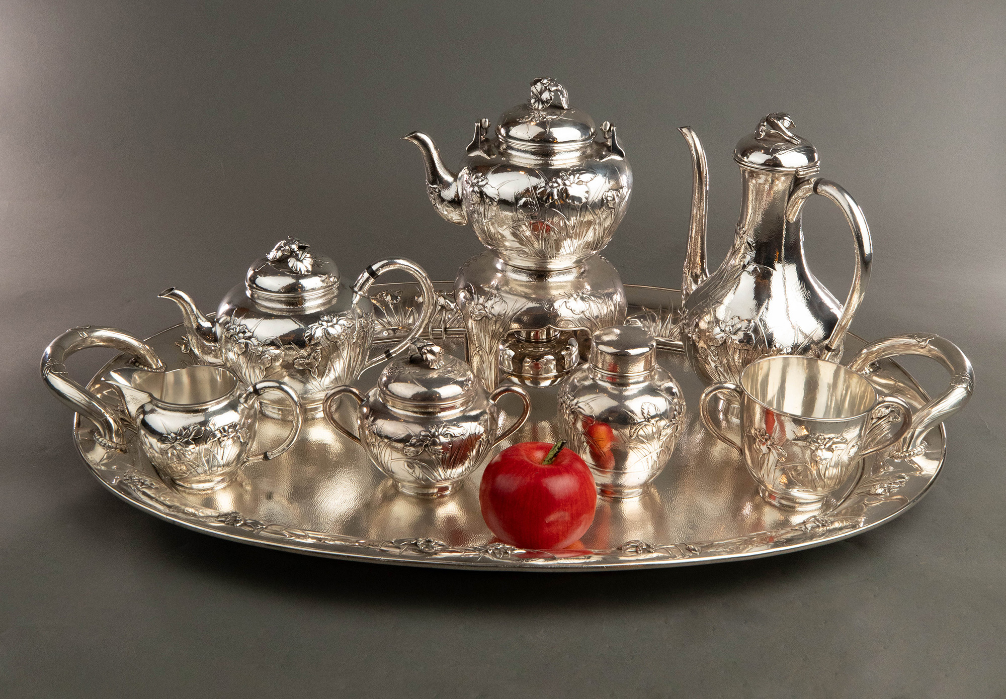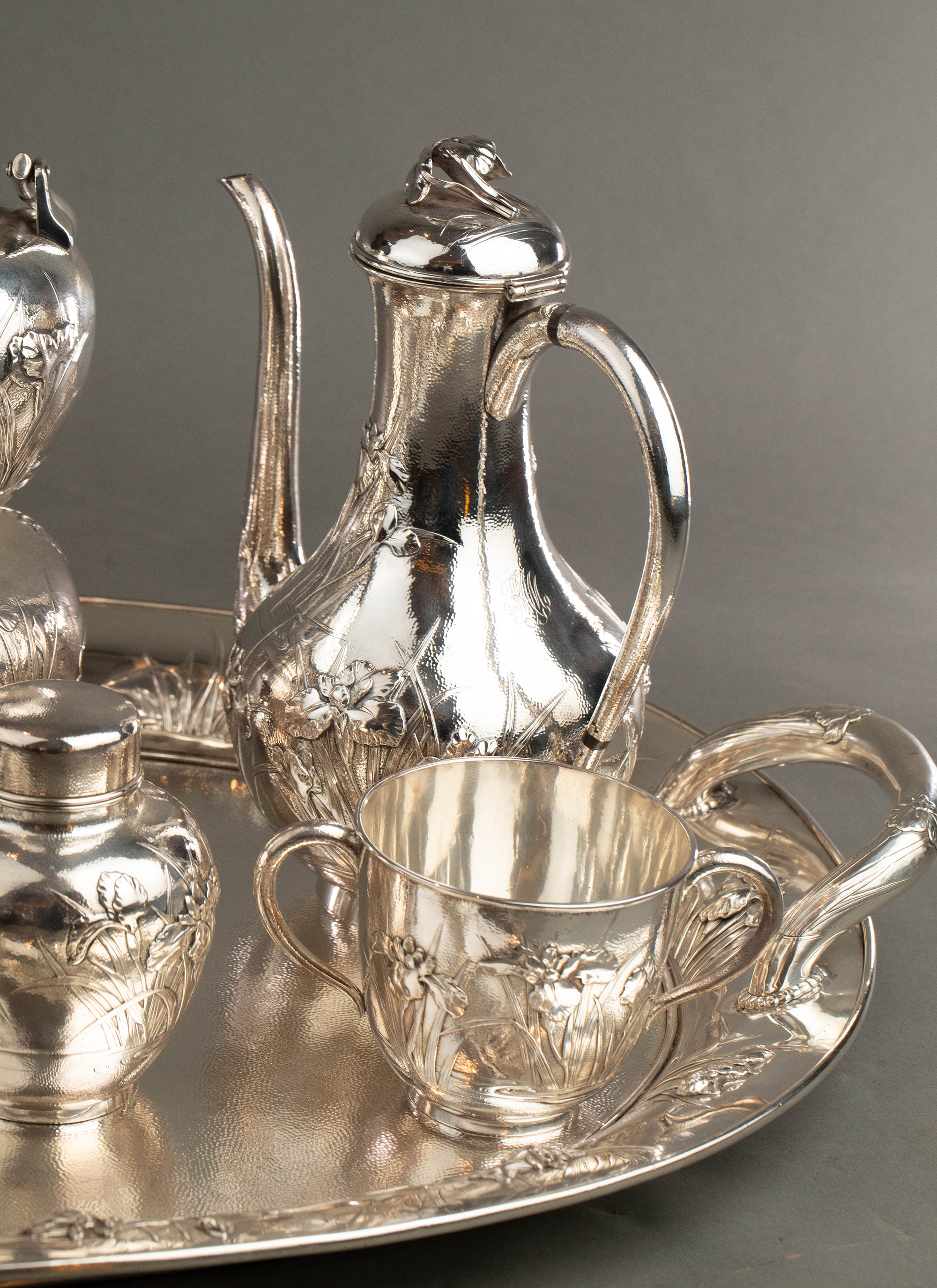 20世纪早期日本横滨武士商会Samurai Shokai签名出品鸢尾花主题纯银精雕咖啡茶具套件