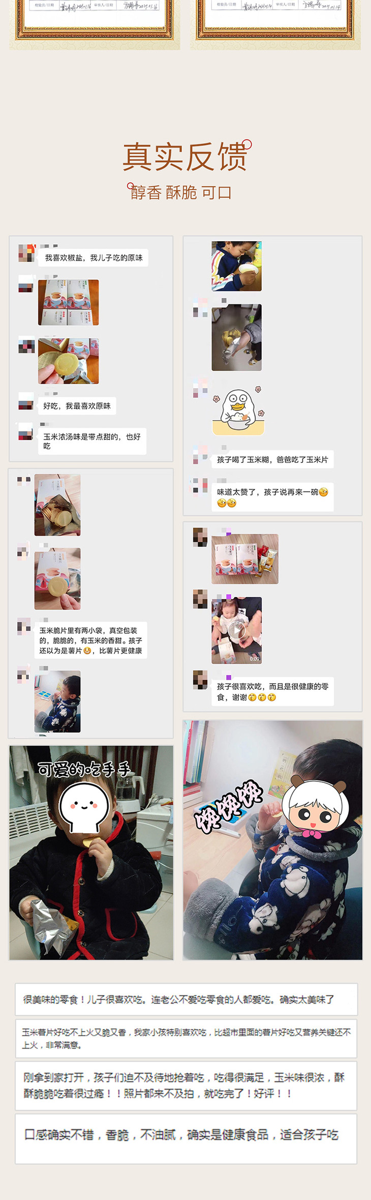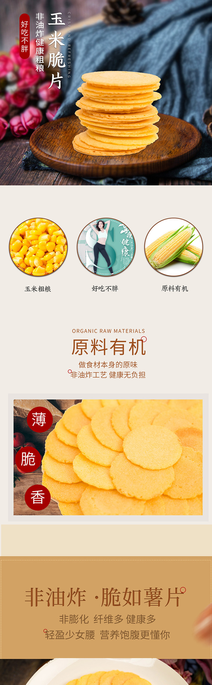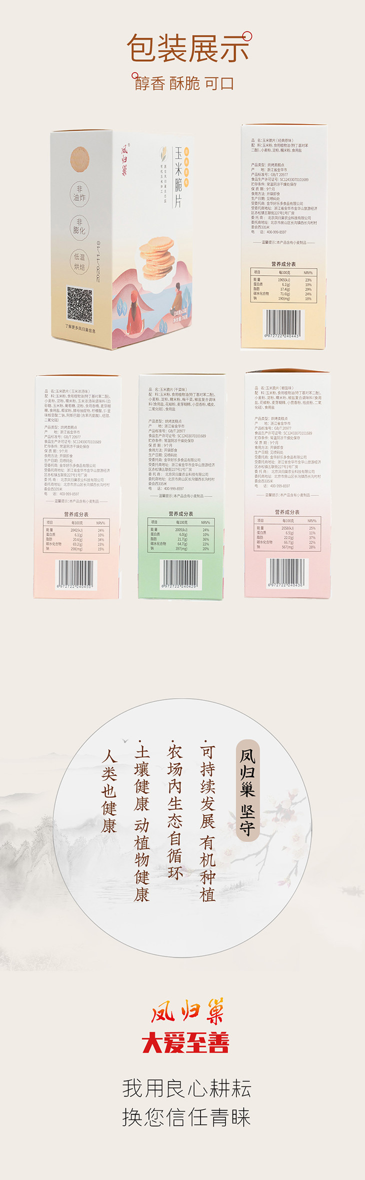 玉米脆片由凤归巢有机玉米为主要原材料,经低温烘焙制作而成。非油炸、非膨化、不添加蔗糖。