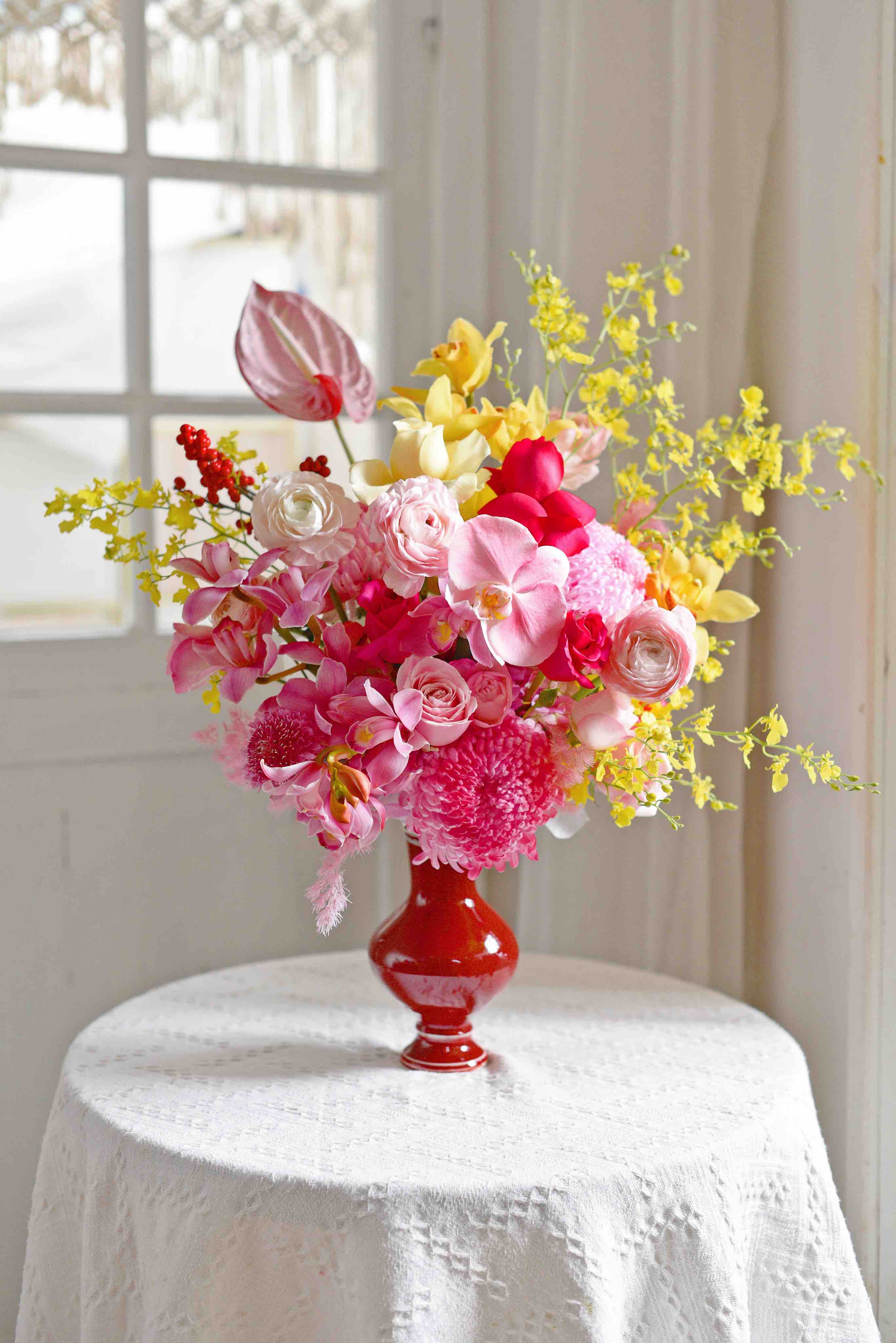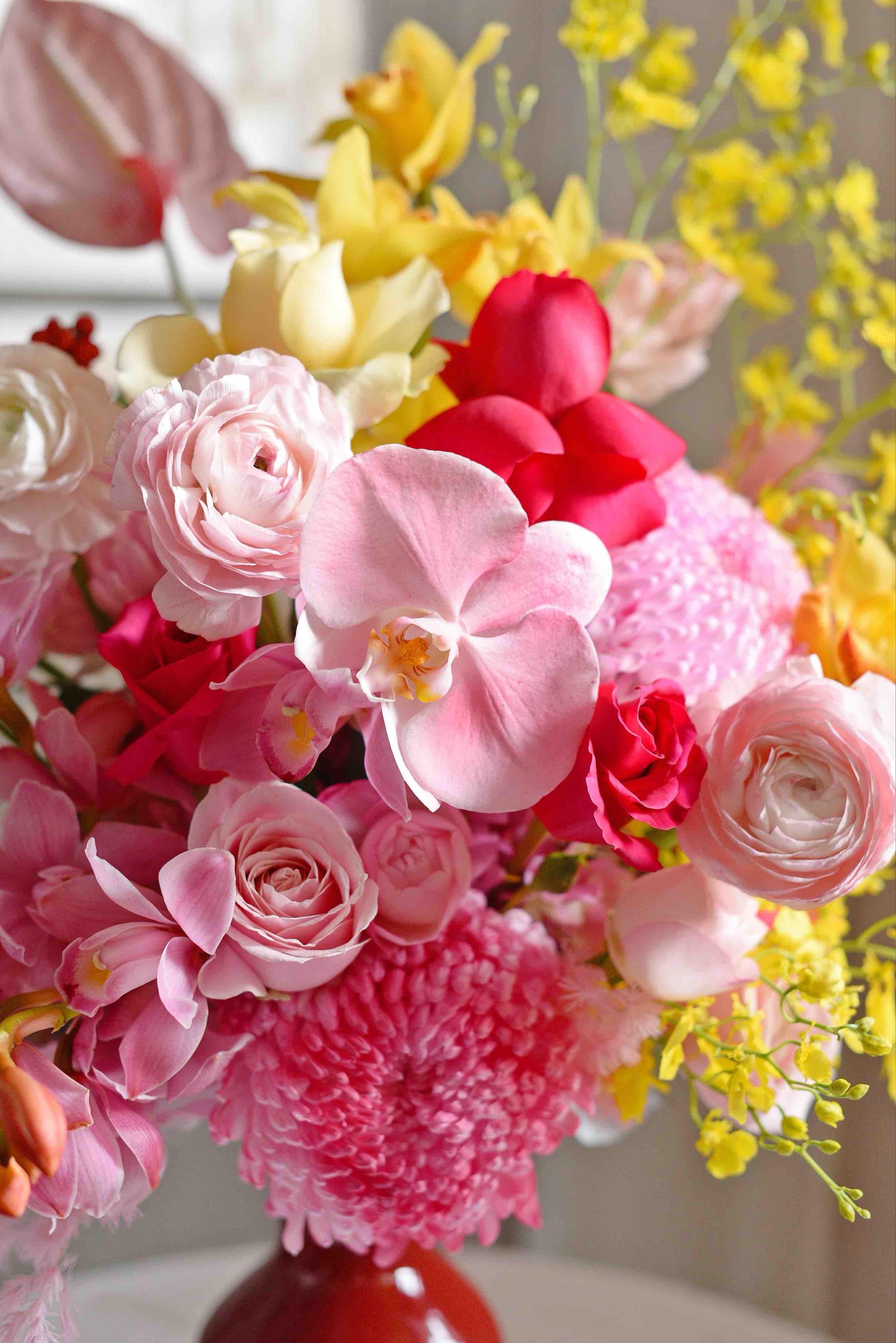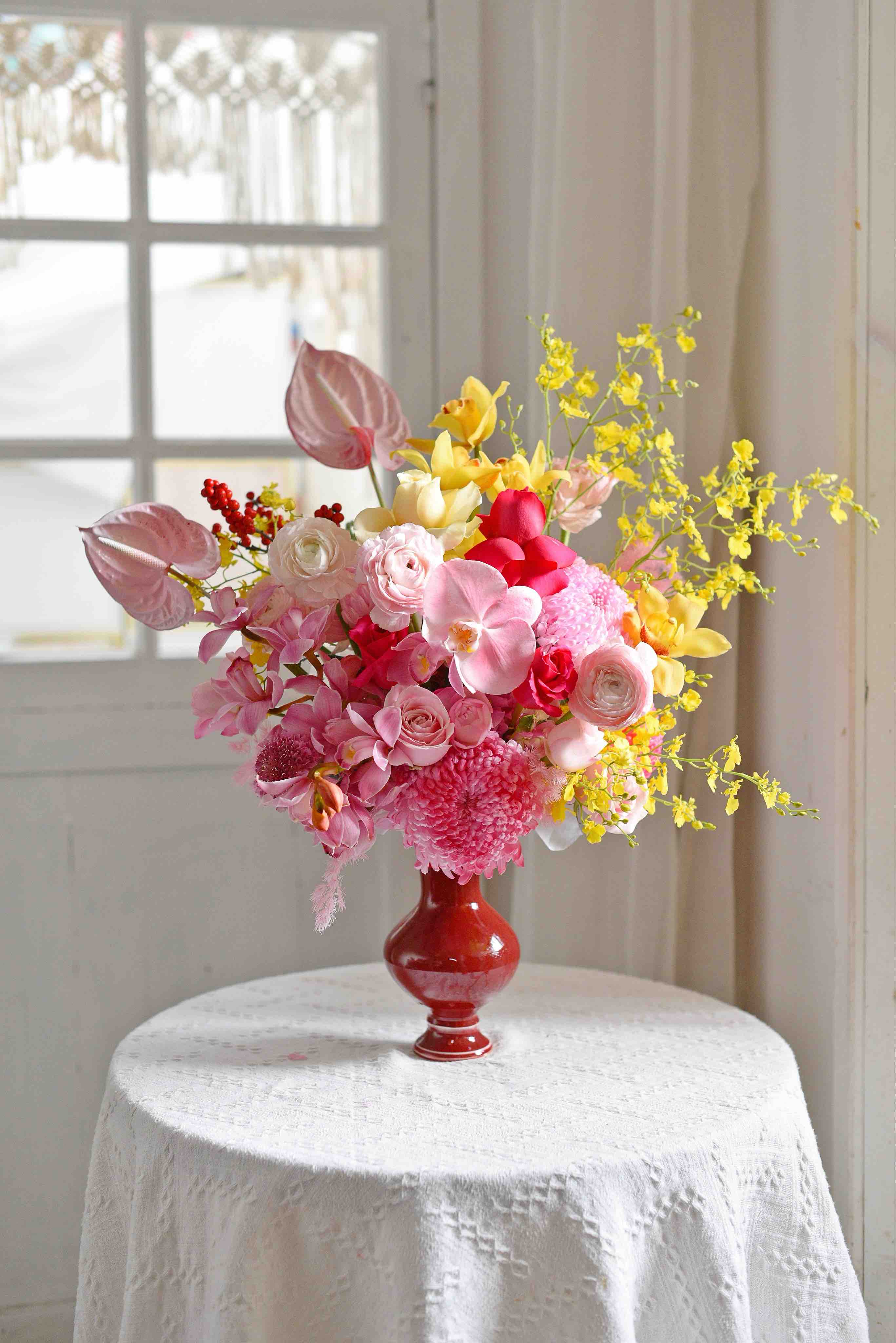 《春和景明》大花蕙兰蝴蝶兰河内洋牡丹瓶插花
