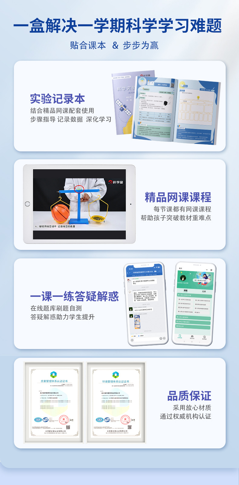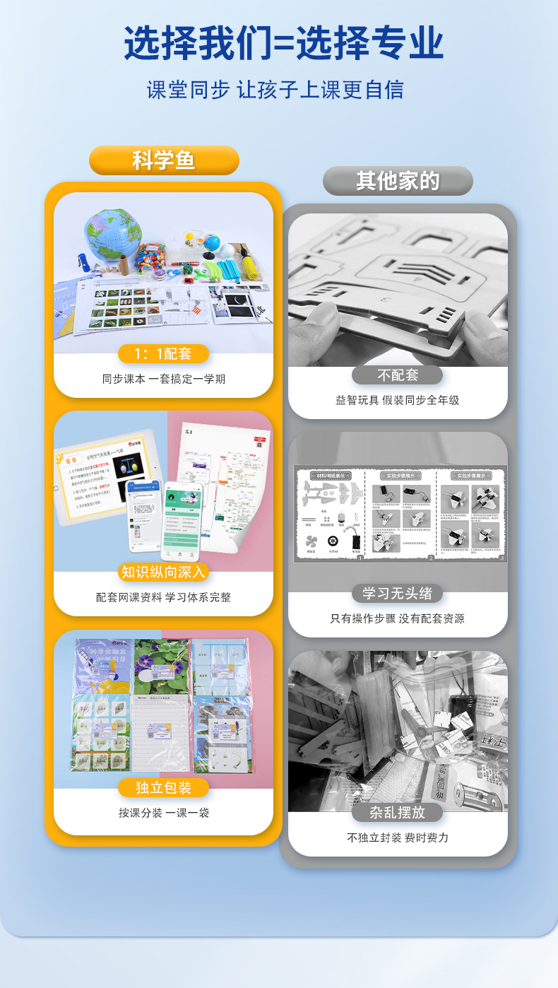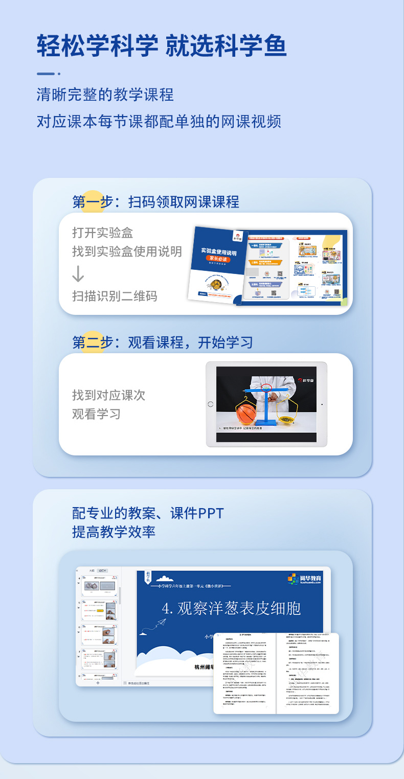 1、盒内的使用说明上有网课兑换码,扫码领取后即可观看网课。如果购买的是复习版套餐,上册复习网课的兑换码贴在实验盒上,下册贴在科学秘籍封面上。复习版还可在课程页面上再下载电子试卷。