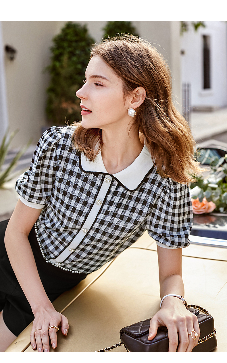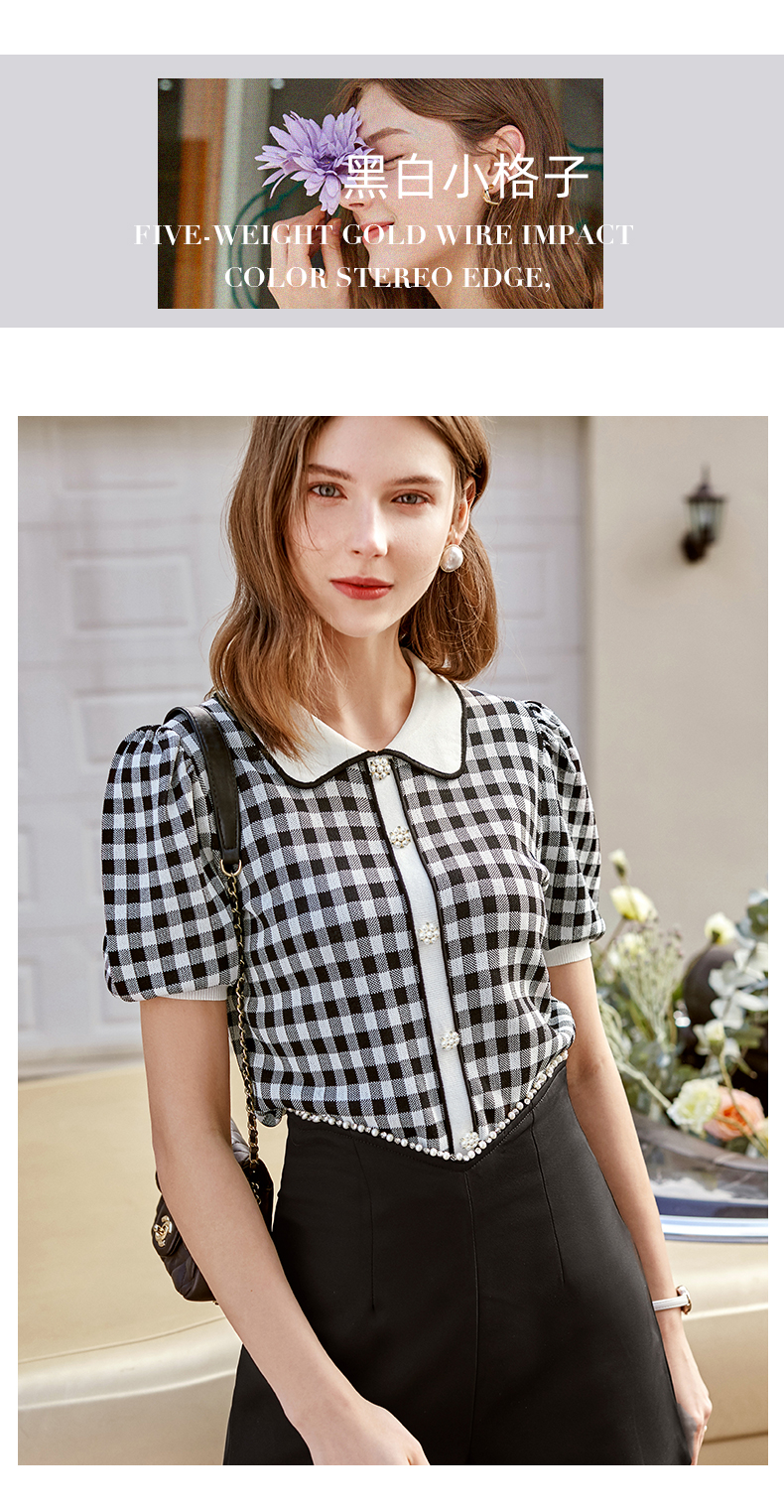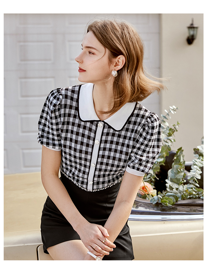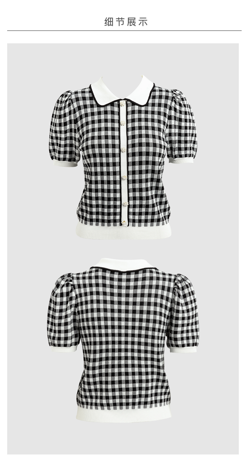 欧芮儿娃娃领针织衫女2021春夏新款复古格子洋气泡泡袖短袖上衣