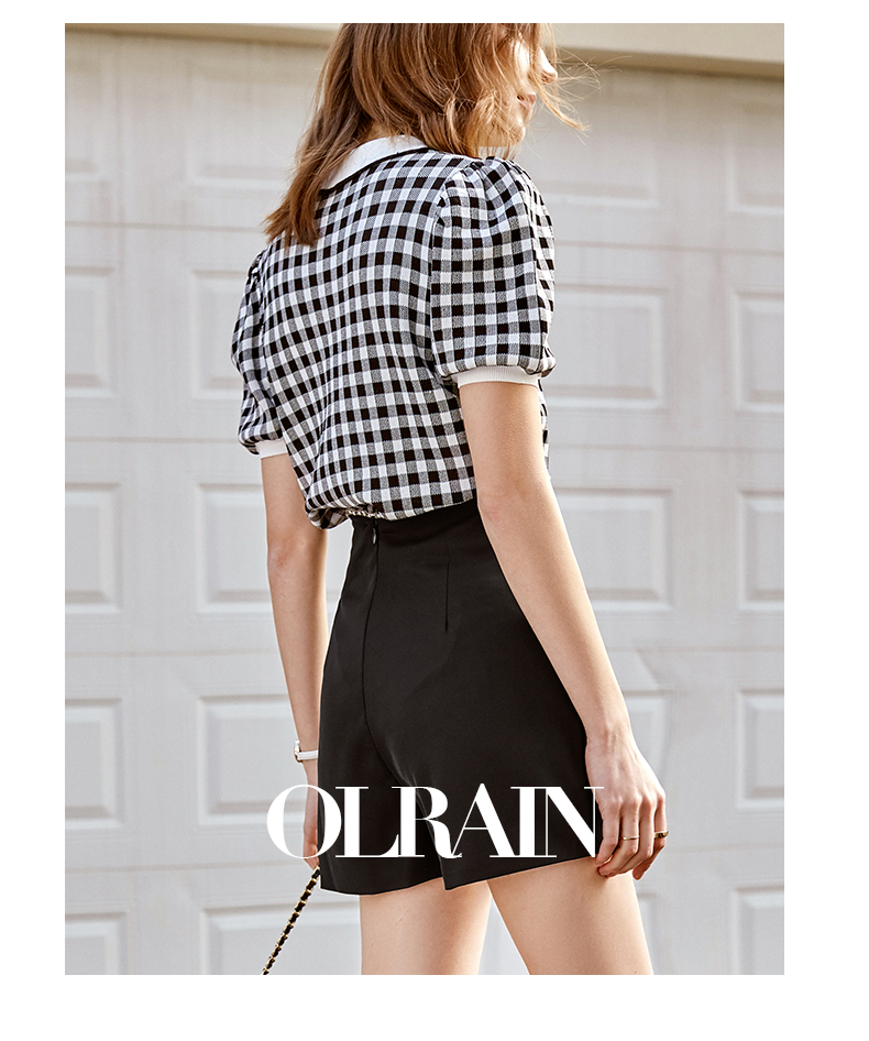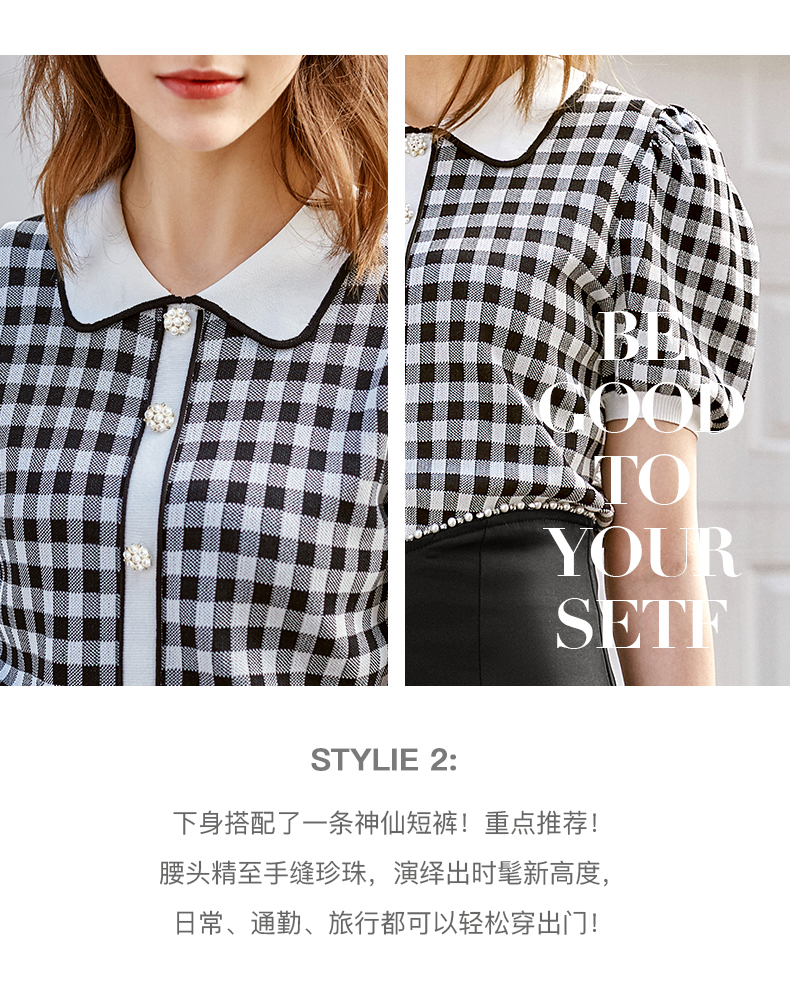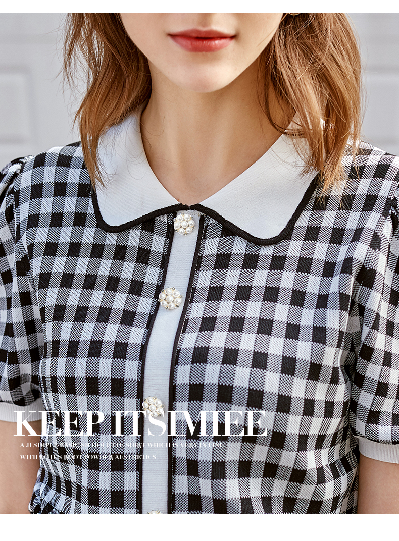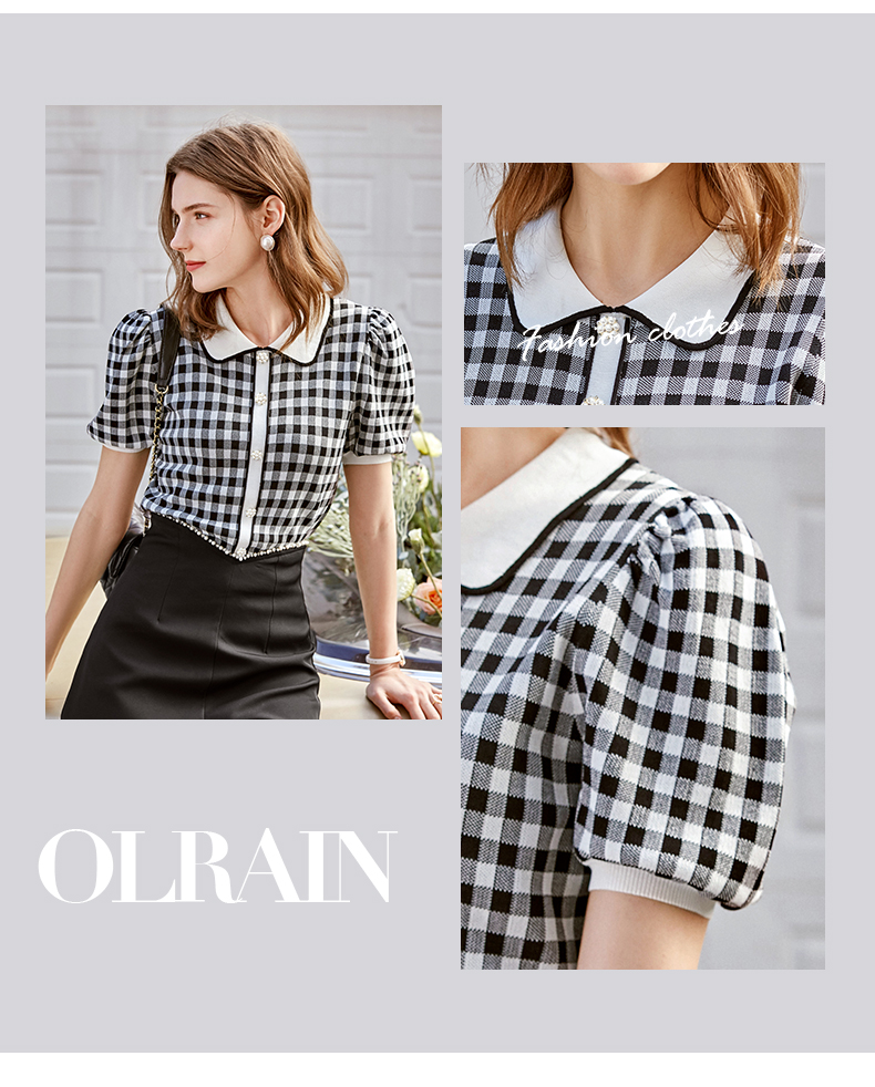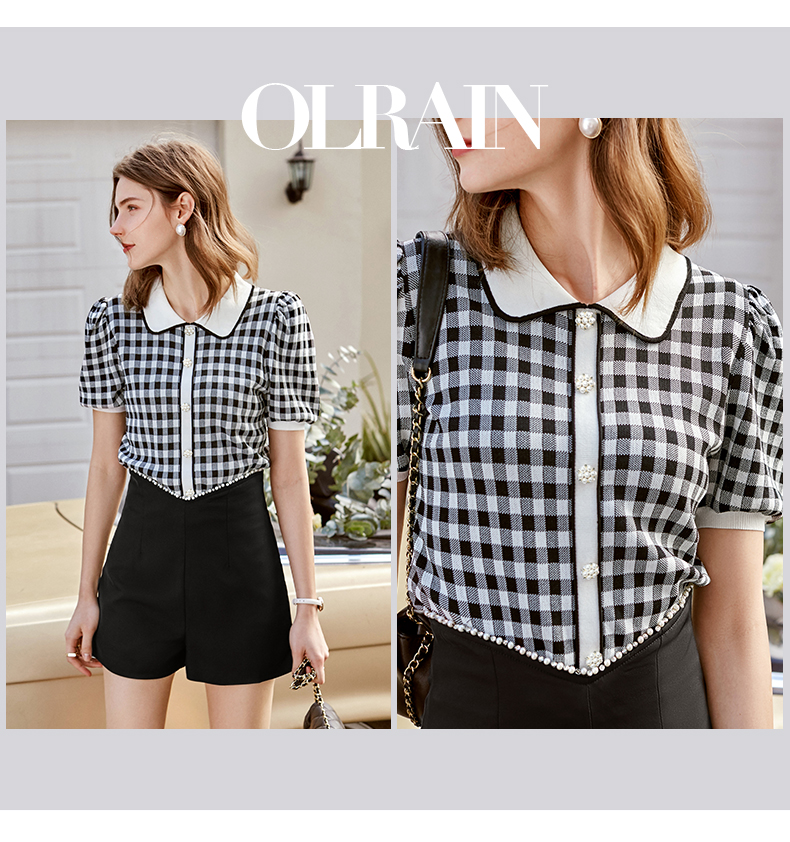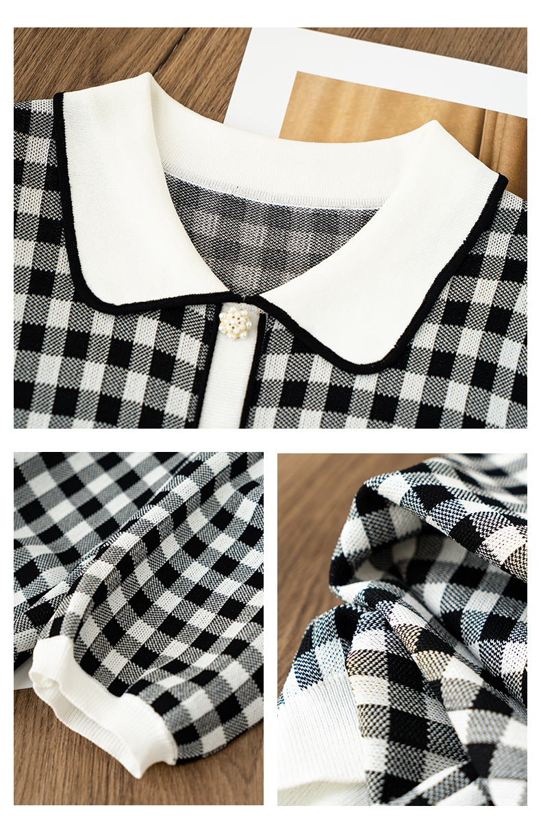 欧芮儿娃娃领针织衫女2021春夏新款复古格子洋气泡泡袖短袖上衣
