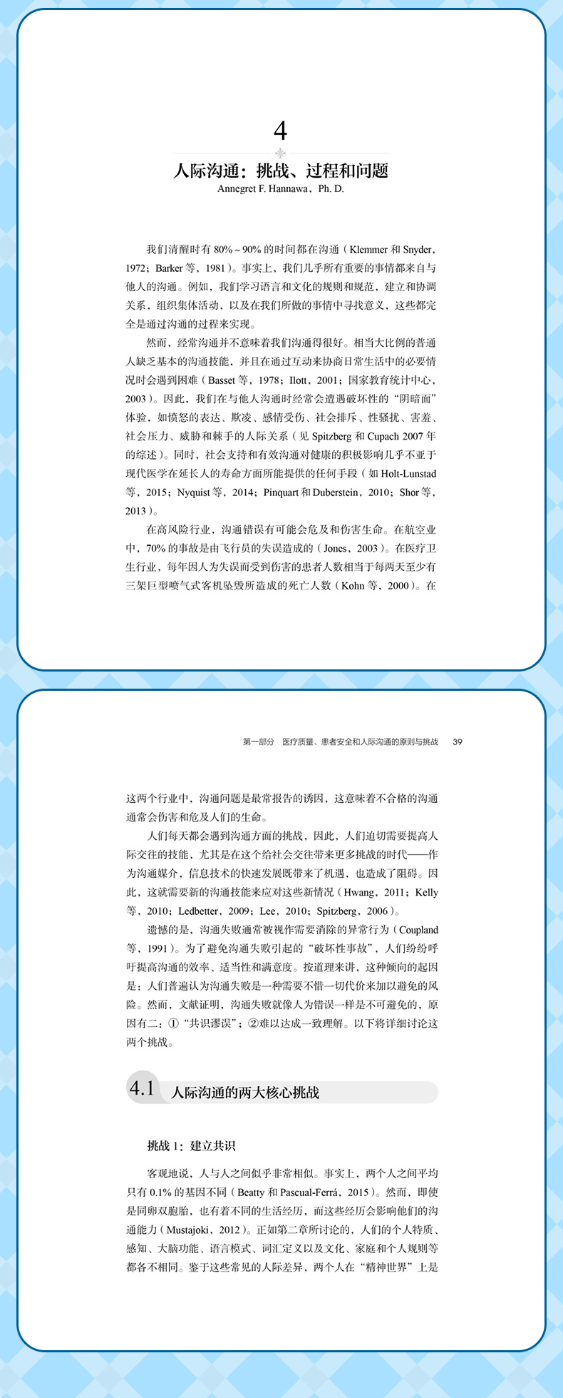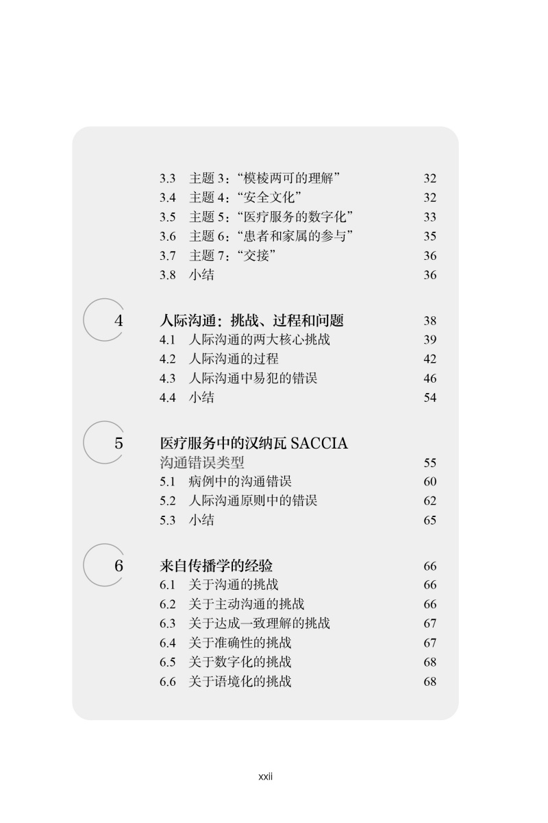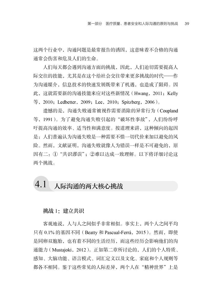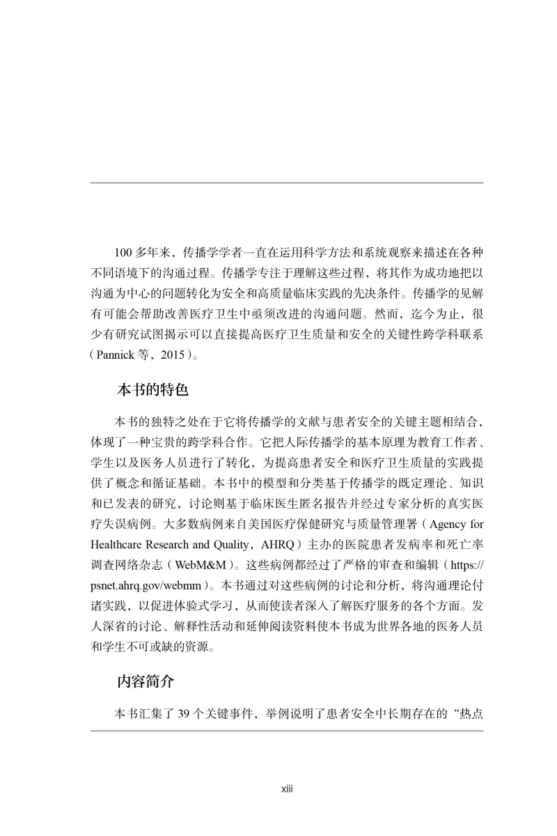 本书将传播学的文献与患者安全的关键主题相结合,体现了一种宝贵的跨学科合作,它把人际传播学的基本原理为教育工作者、学生以及医务工作者进行了转化,为提高患者安全和医疗保健质量的实践提供了概念和循证基础。本书包括两部分,第一部分包含六章,重点介绍与医疗质量、患者安全和人际沟通相关的核心原则和挑战。第二部分包含了39个病例。这些病例是按照病史采集、诊断、治疗计划、存储、治疗实施治疗后护理这六个“时间线”排列的。每个阶段都包含六层沟通,包括从微观、中观到宏观层面的互动。本书通过对这些病例的讨论和分析,将沟通理论付诸实践,以促进体验式学习,从而使读者深入了解医疗服务的各个方面。发人深省的讨论、解释性活动和延申阅读的参考资料使本书成为世界各地医务人员和学生不可或缺的资源。