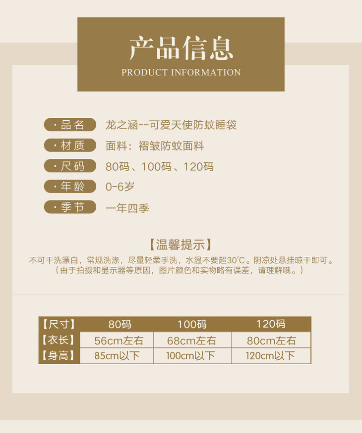 龙之涵夏季艾叶防蚊纱布背心睡袋6色可选可爱清新纱布背心