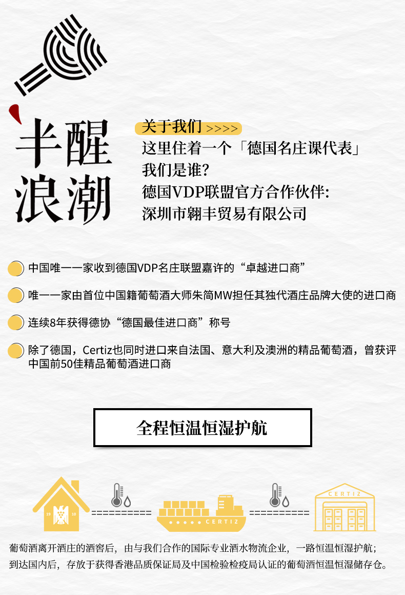 - 半醒哲学专营德国VDP名庄精品酒;VDP是全德国成员只有不到200家的顶级葡萄酒联盟,是德国顶尖优质葡萄酒的标志性记号,也代表着德国葡萄酒的最高水平。