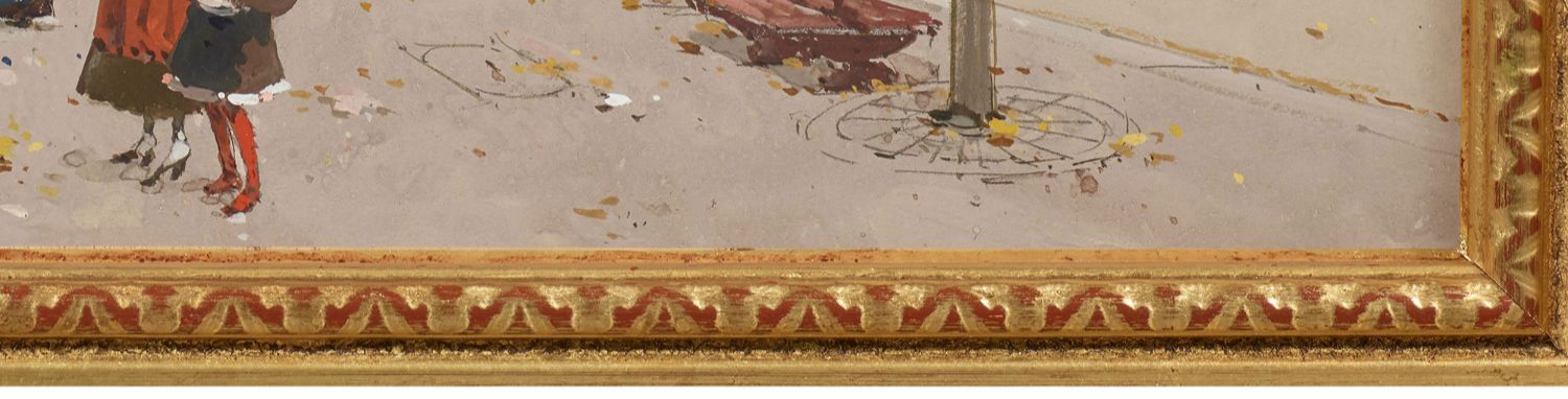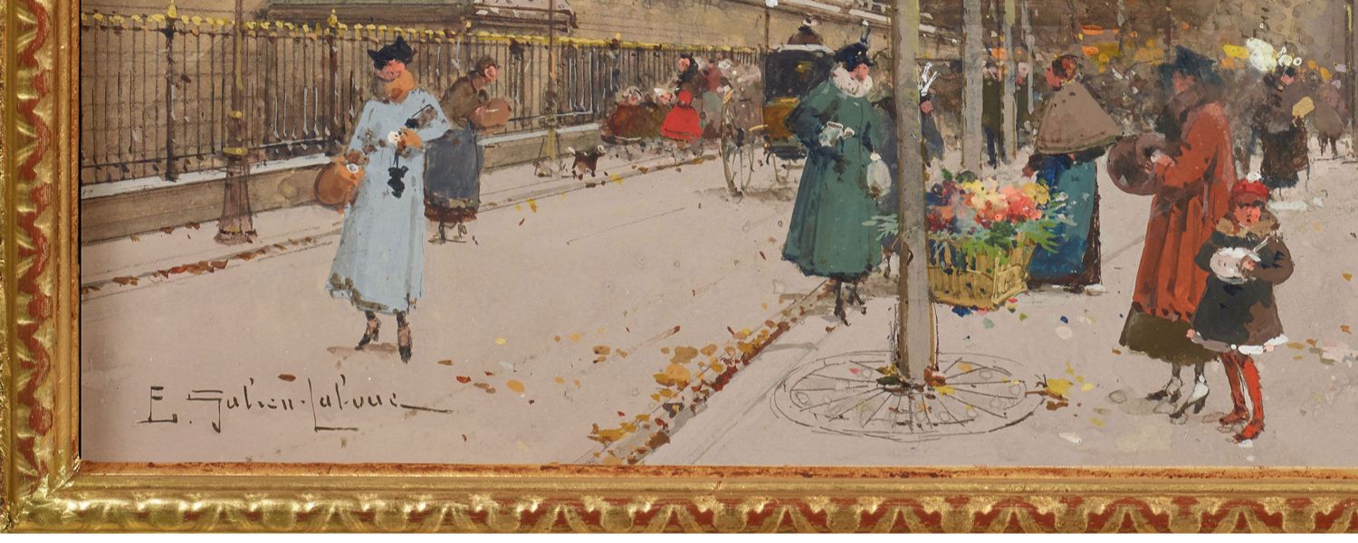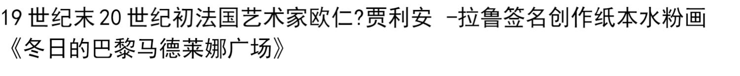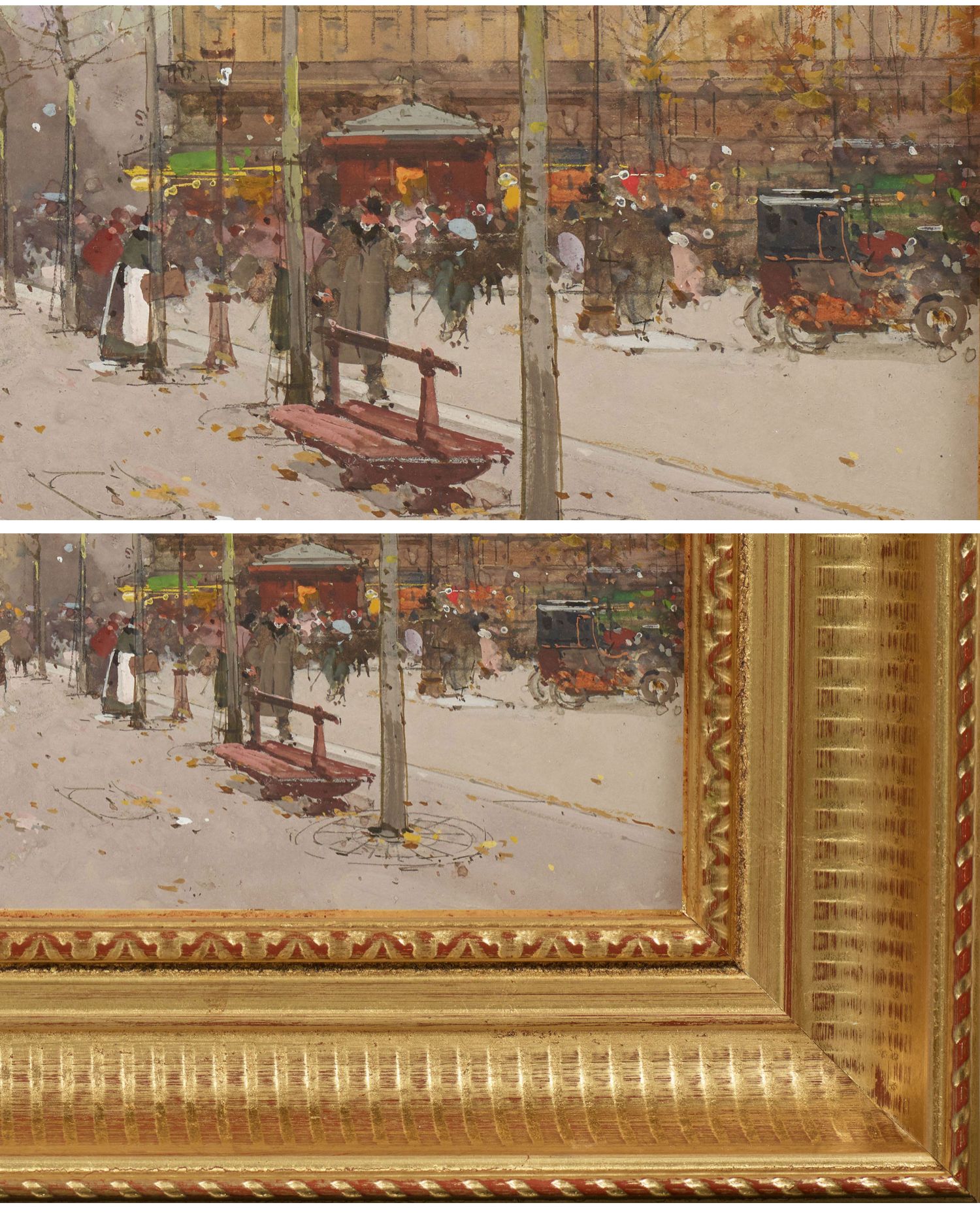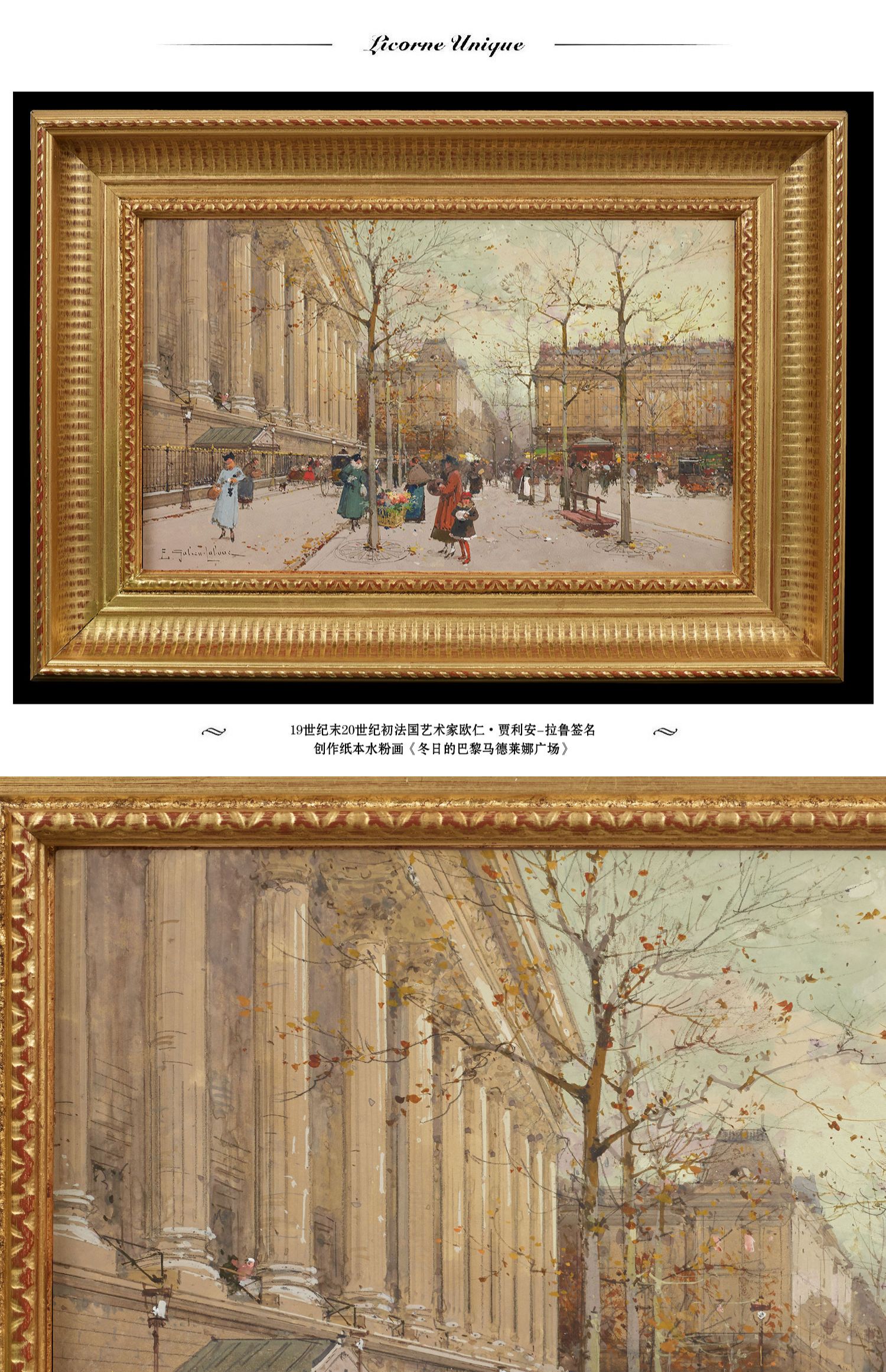 独角鹿西洋古董法国艺术家签名水粉画《冬日的巴黎马德莱娜广场》